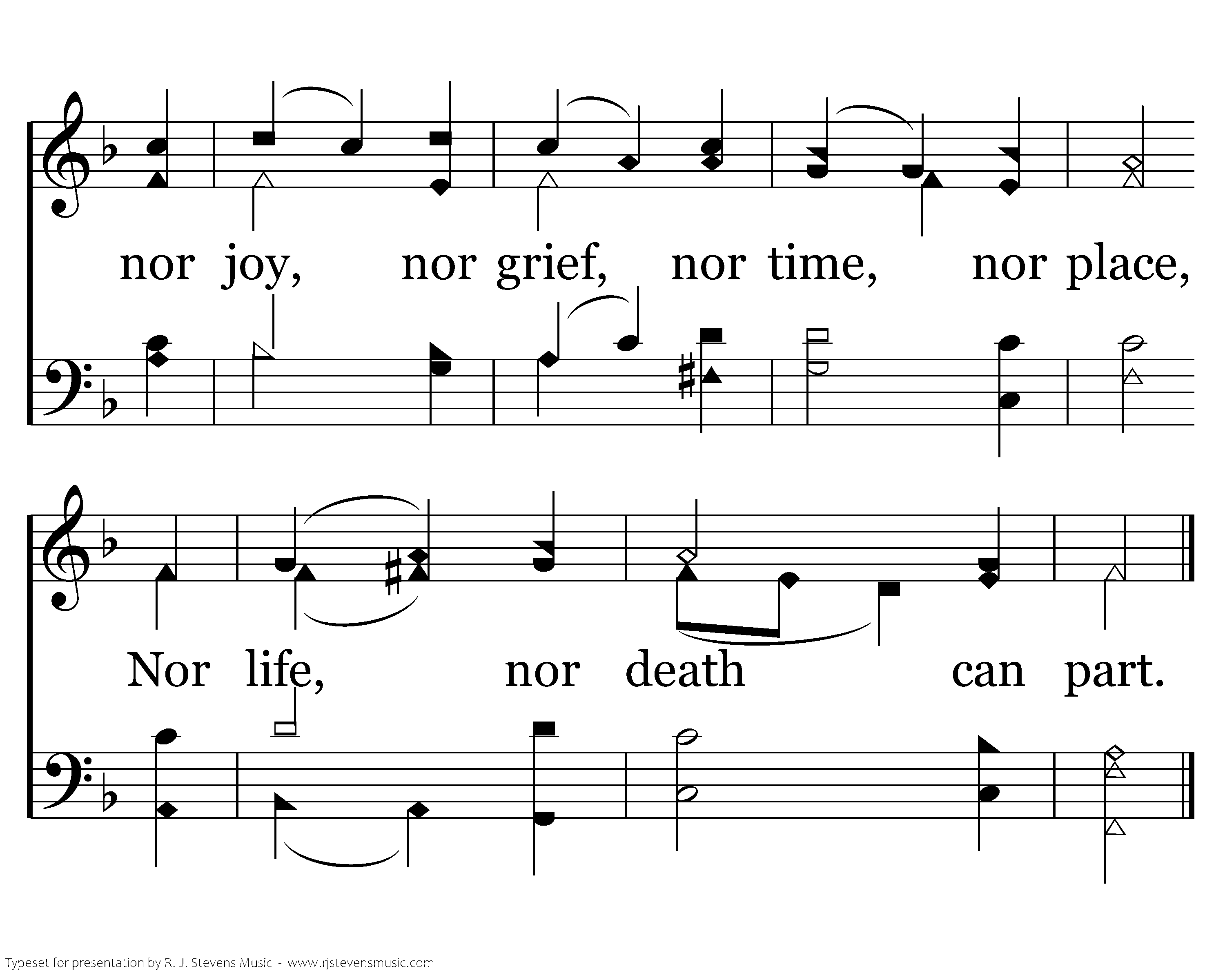 Partakers of the Savior's grace, The same in mind and heart, nor joy, nor grief, nor time, nor place, Nor life, nor death can part.