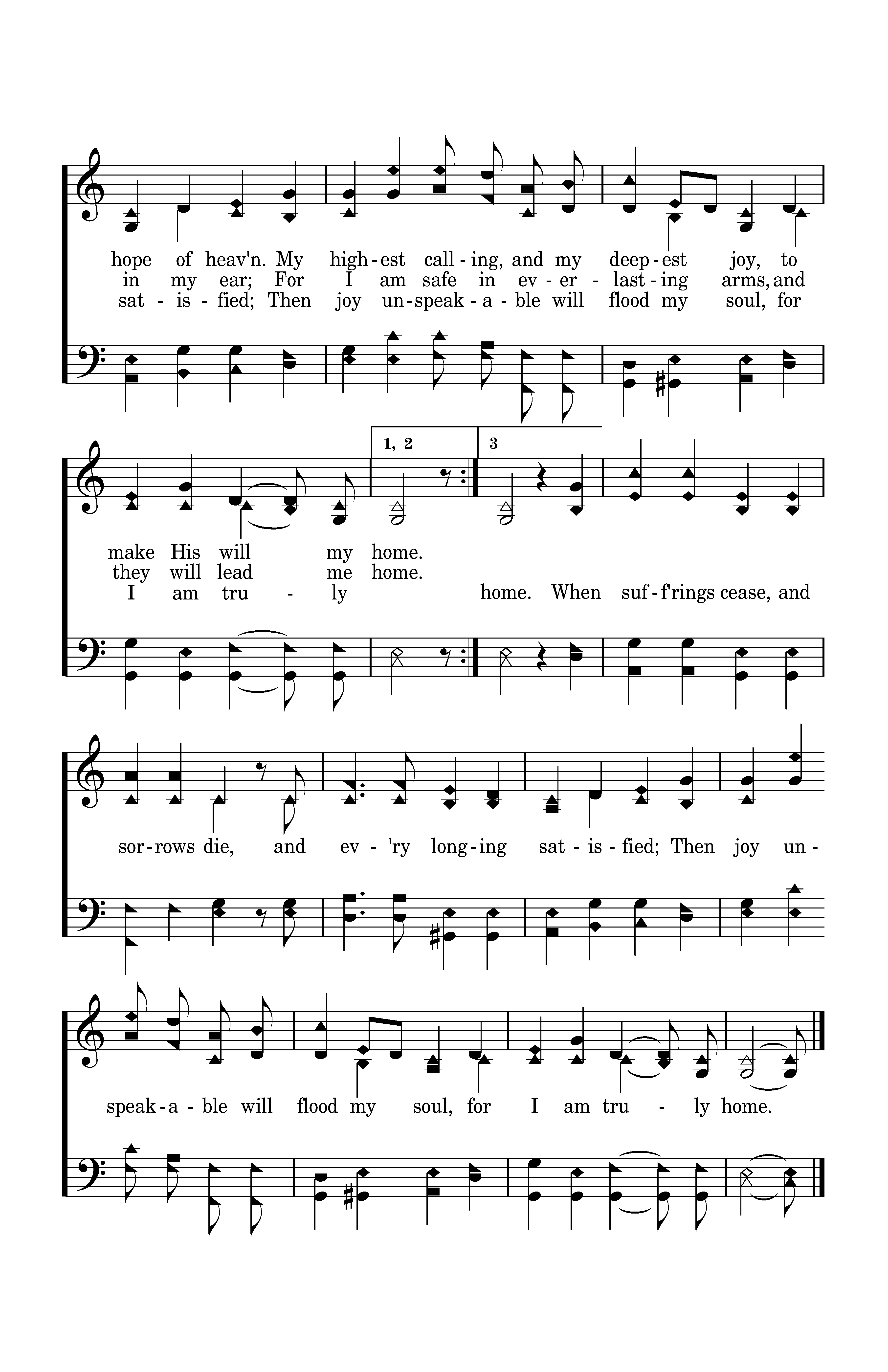 There is a hope that lifts my weary head; A consolation, strong against despair that when the world has plunged me in its deepest pit, I find the Savior there. Thru present suff'rings, future's fear, He whispers courage in my ear; For I am safe in everlasting arms, and they will lead me home.