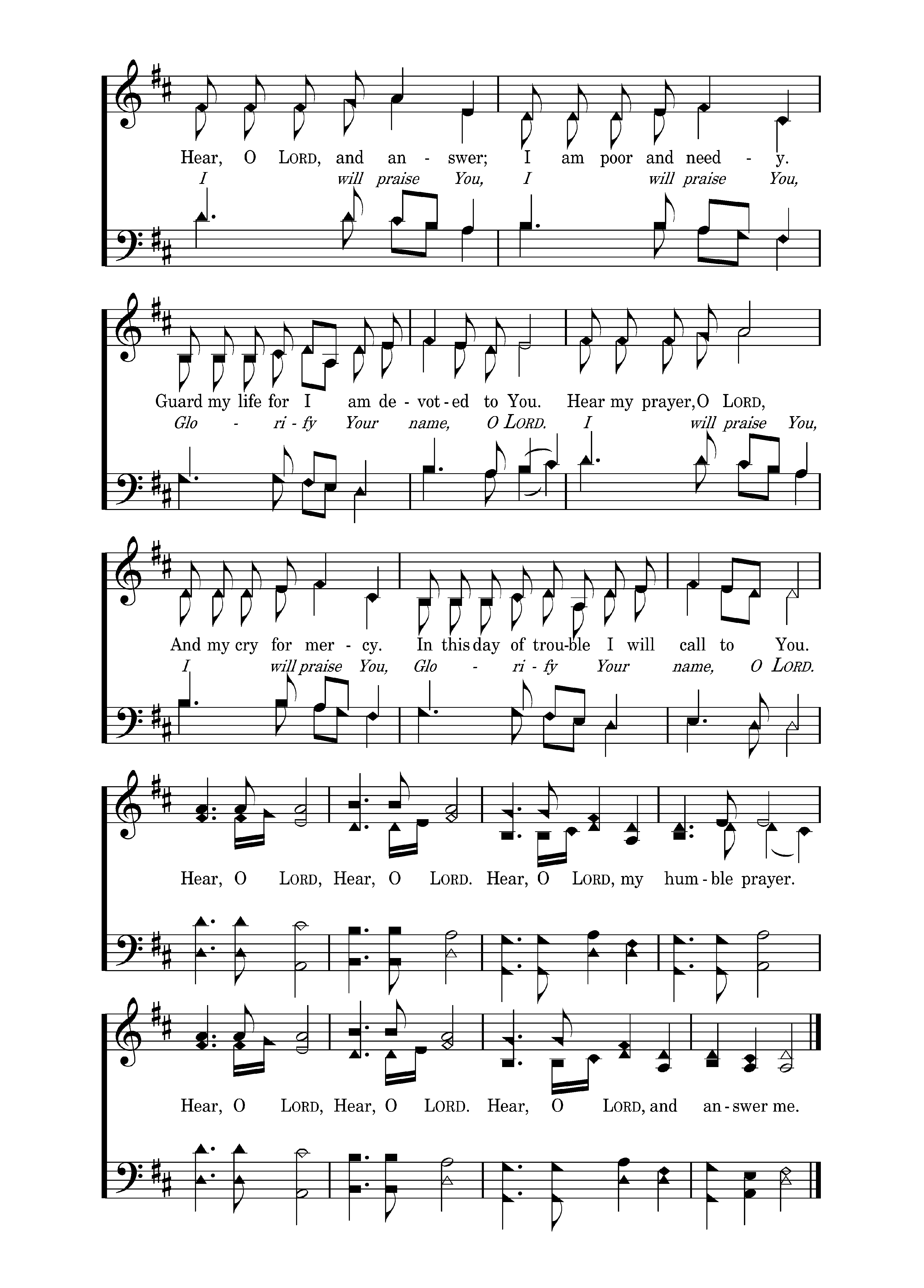 Hear, O LORD, and answer; I am poor and needy. Guard my life for I am devoted to You. Hear my prayer, O LORD, And my cry for mercy. In this day of trouble I will call to You. Hear, O LORD; answer my prayer. Guard my life for I am Yours. Hear my prayer, LORD, and my cry! In trouble I will call to You. I will praise You, I will praise You, Glorify Your name, O LORD. I will praise You, I will praise You, Glorify Your name, O LORD. Hear, O LORD, and answer; I am poor and needy. Guard my life for I am devoted to You. Hear my prayer, O LORD, And my cry for mercy. In this day of trouble I will call to You. Hear, O LORD, Hear, O LORD. Hear, O LORD, my humble prayer. Hear, O LORD, Hear, O LORD. Hear, O LORD, and answer me.