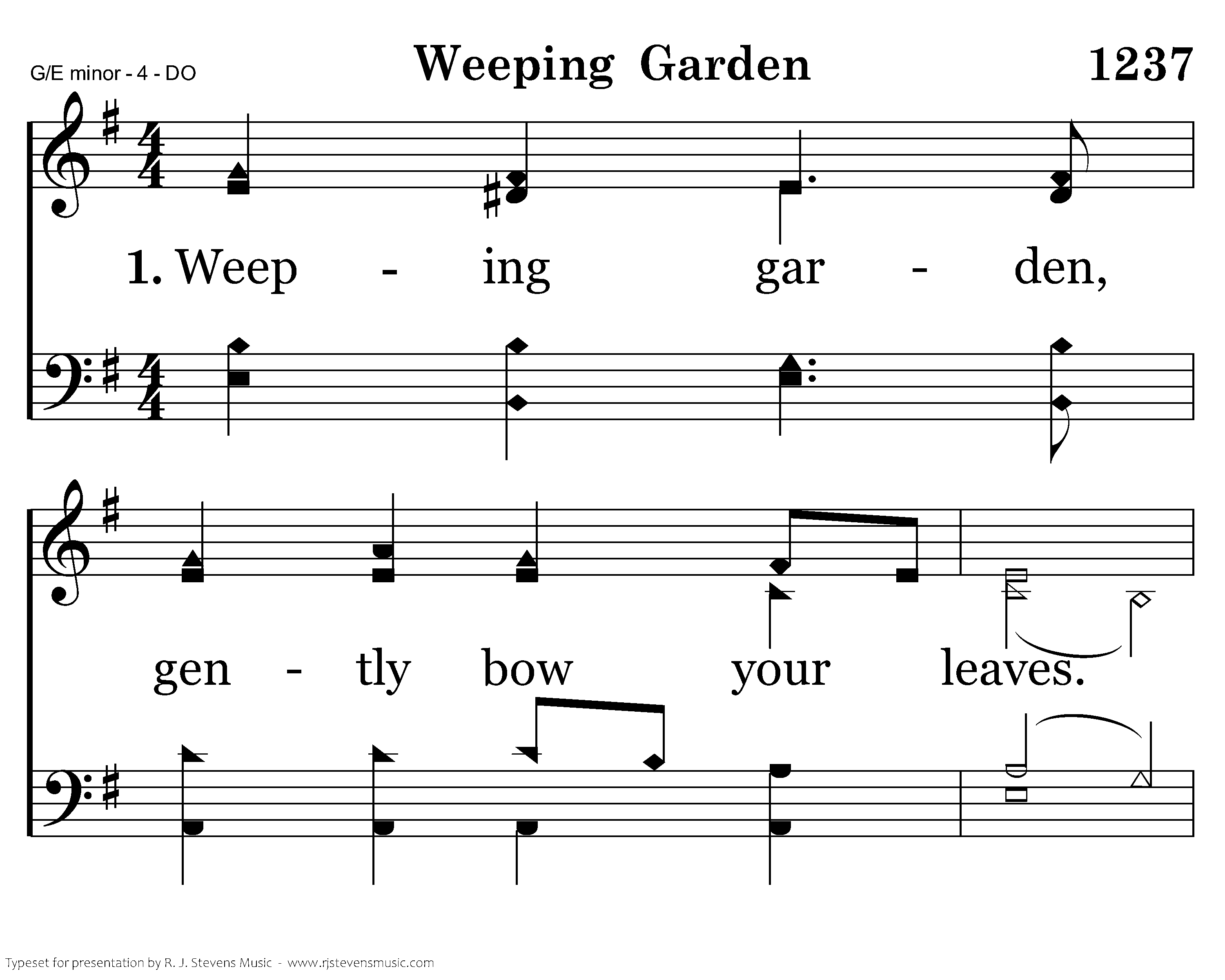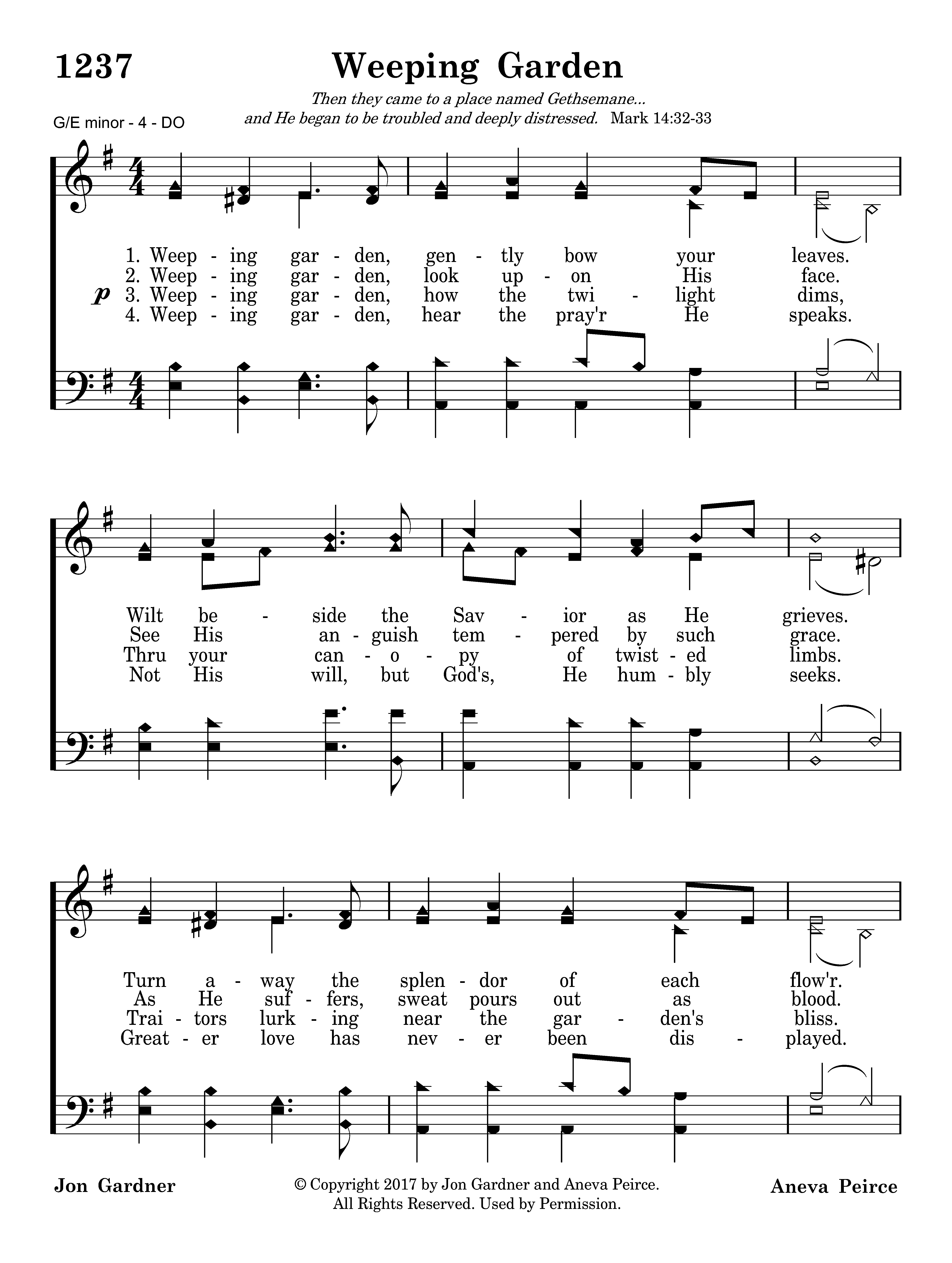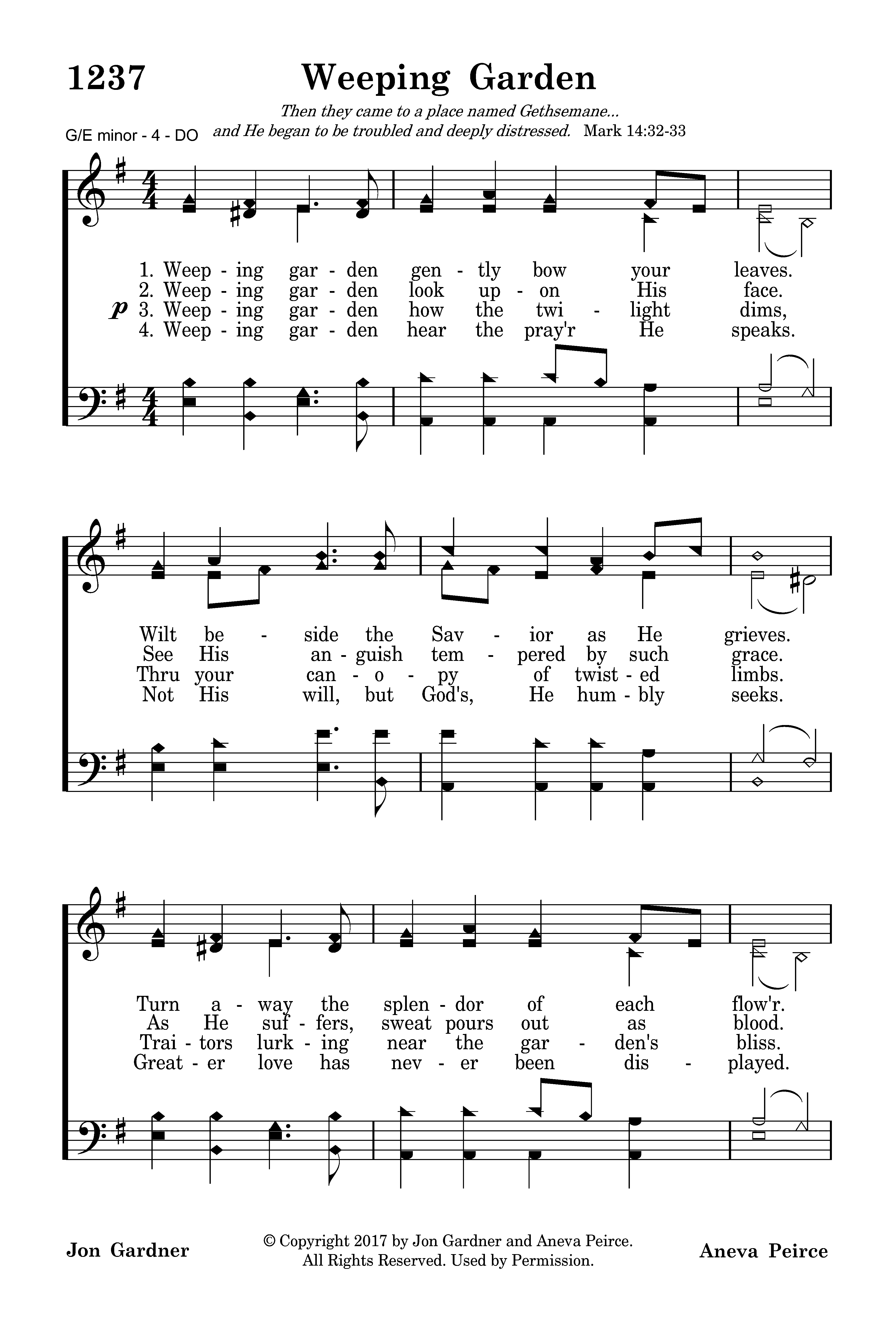 Weeping garden gently bow your leaves. Wilt beside the Savior as He grieves. Turn away the splendor of each flow'r. Hush the birds in this, His desp'rate hour.
