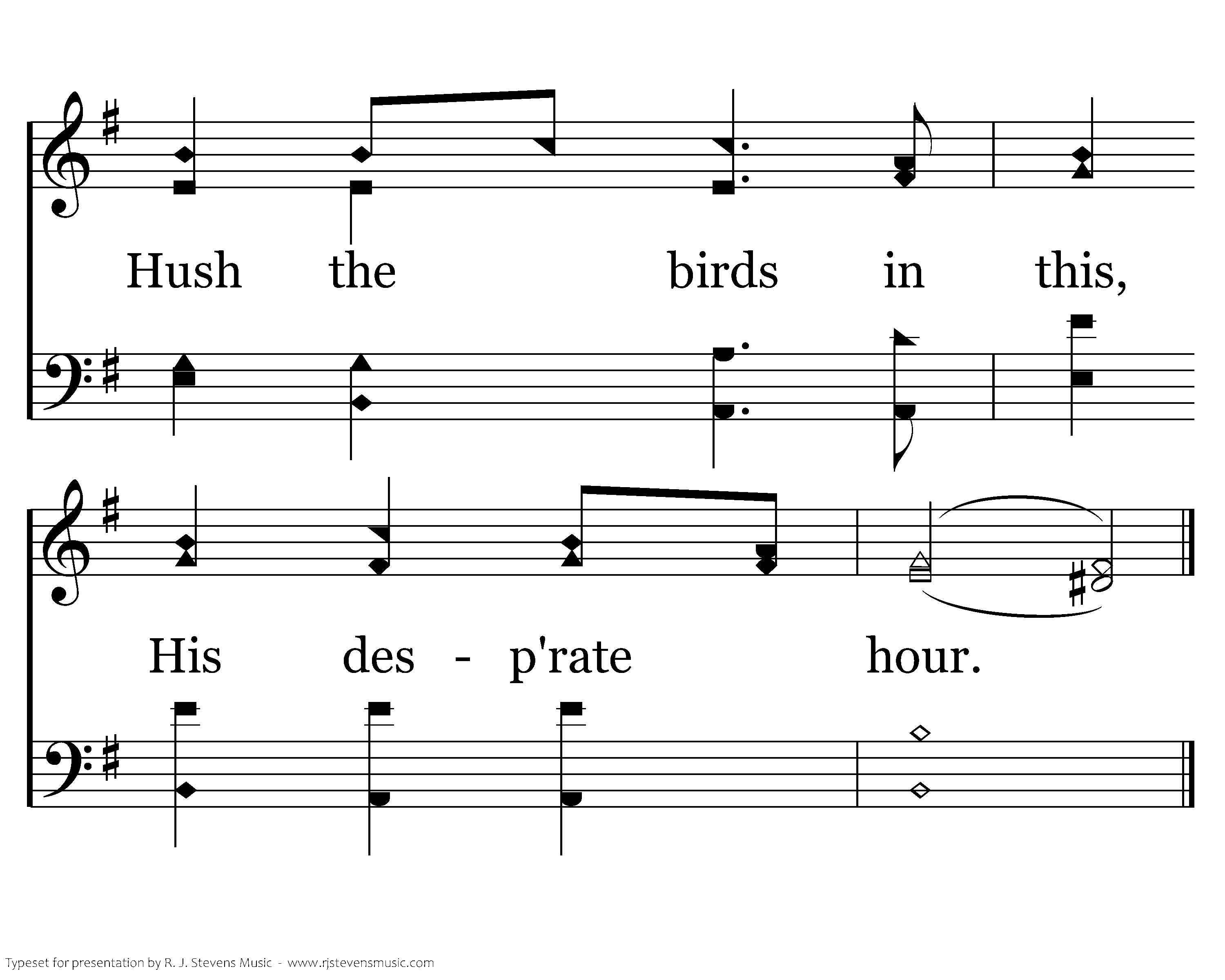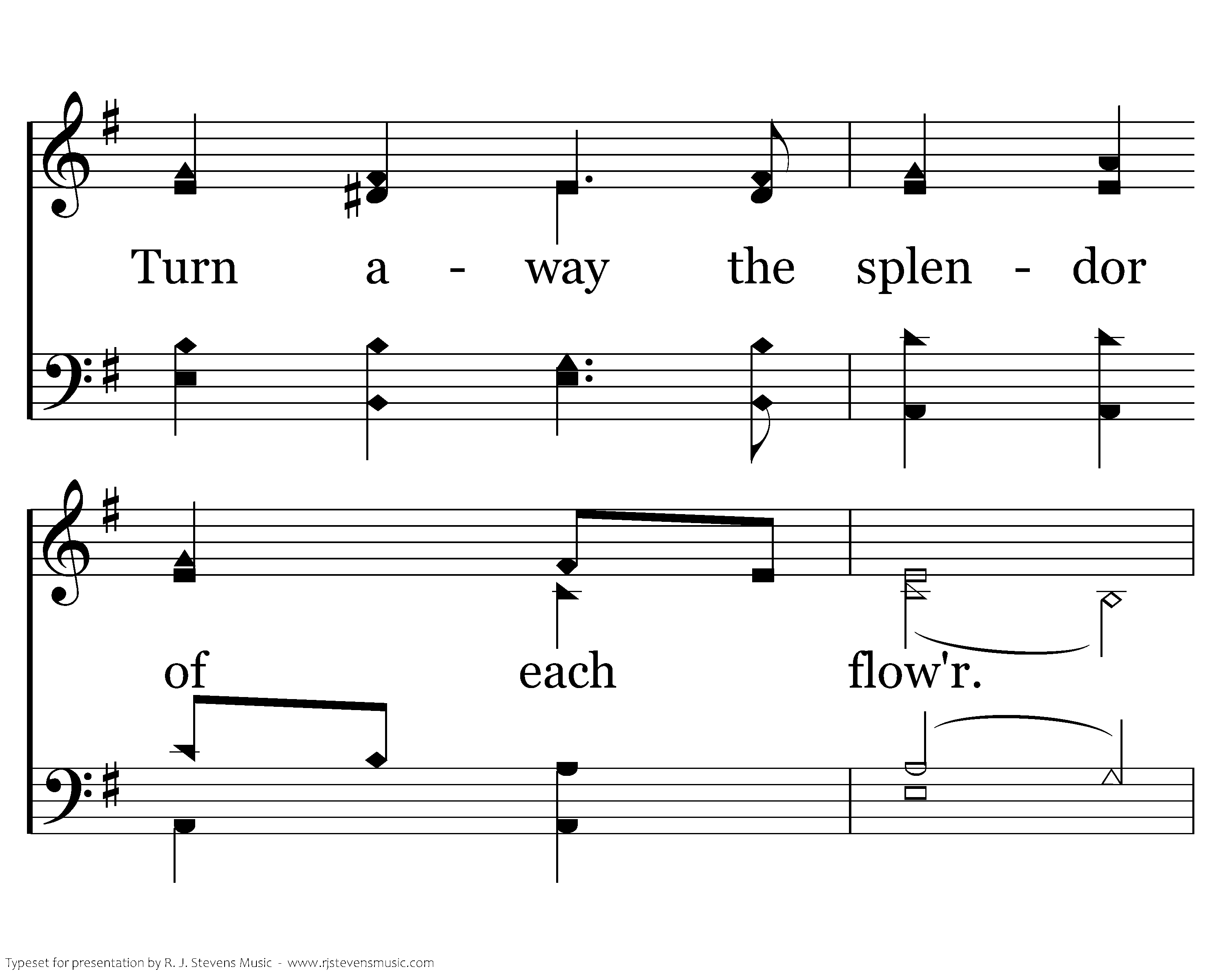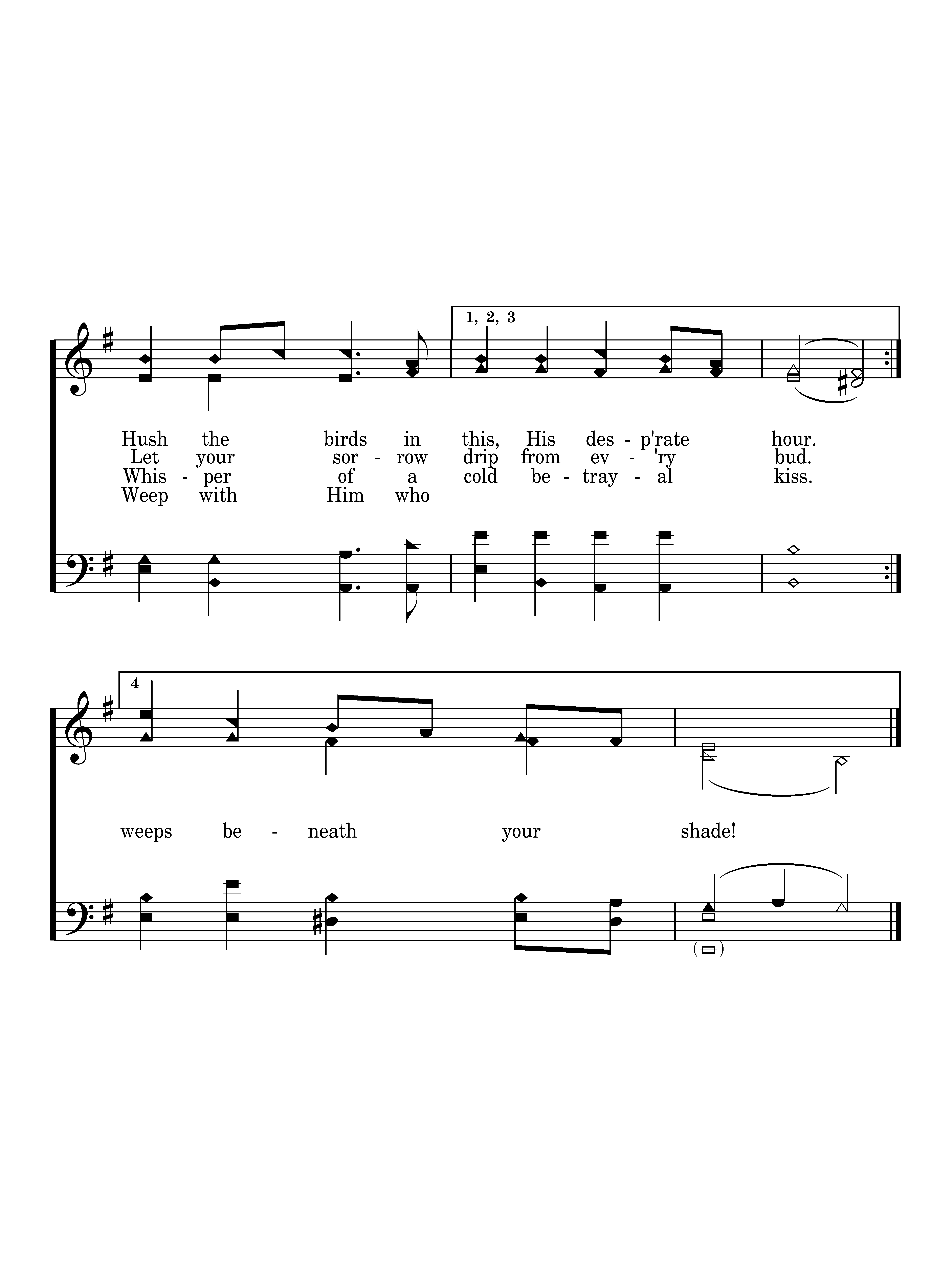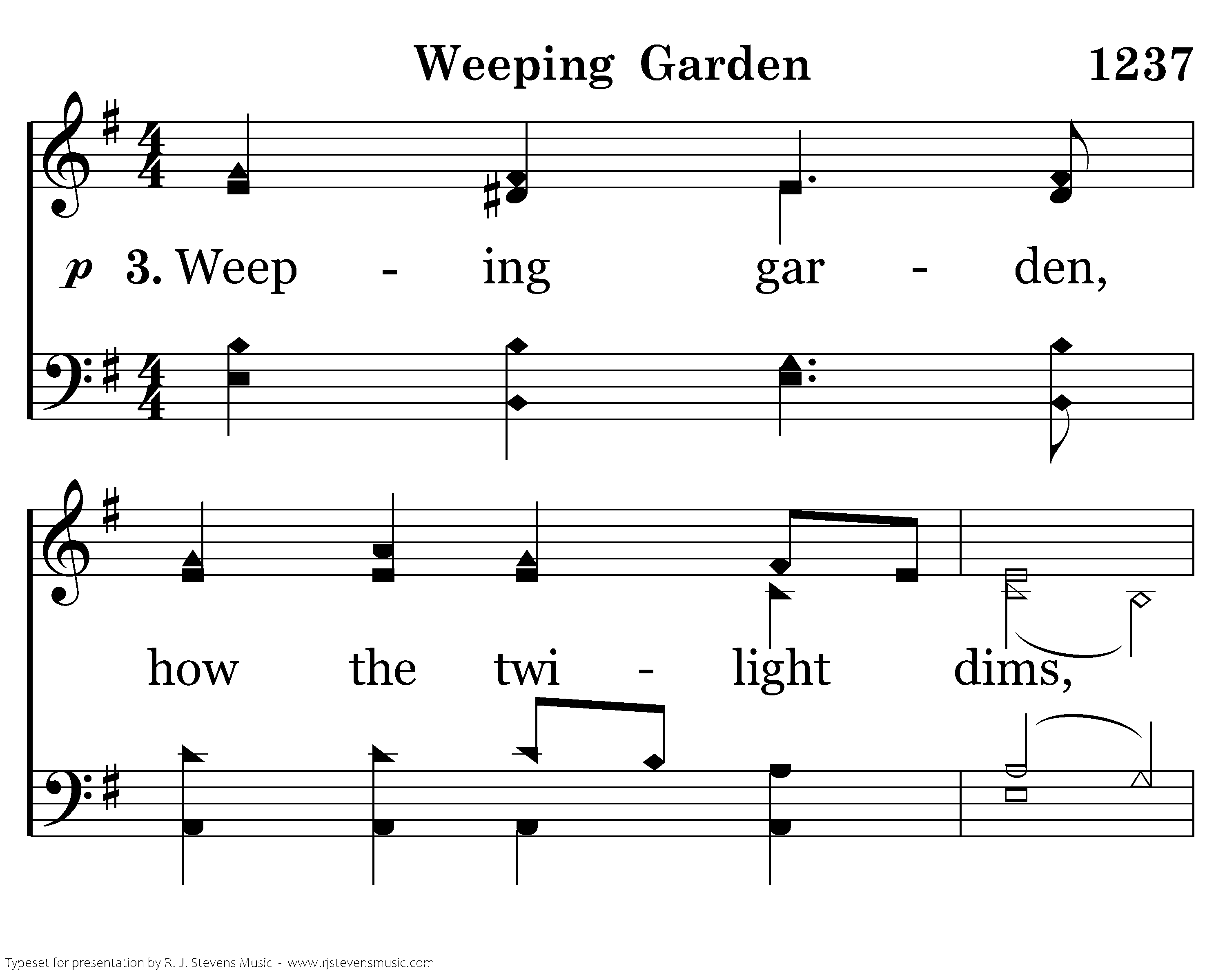 Weeping garden gently bow your leaves. Wilt beside the Savior as He grieves. Turn away the splendor of each flow'r. Hush the birds in this, His desp'rate hour.