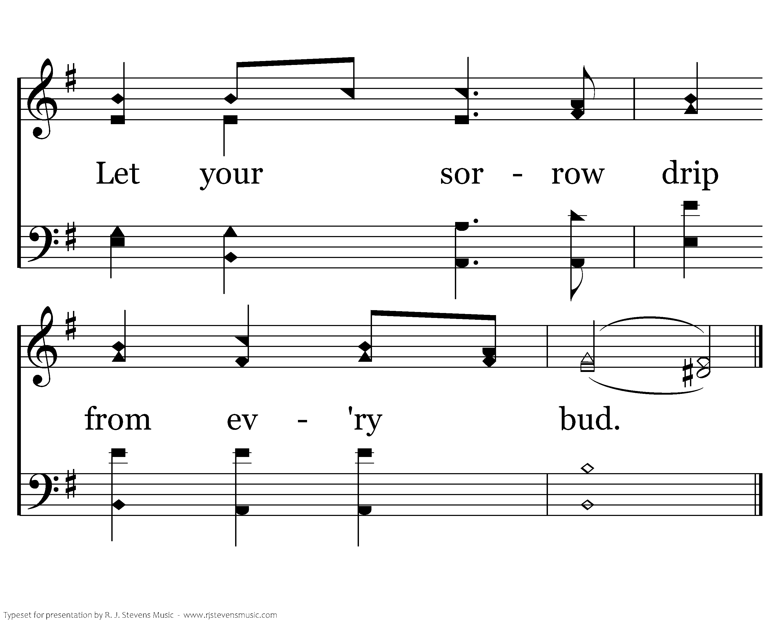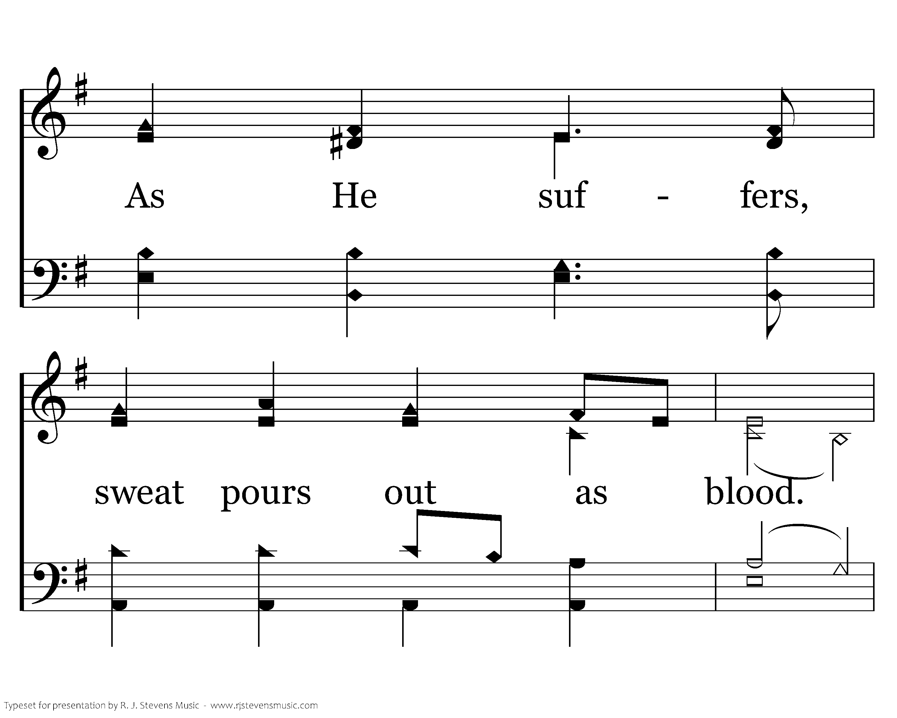 Weeping garden look upon His face. See His anguish tempered by such grace. As He suffers, sweat pours out as blood. Let your sorrow drip from ev'ry bud.