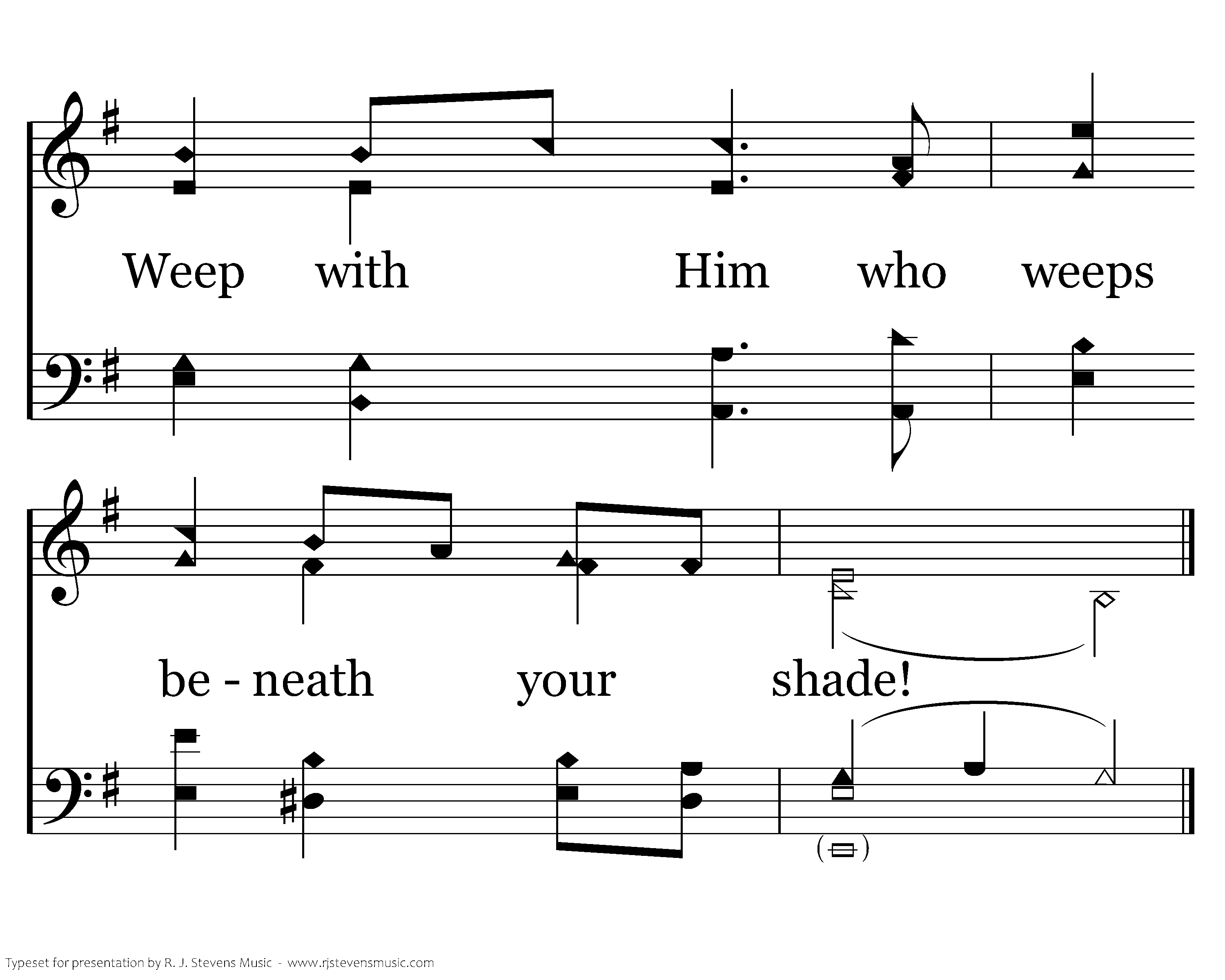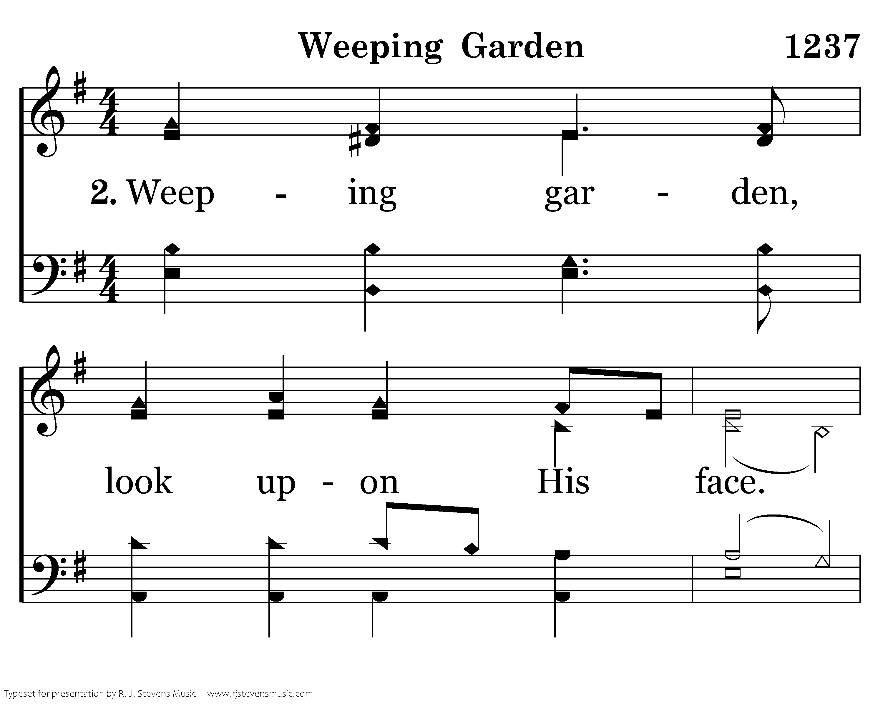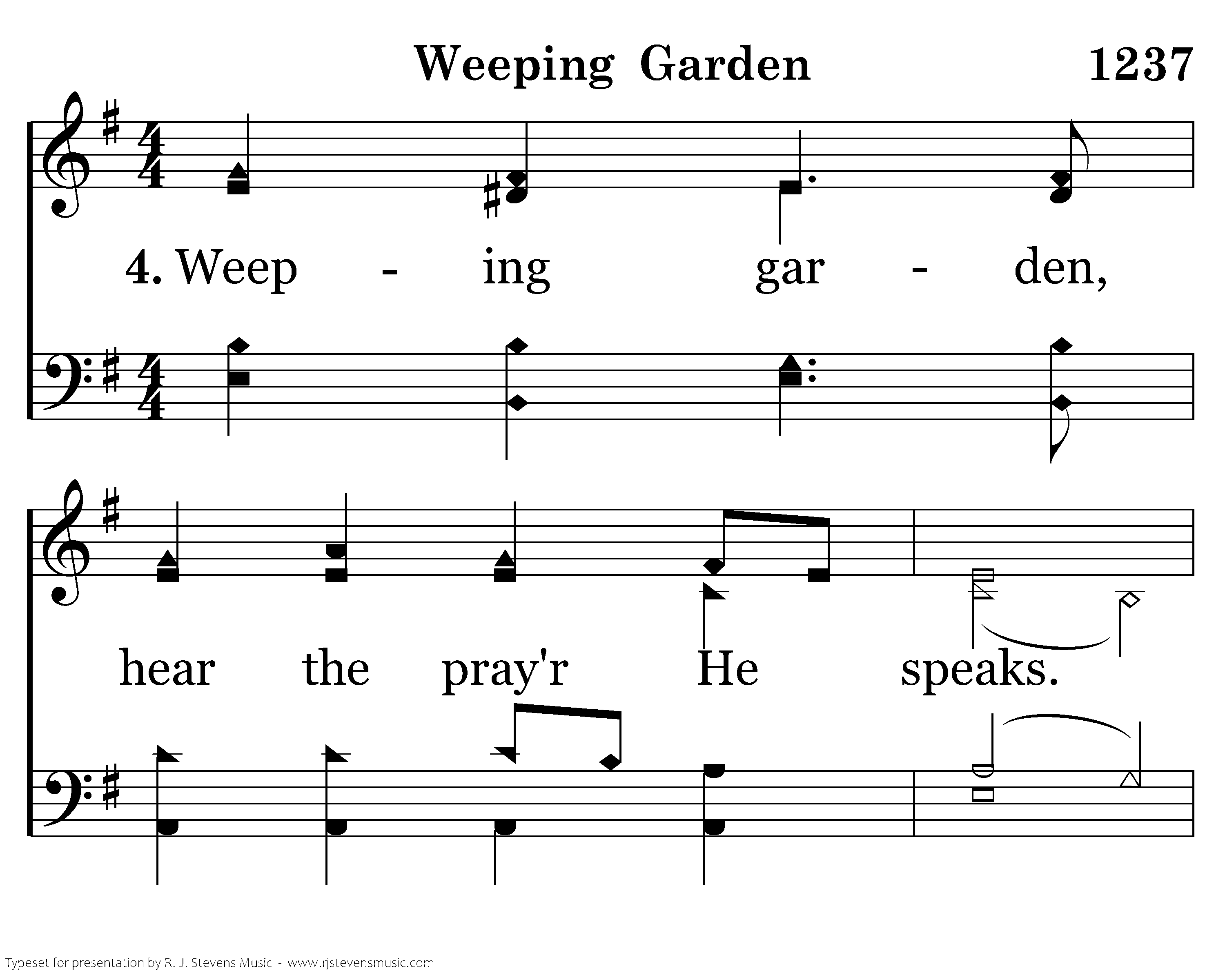 Weeping garden hear the pray'r He speaks. Not His will, but God's, He humbly seeks. Greater love has never been displayed. Weep with Him who weeps beneath your shade!