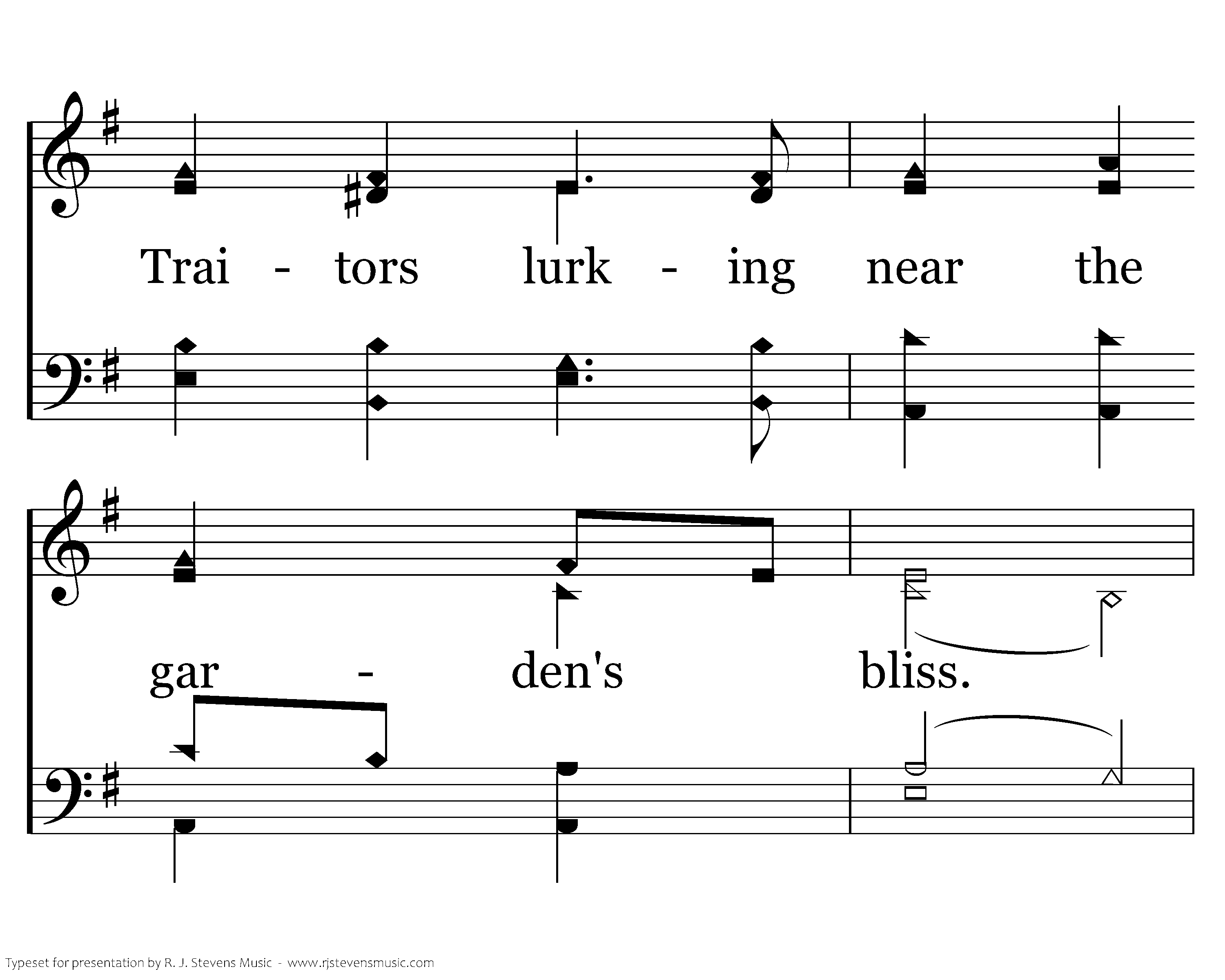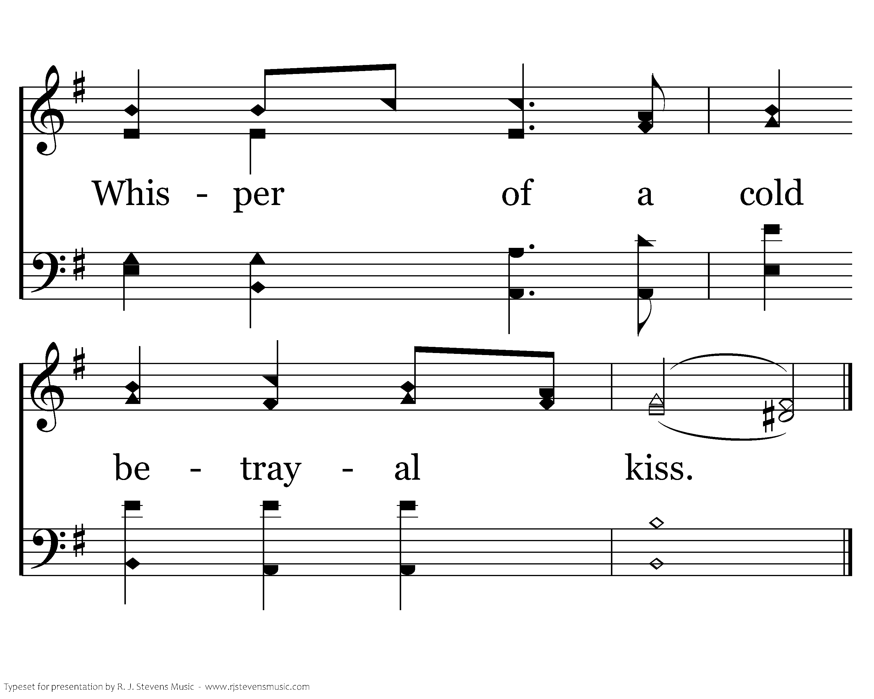 Weeping garden how the twilight dims, Thru your canopy of twisted limbs. Traitors lurking near the garden's bliss. Whisper of a cold betrayal kiss.