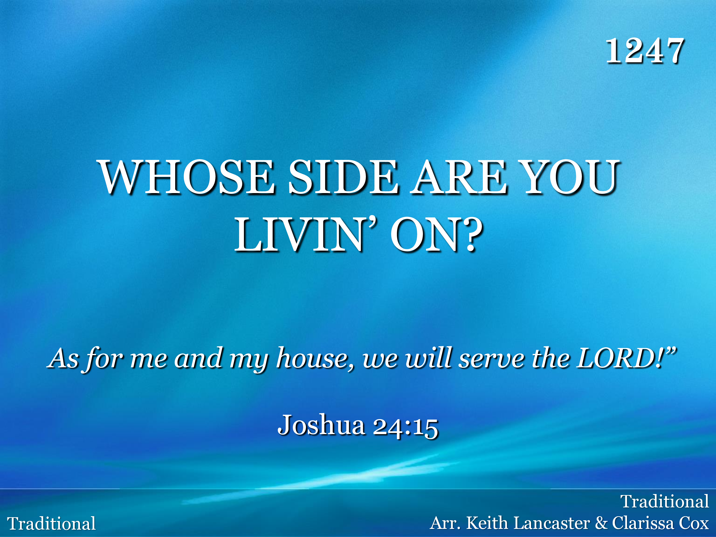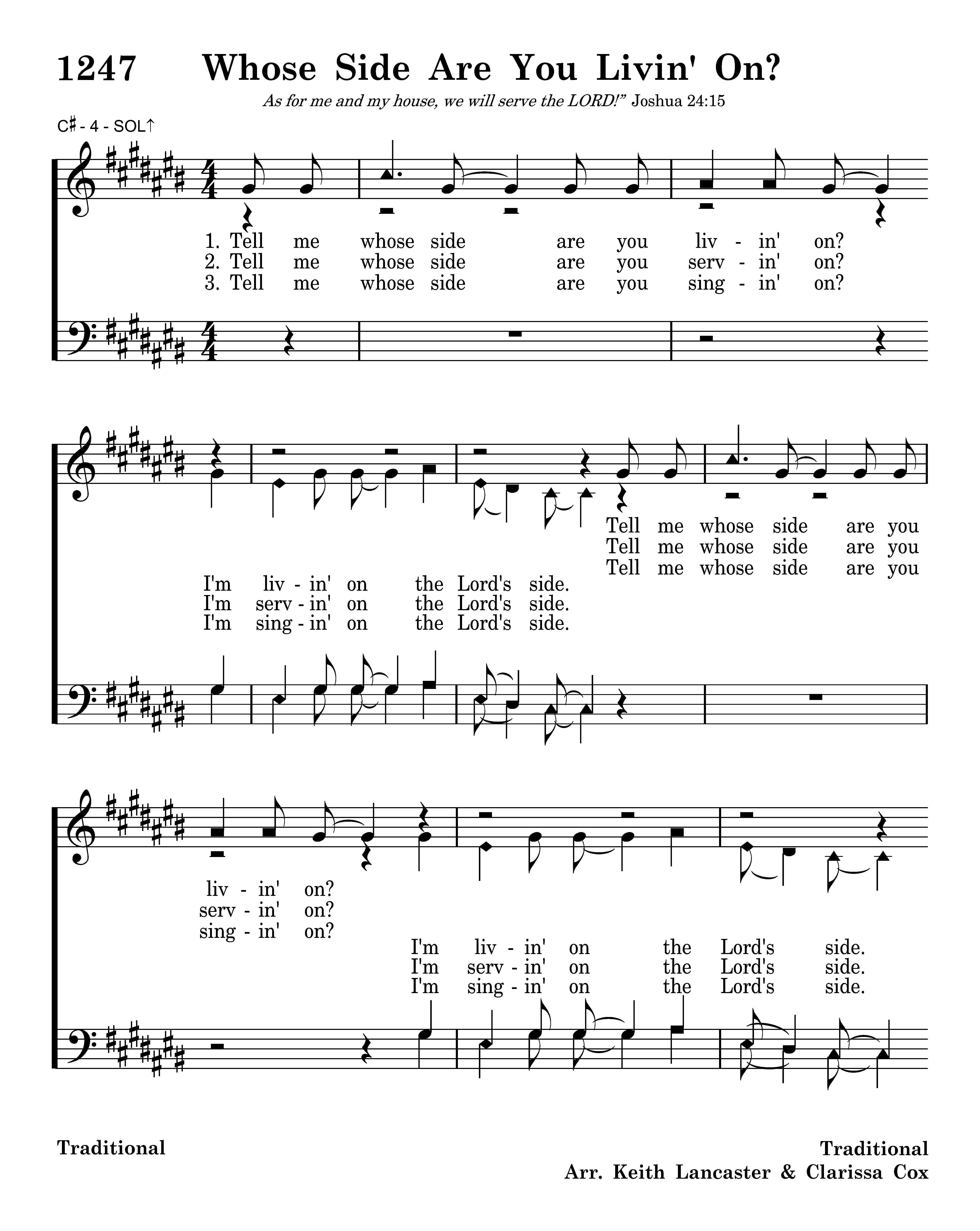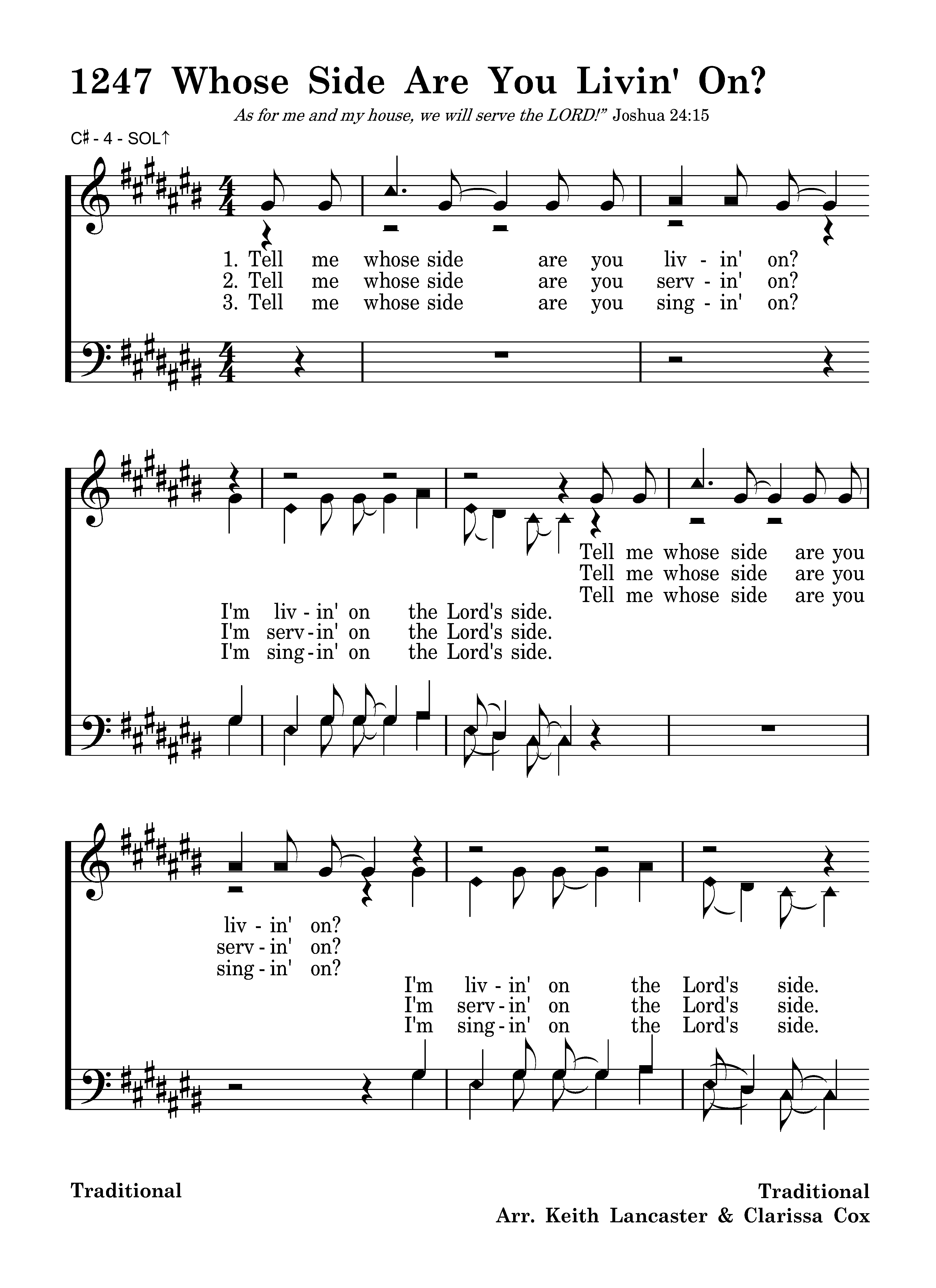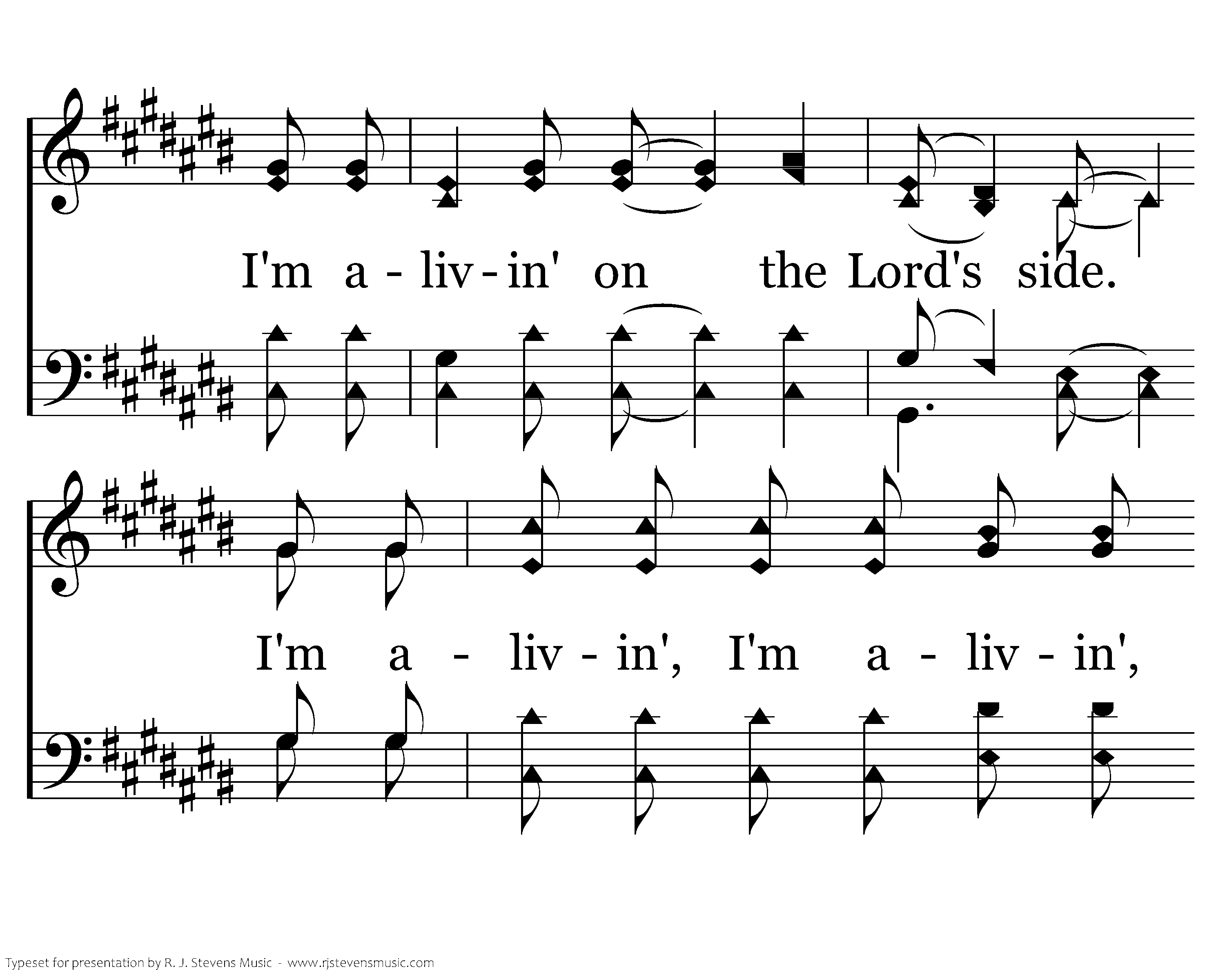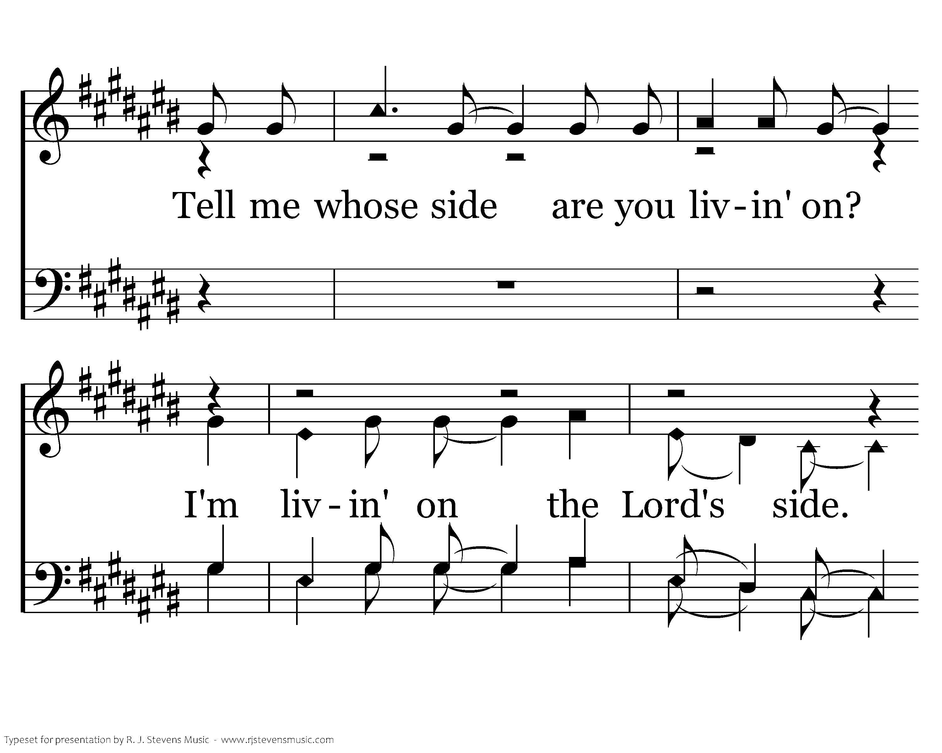 Tell me whose side are you livin' on? Tell me whose side are you livin' on? I'm alivin', I'm alivin', I'm alivin', I'm alivin', I'm alivin' on the Lord's side. I'm alivin', I'm alivin', I'm alivin', I'm alivin', I'm alivin' on the Lord's side. Lord's side.