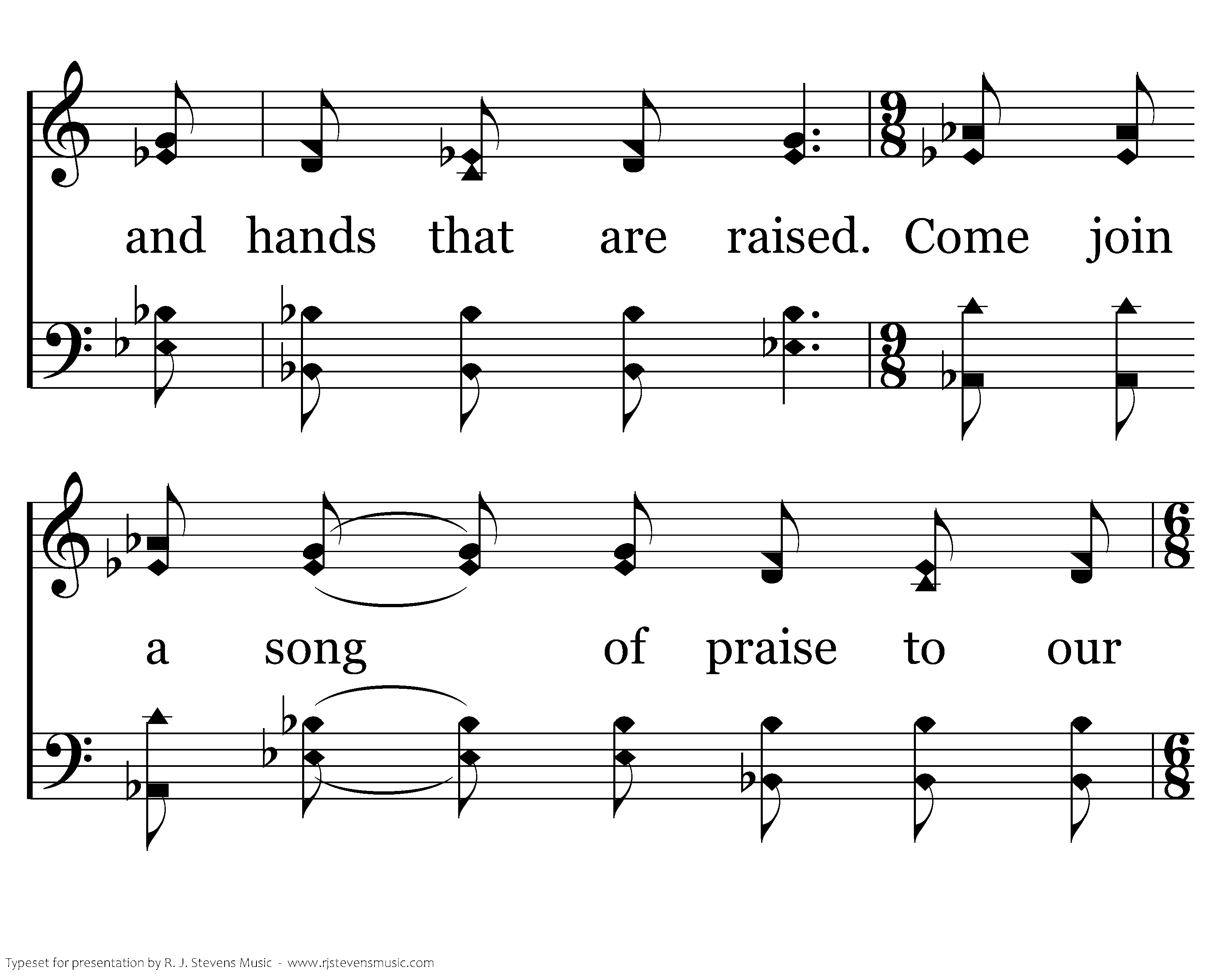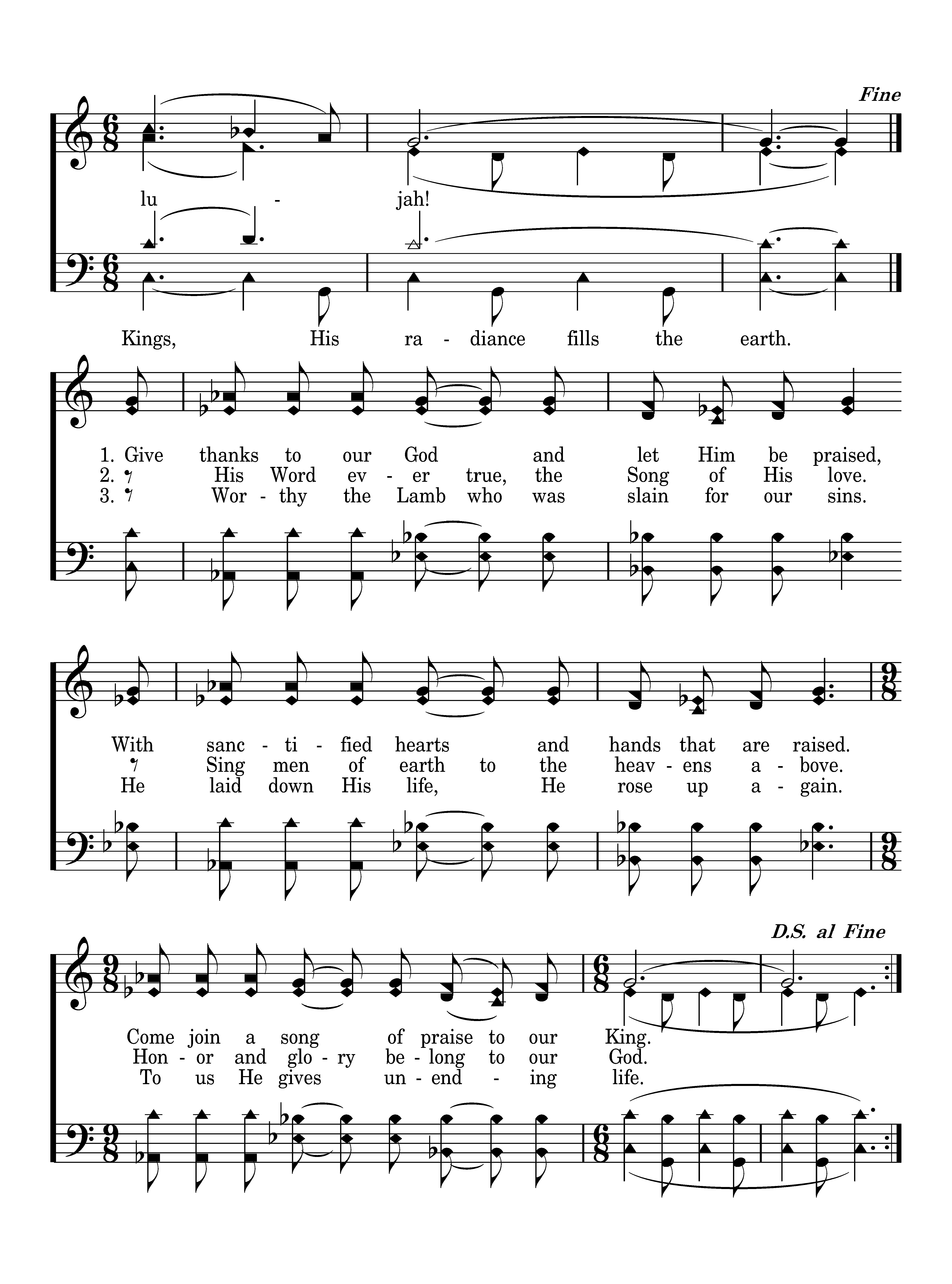 Glory, hallelujah! Glory, hallelujah! Glory, hallelujah! Glory, hallelujah! Give thanks to our God and let Him be praised, With sanctified hearts and hands that are raised. Come join a song of praise to our King.