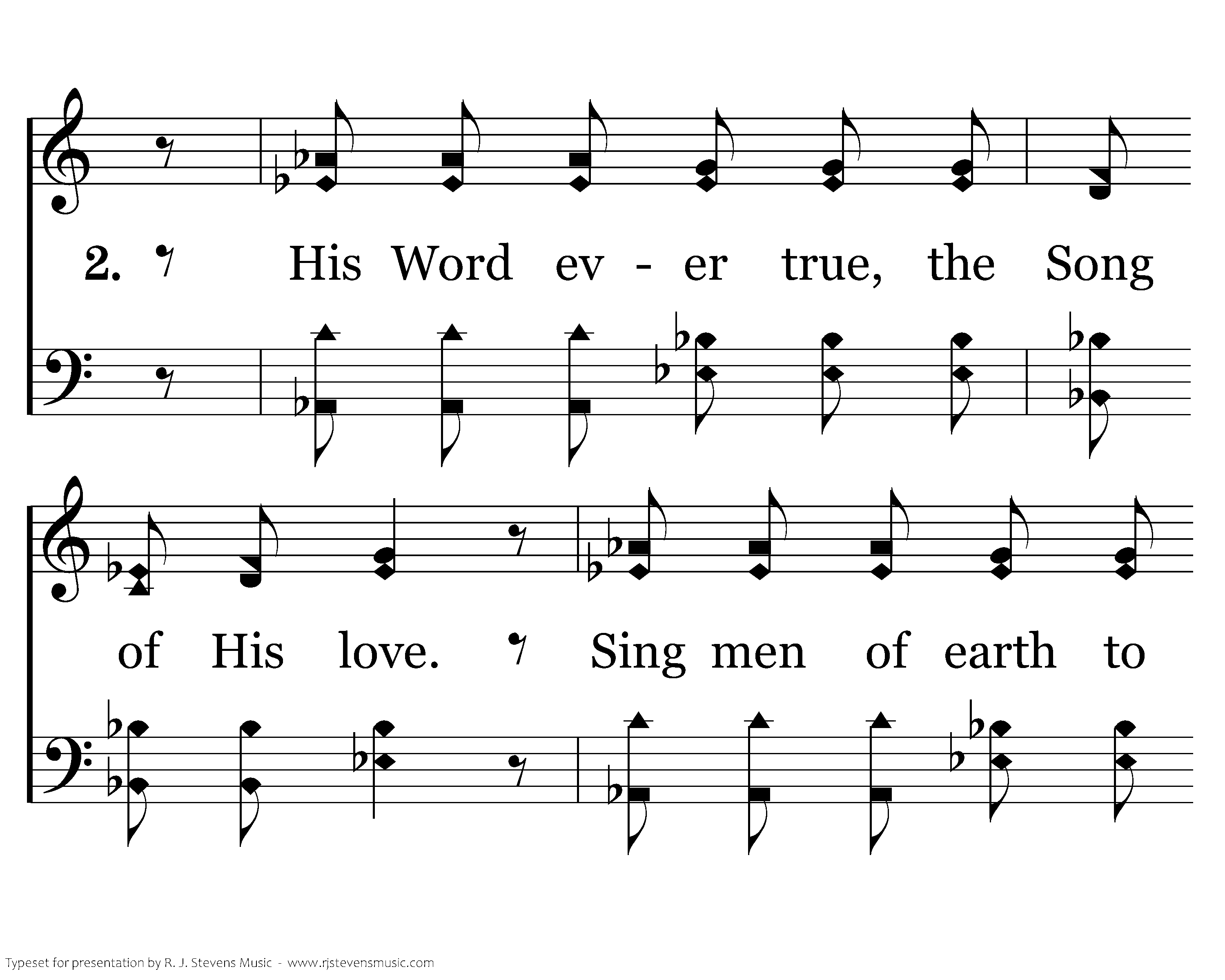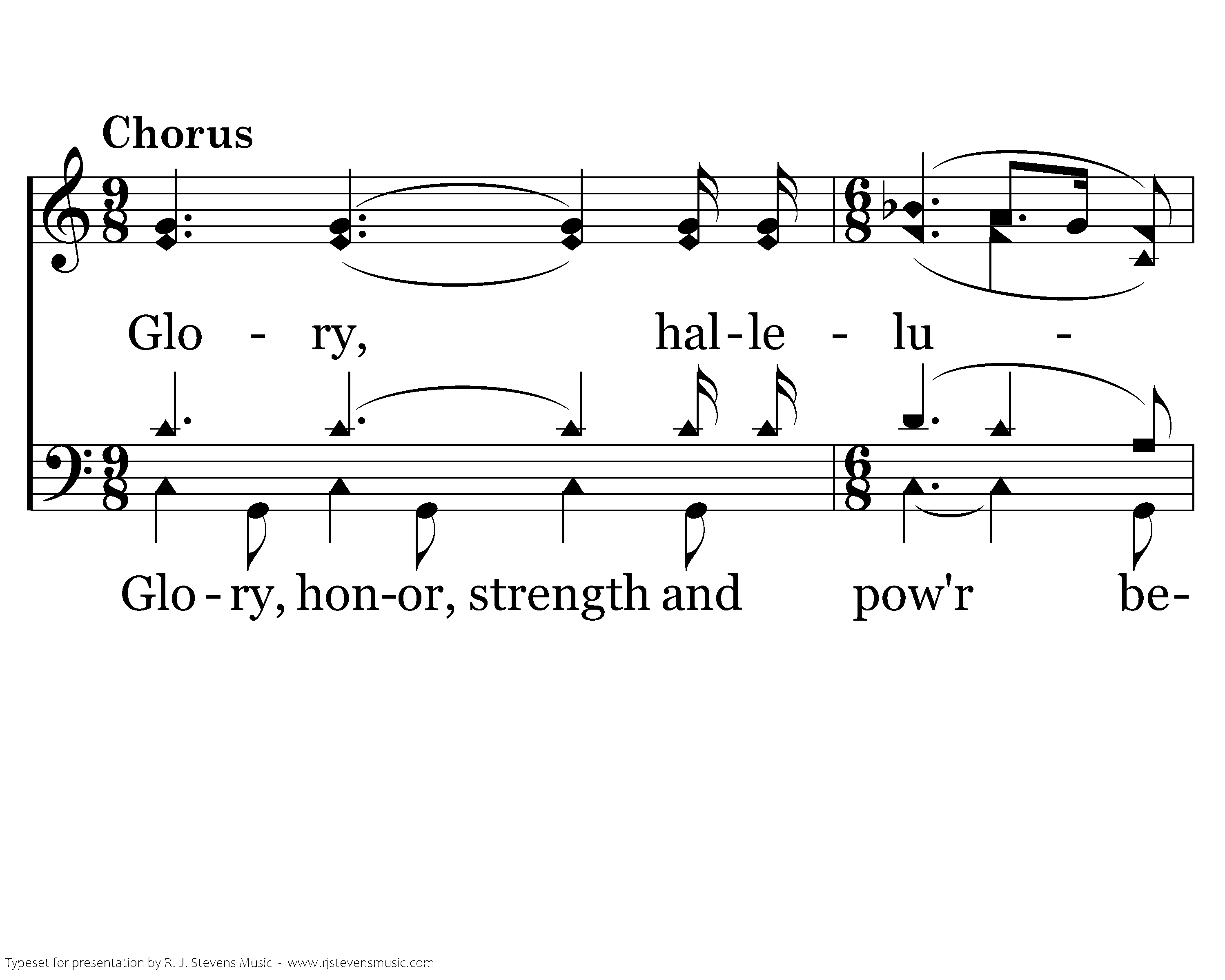 Glory, hallelujah! Glory, hallelujah! His Word ever true, the Song of His love. Sing men of earth to the heavens above. Honor and glory belong to our God.