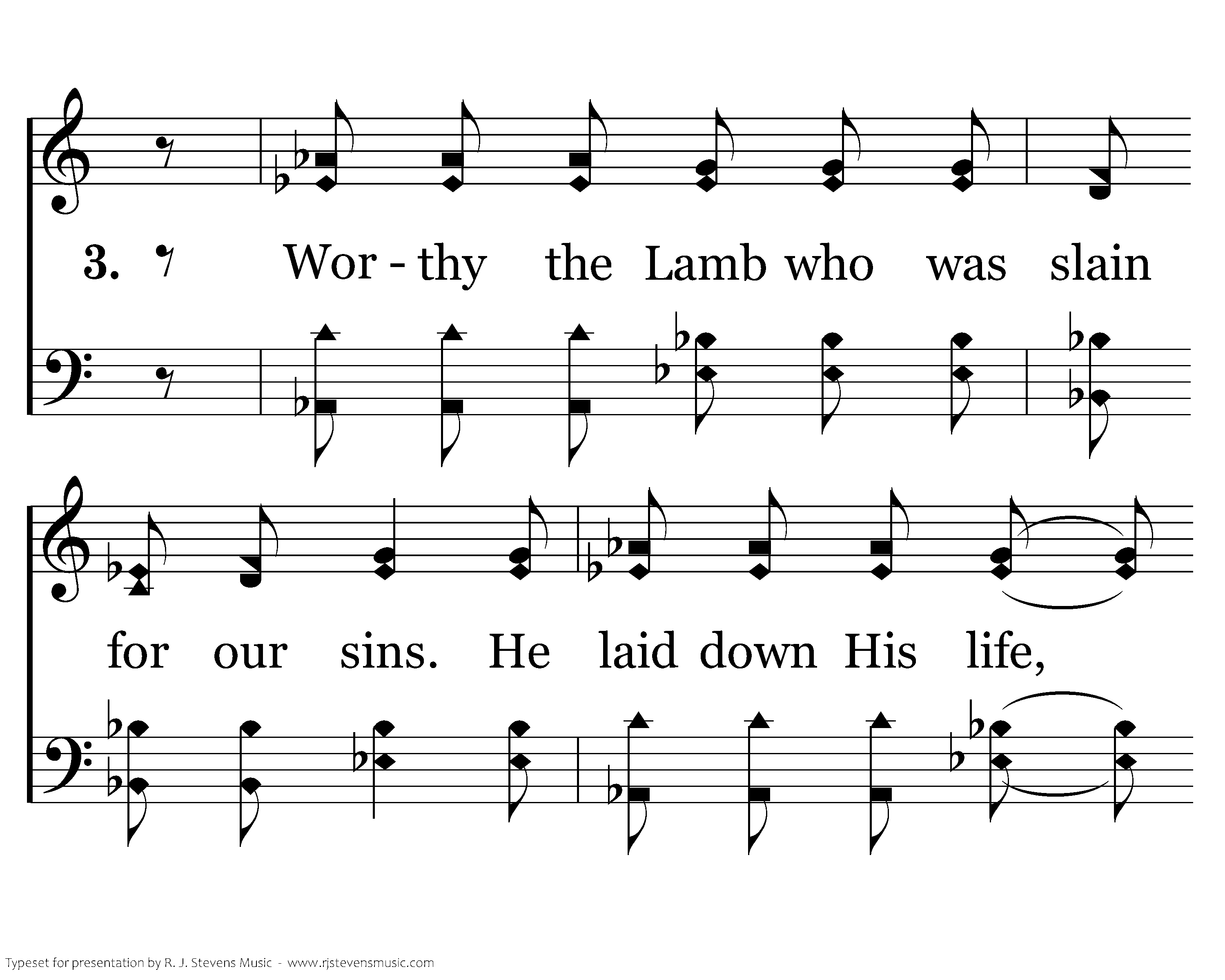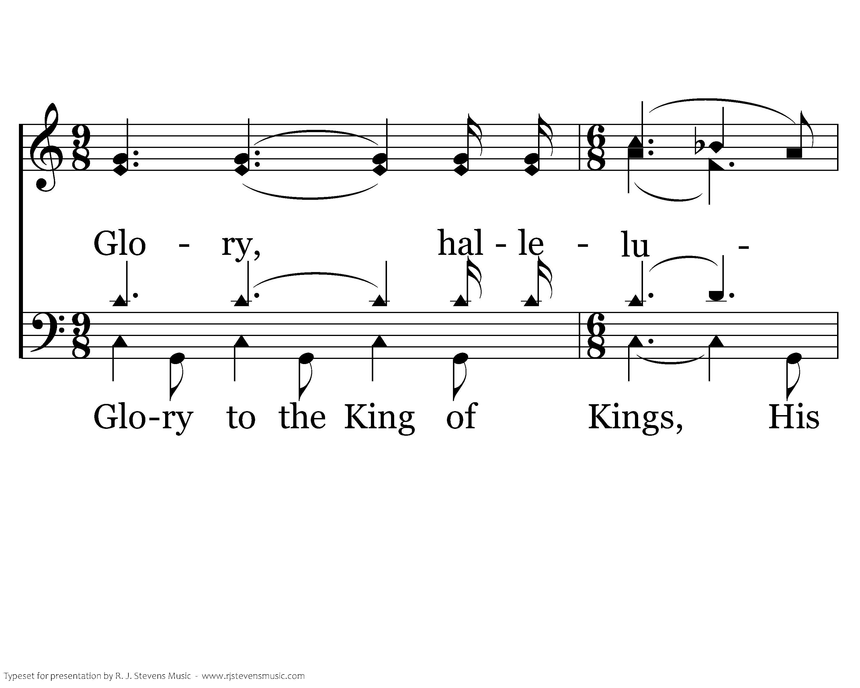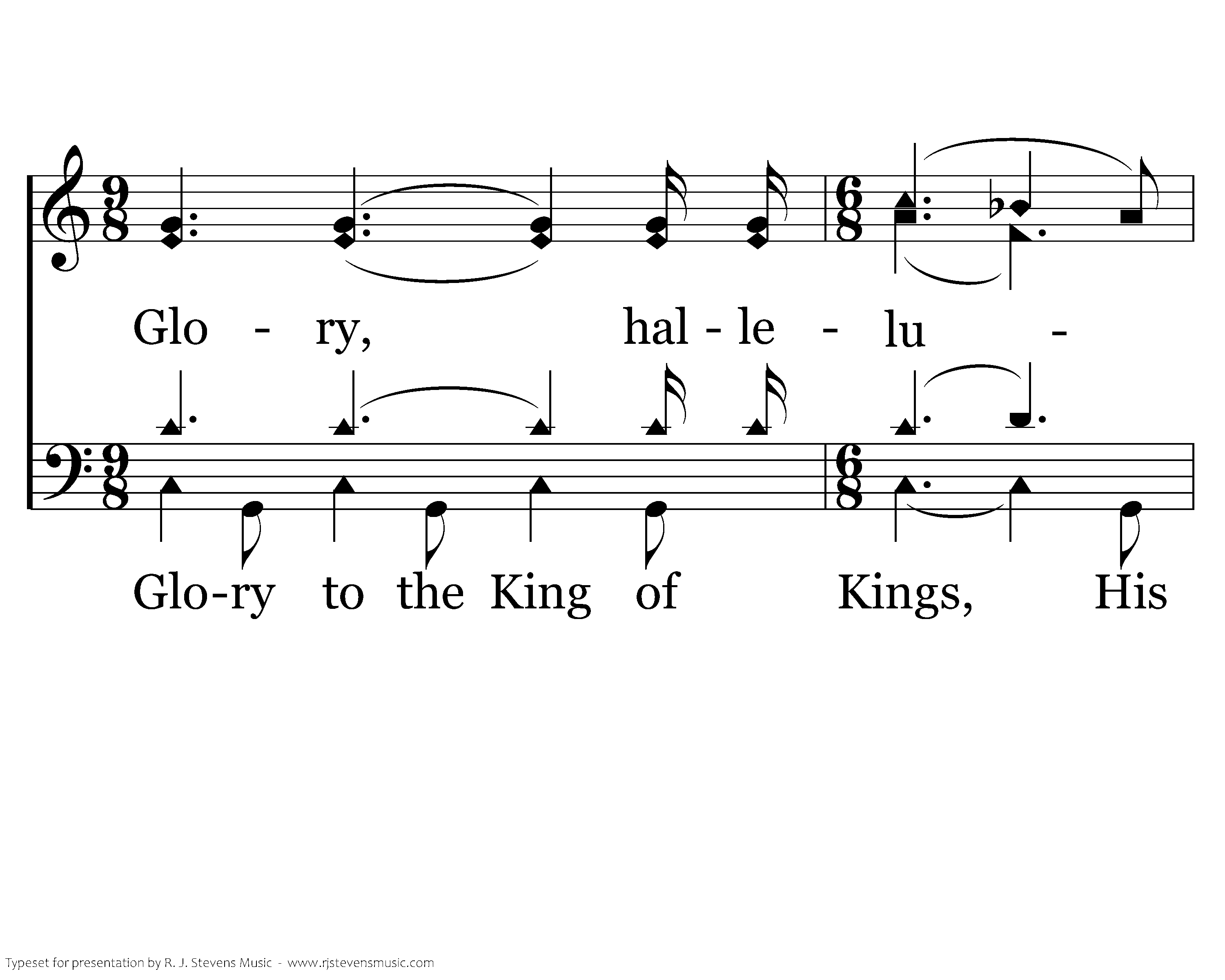 Glory, hallelujah! Glory, hallelujah! Worthy the Lamb who was slain for our sins. He laid down His life, He rose up again. To us He gives unending life. Glory, hallelujah! Glory, hallelujah!