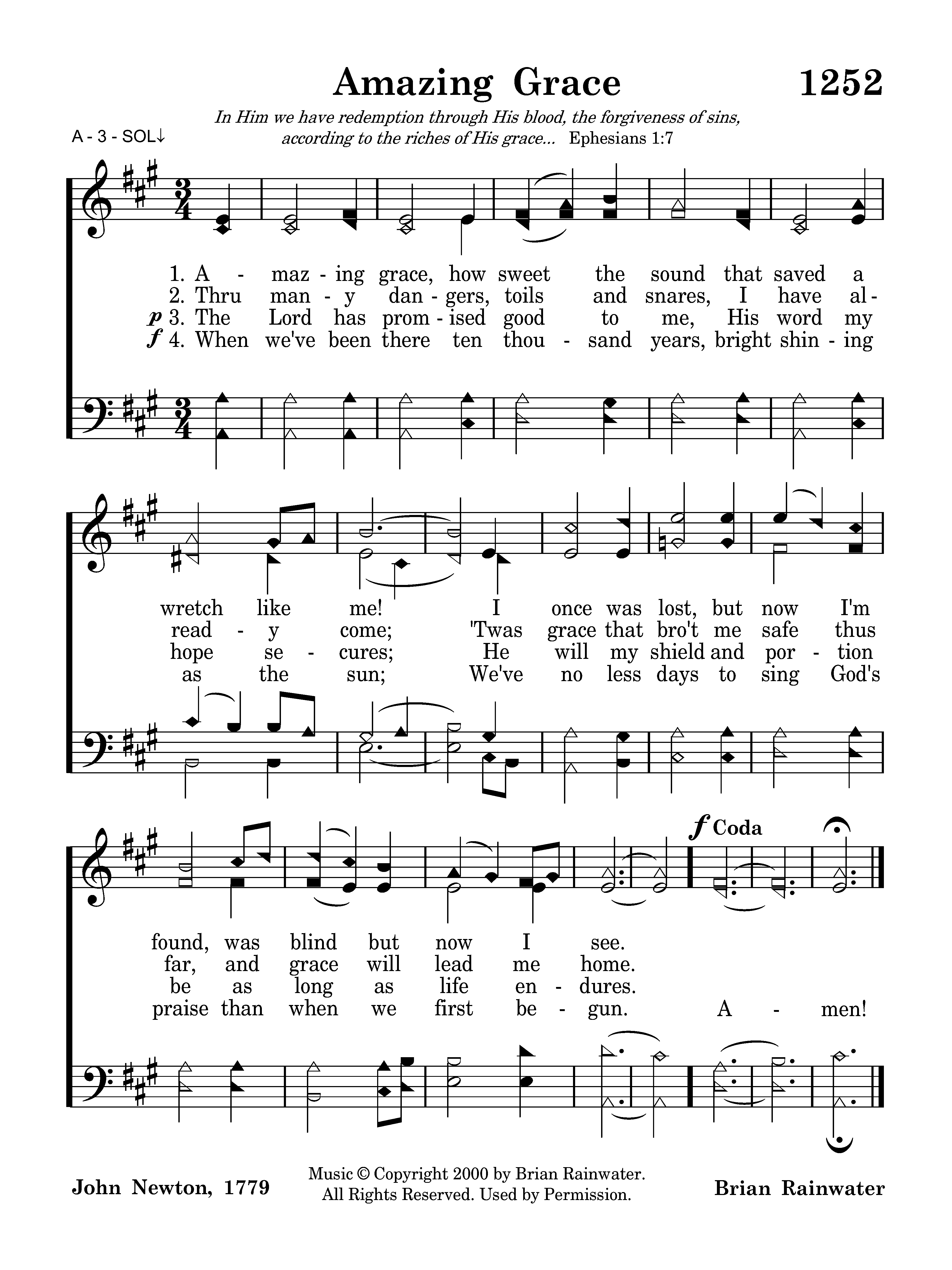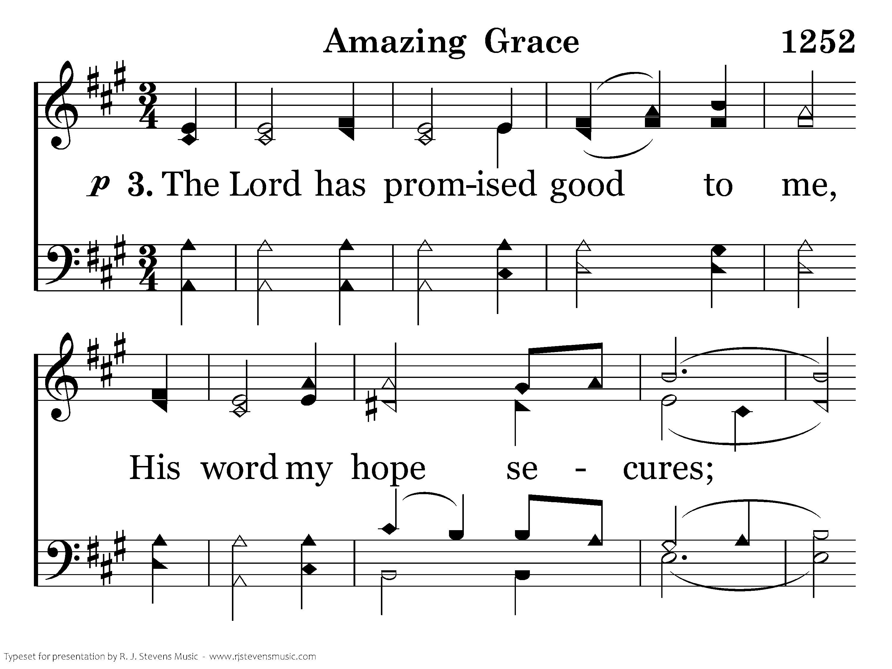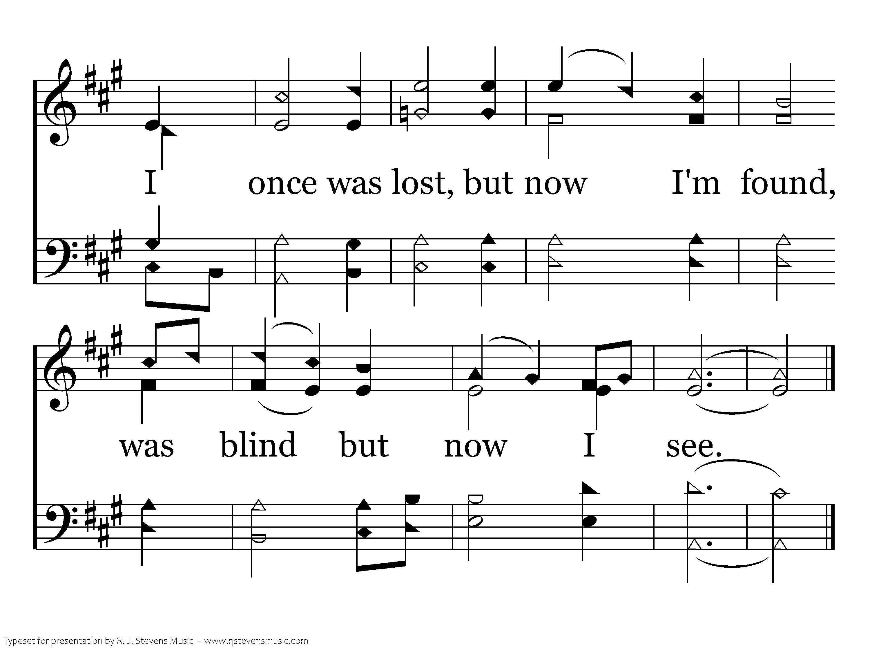 Amazing grace, how sweet the sound that saved a wretch like me! I once was lost, but now I'm found, was blind but now I see.