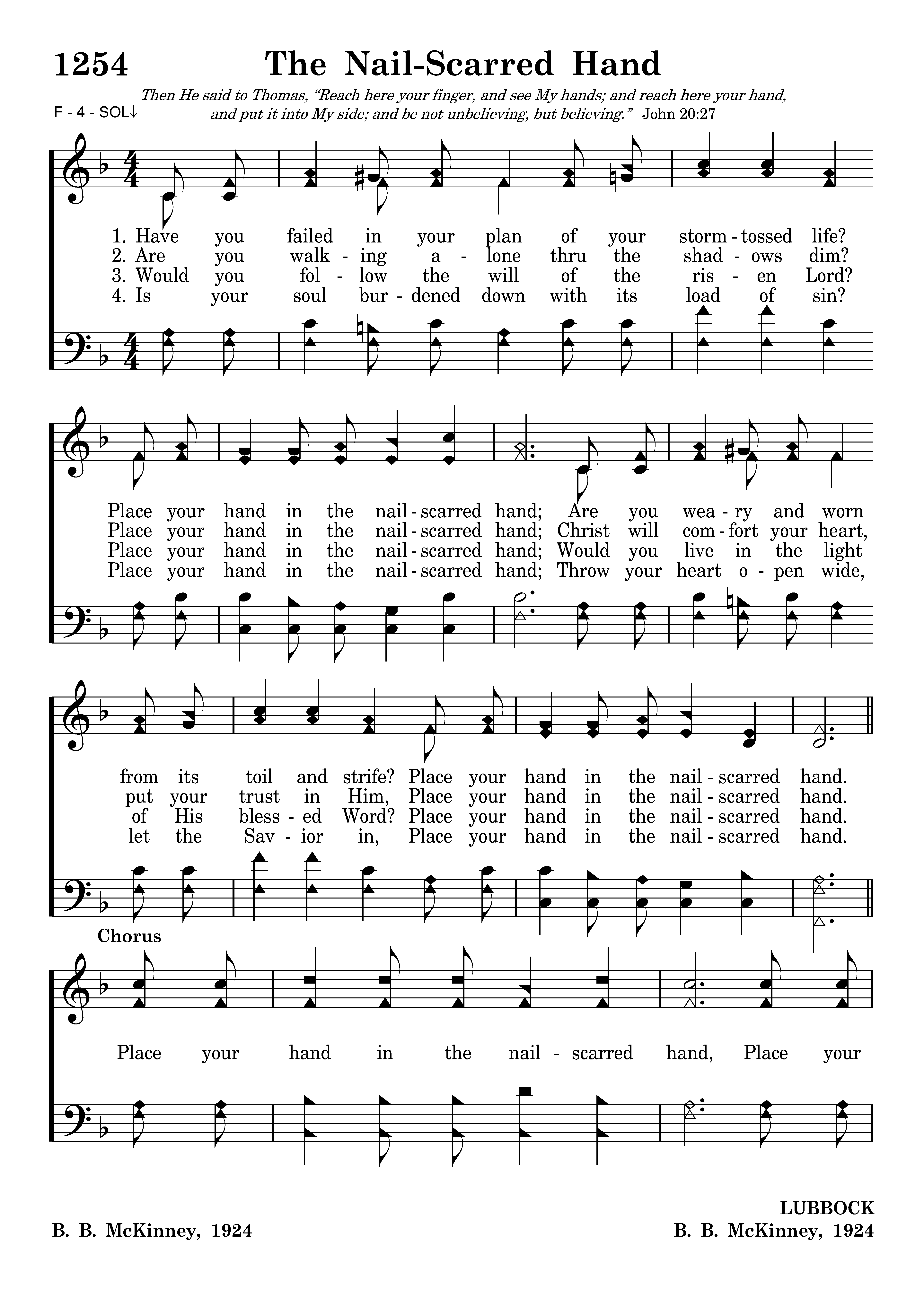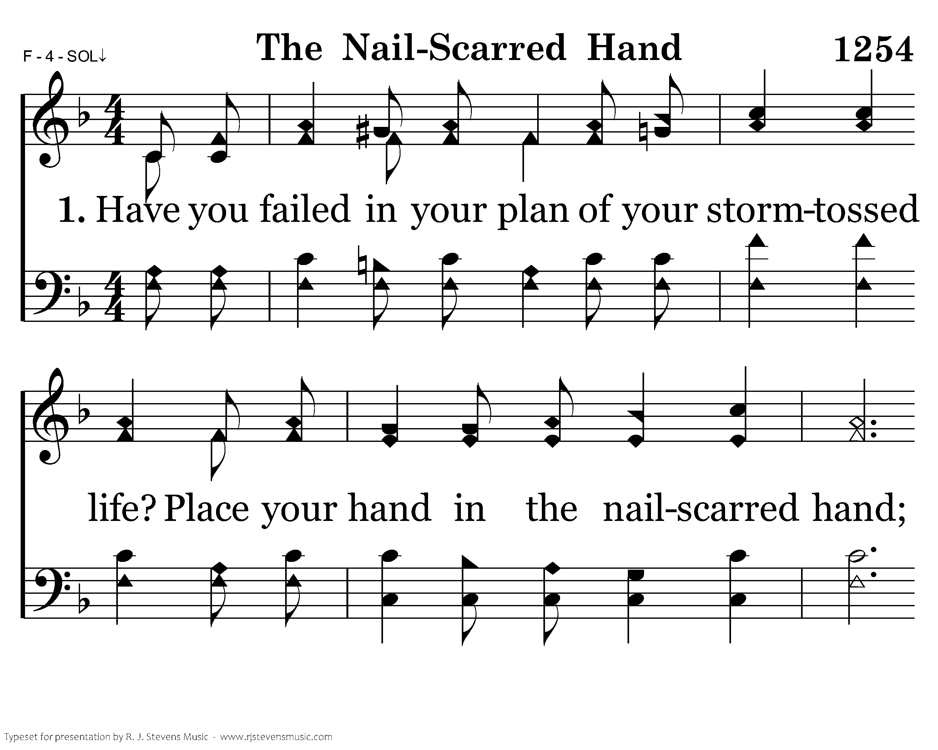 Have you failed in your plan of your stormtossed life? Place your hand in the nailscarred hand; Are you weary and worn from its toil and strife? Place your hand in the nailscarred hand.