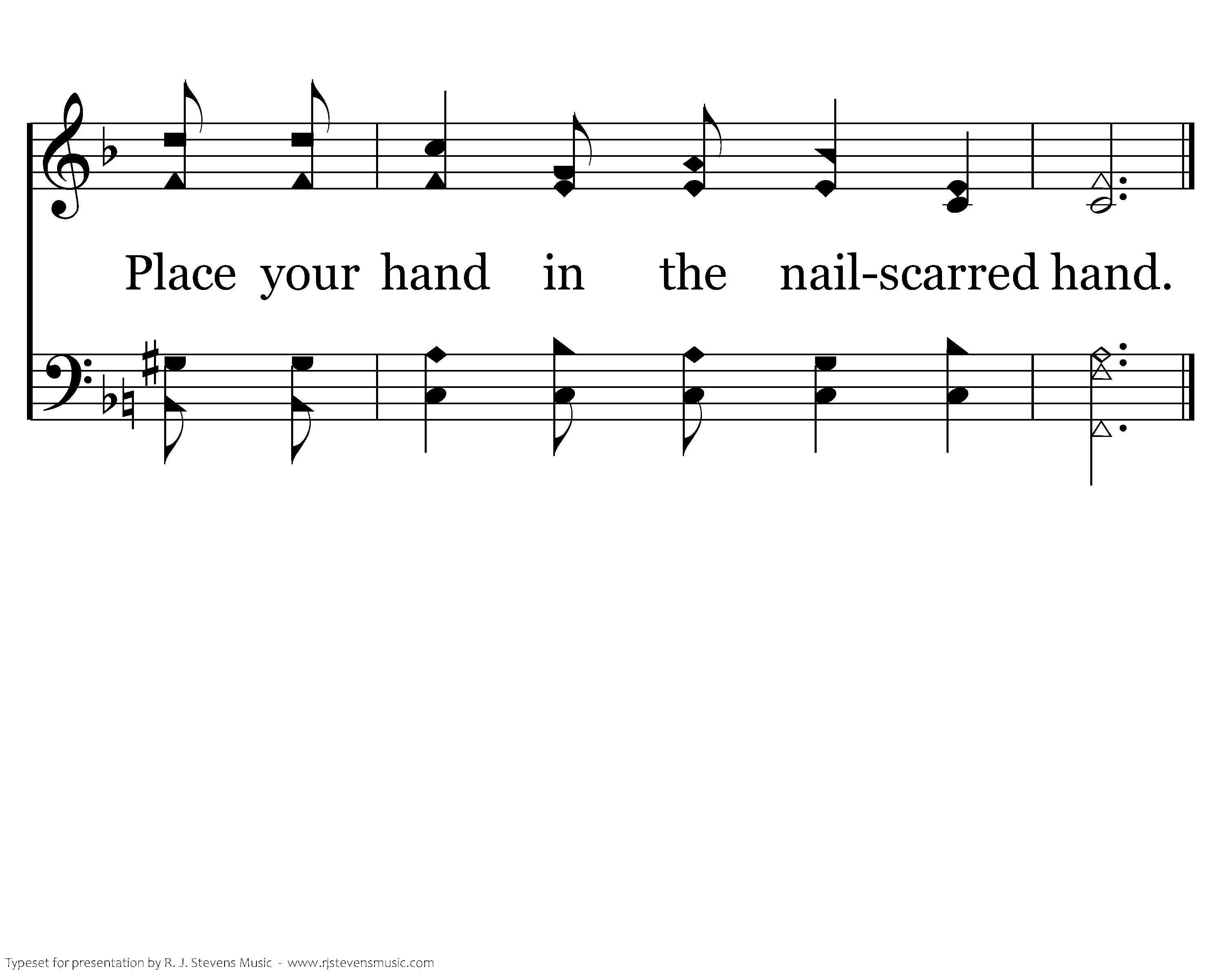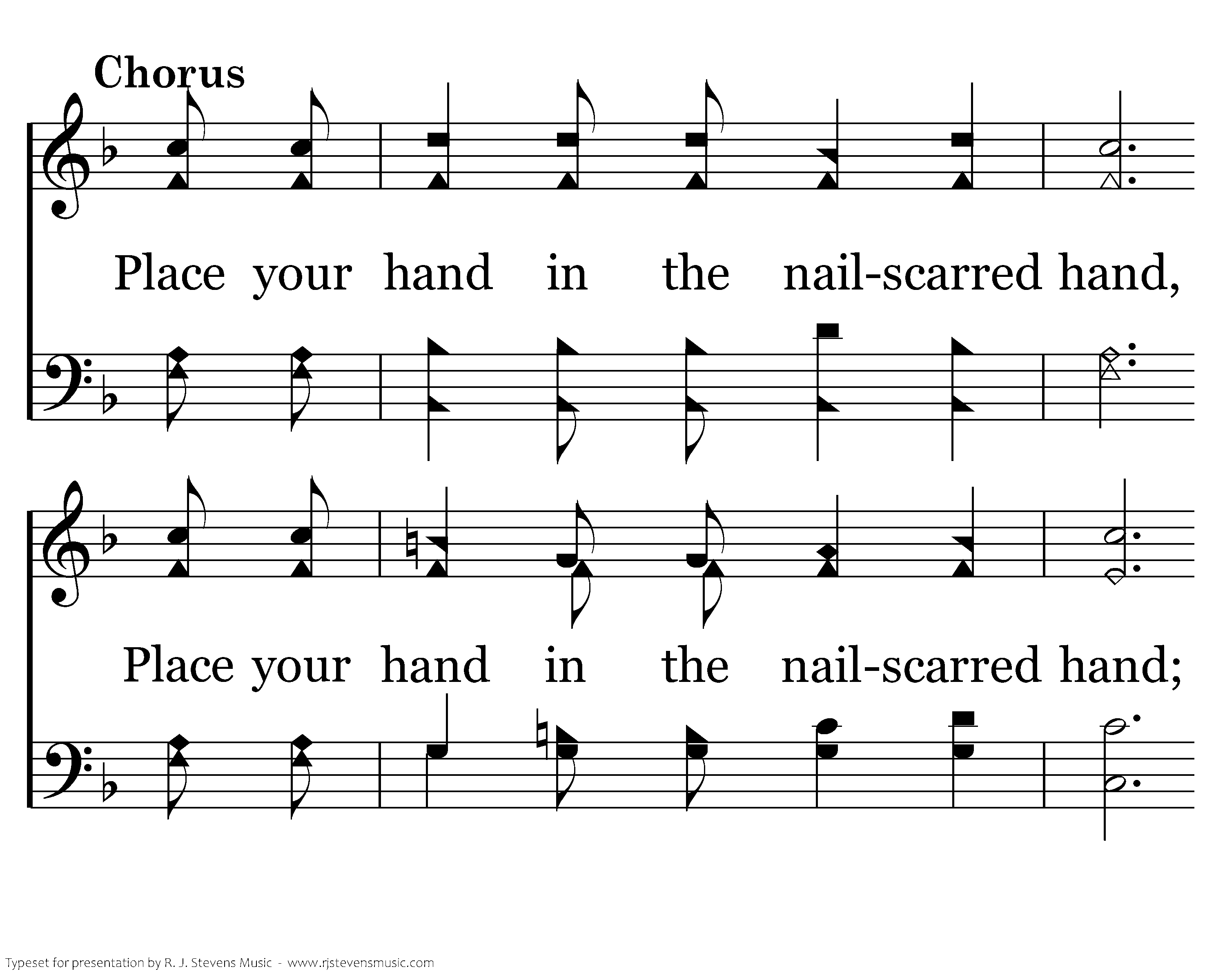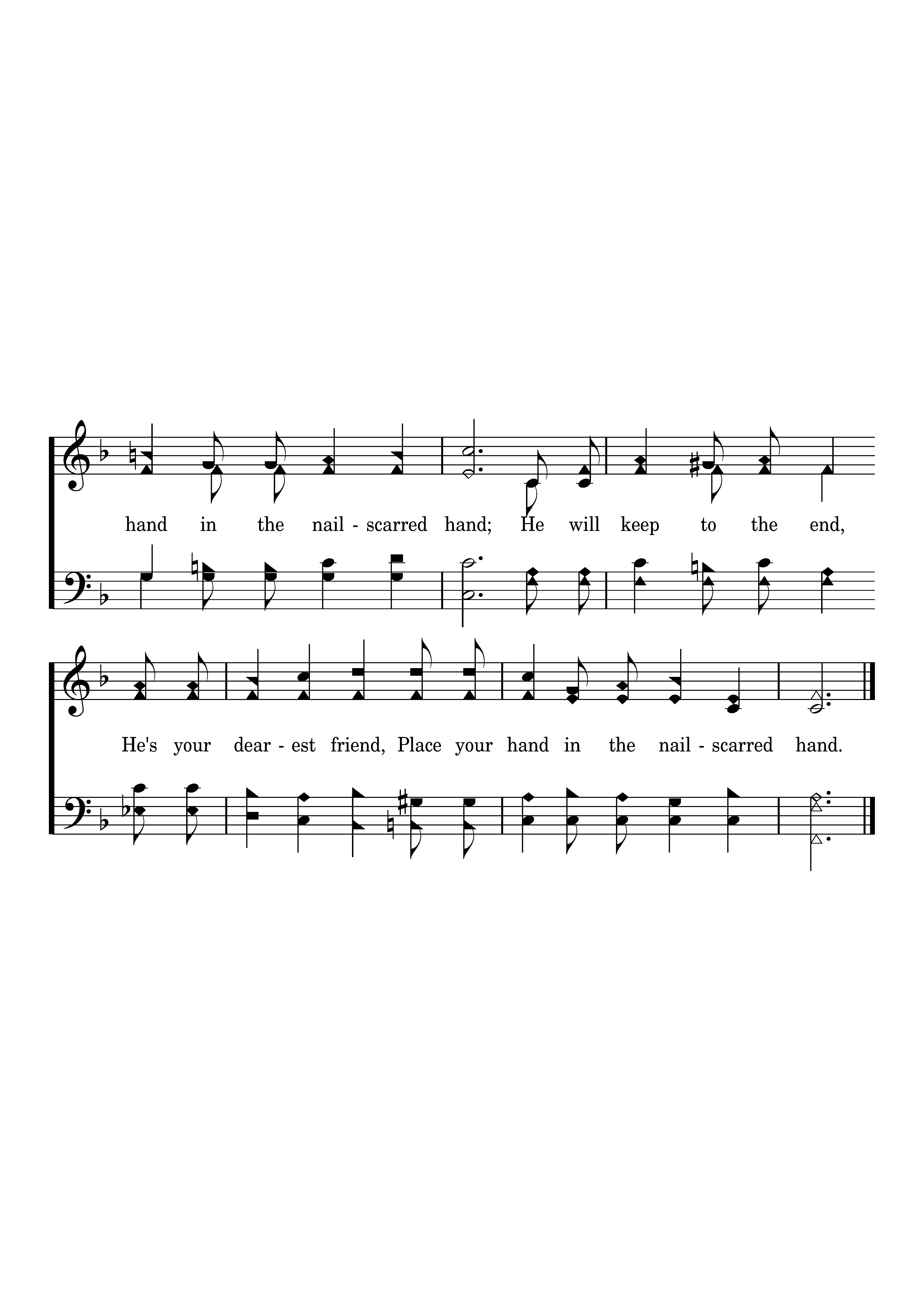 Place your hand in the nailscarred hand, Place your hand in the nailscarred hand; He will keep to the end, He's your dearest friend, Place your hand in the nailscarred hand.