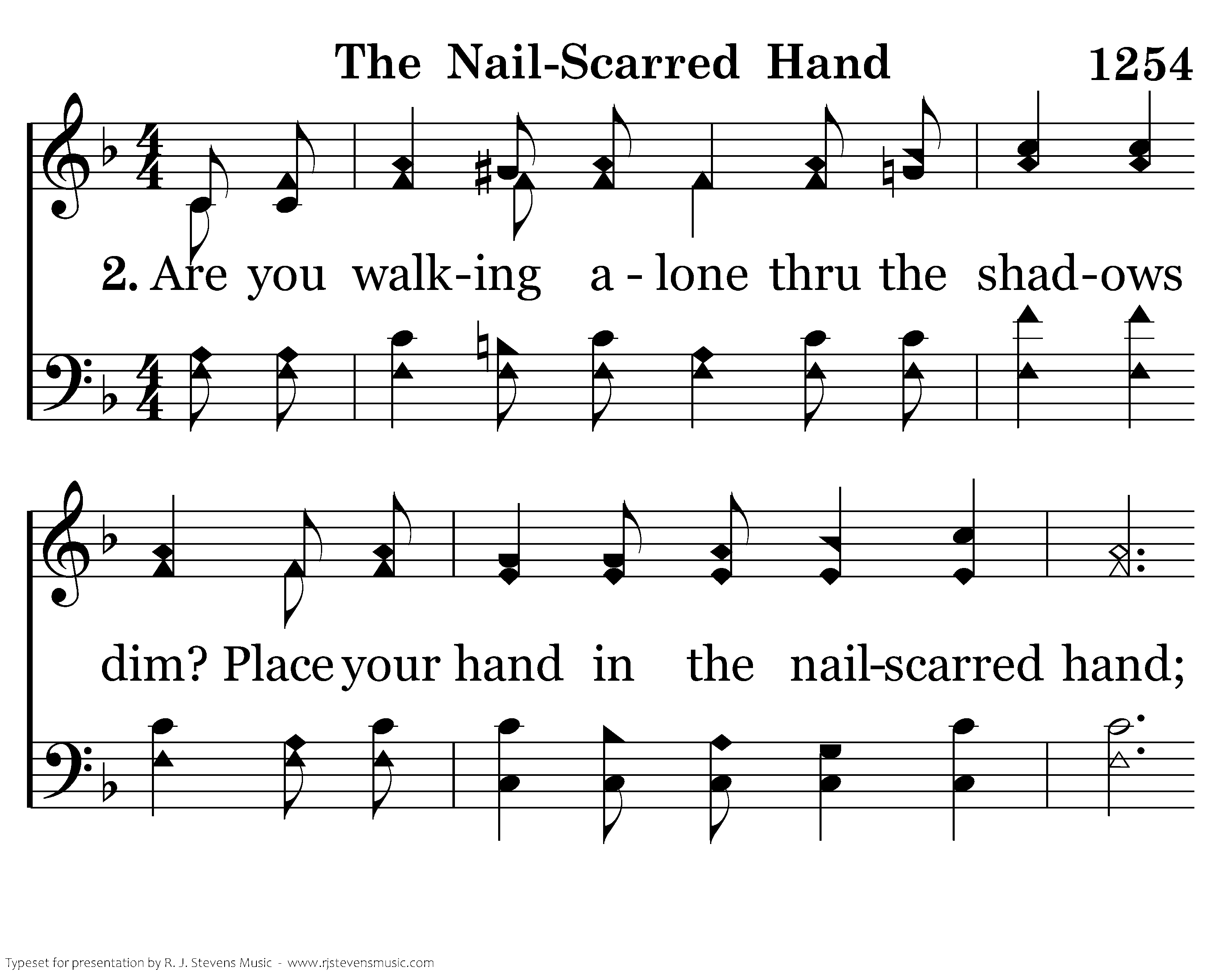 Are you walking alone thru the shadows dim? Place your hand in the nailscarred hand; Christ will comfort your heart, put your trust in Him, Place your hand in the nailscarred hand.