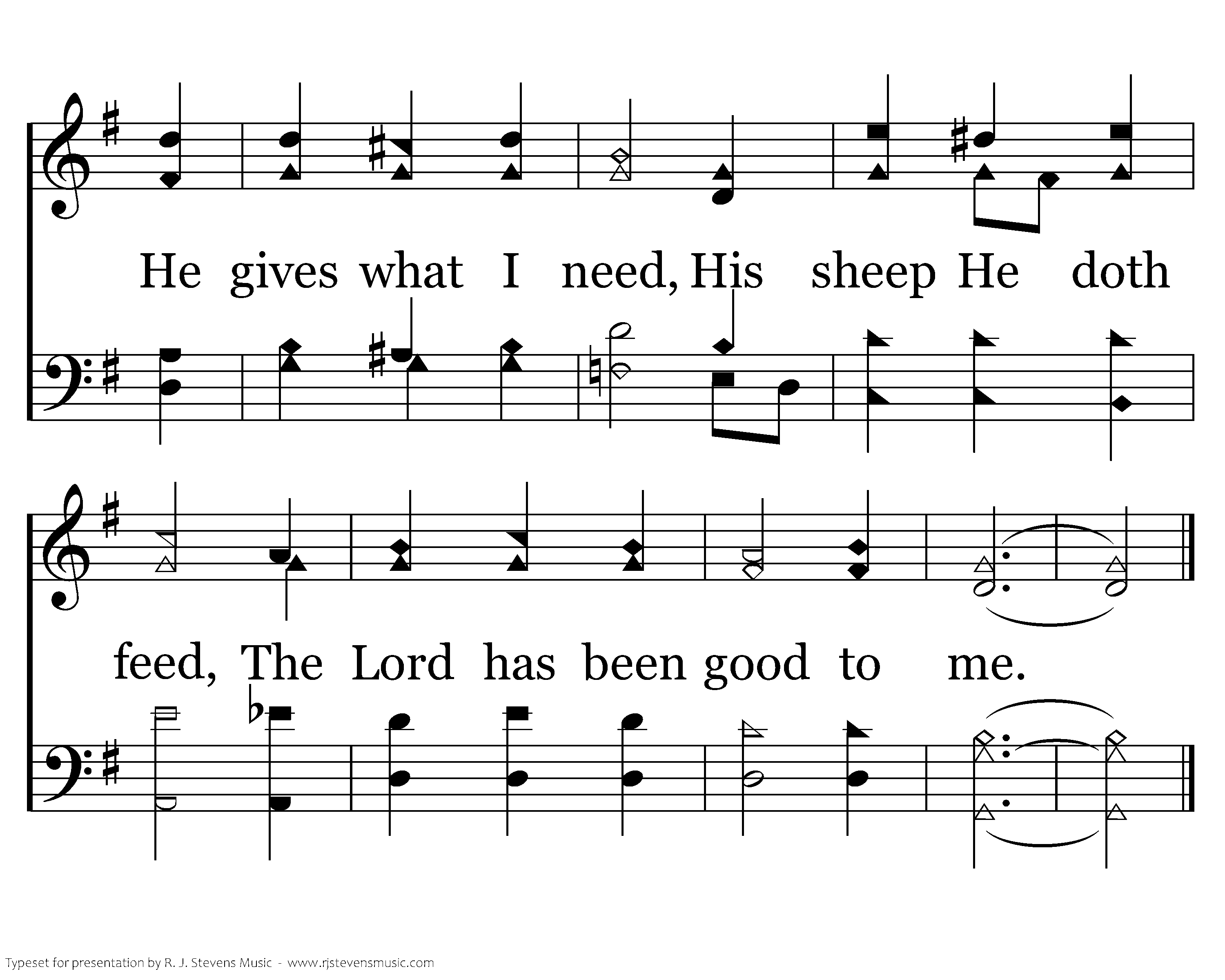 The Lord has been good to me, The Lord has been good to me; He gives what I need, His sheep He doth feed, The Lord has been good to me.