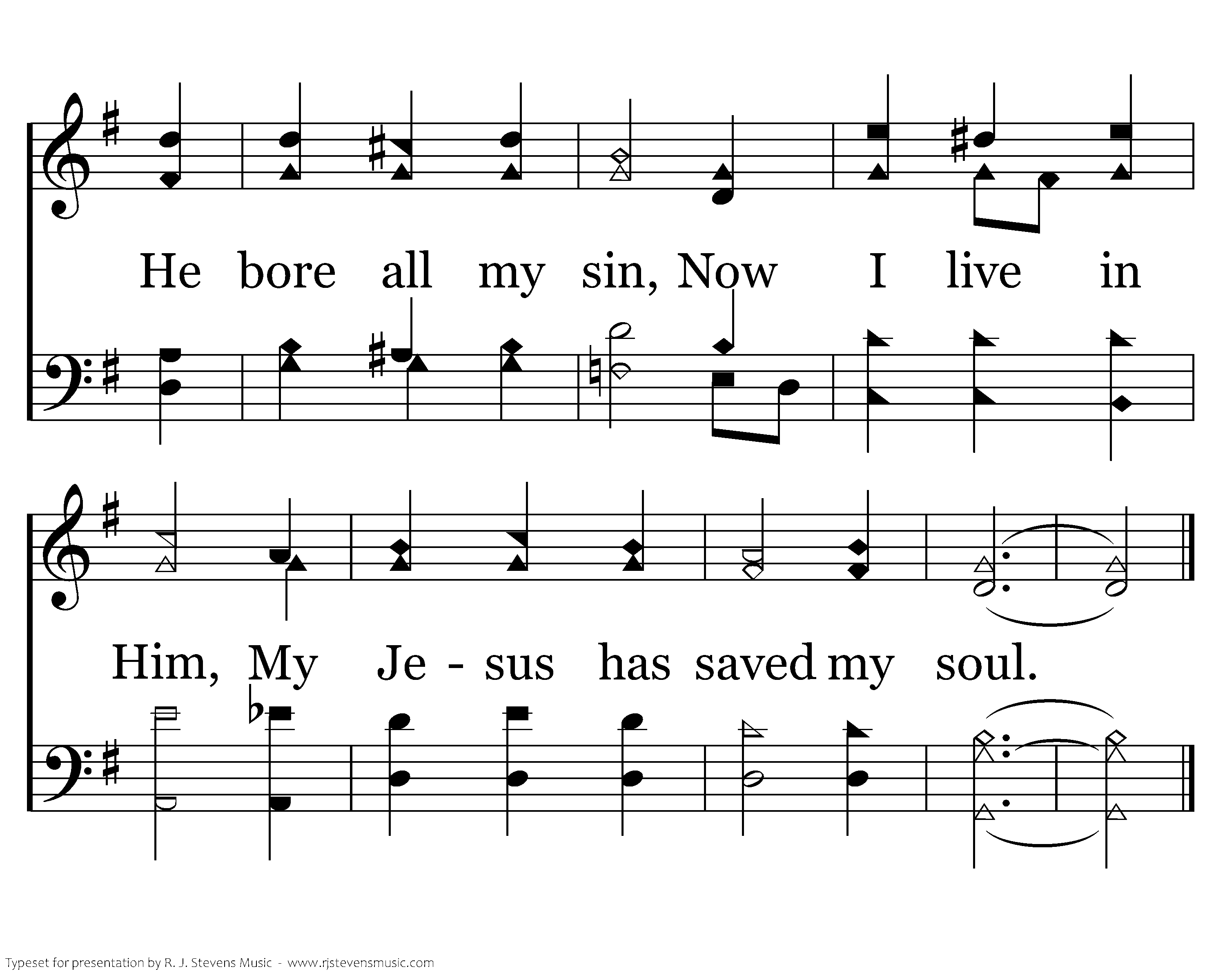 My Jesus has saved my soul, He washed me and made me whole; He bore all my sin, Now I live in Him, My Jesus has saved my soul.