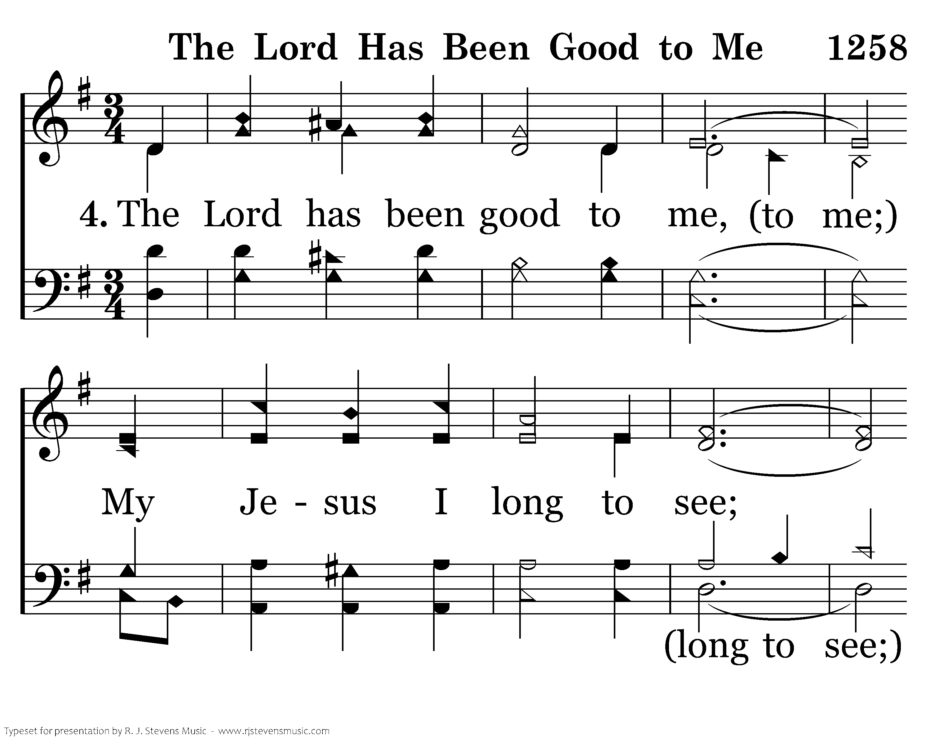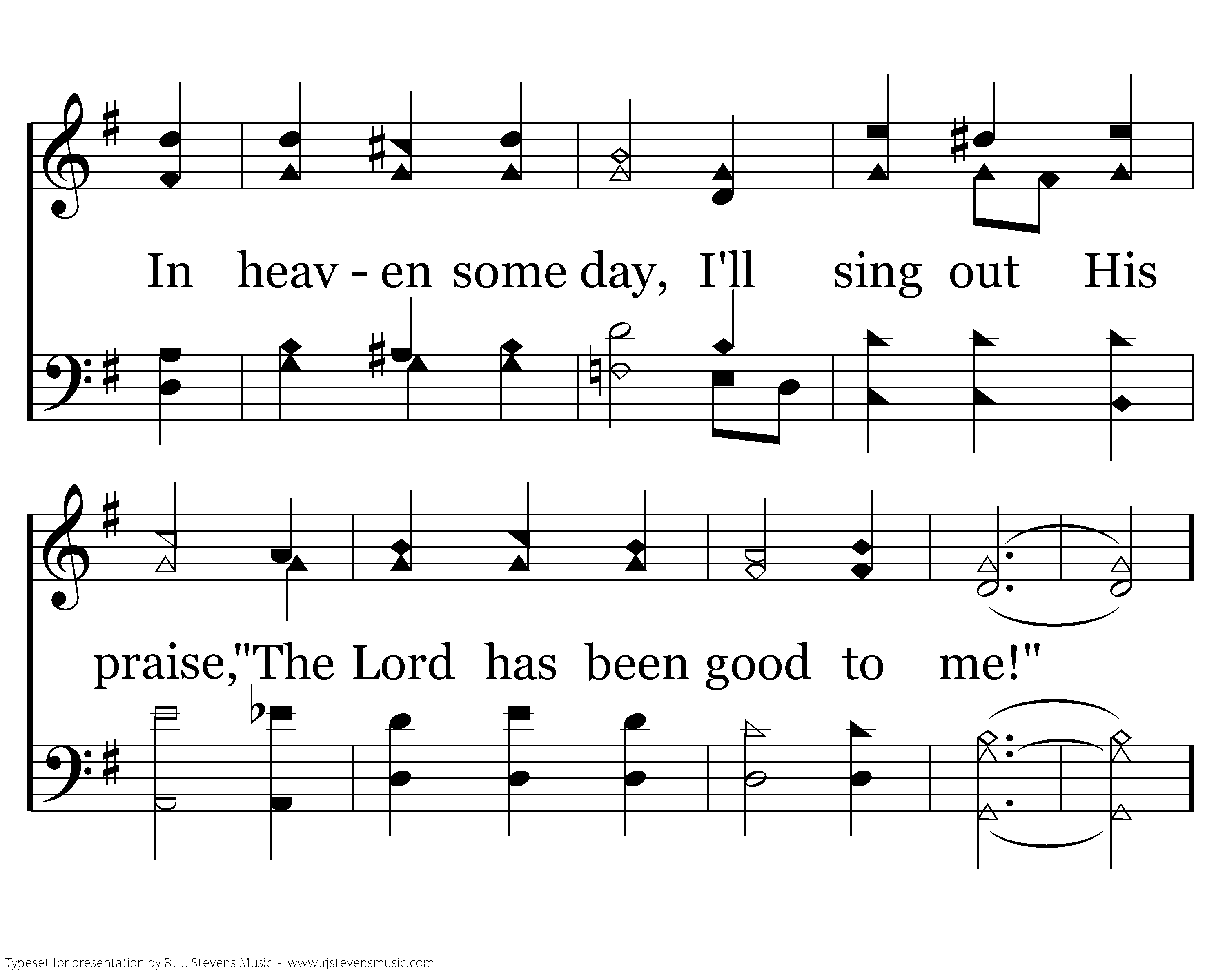 The Lord has been good to me, My Jesus I long to see; In heaven some day, I'll sing out His praise, "The Lord has been good to me!"