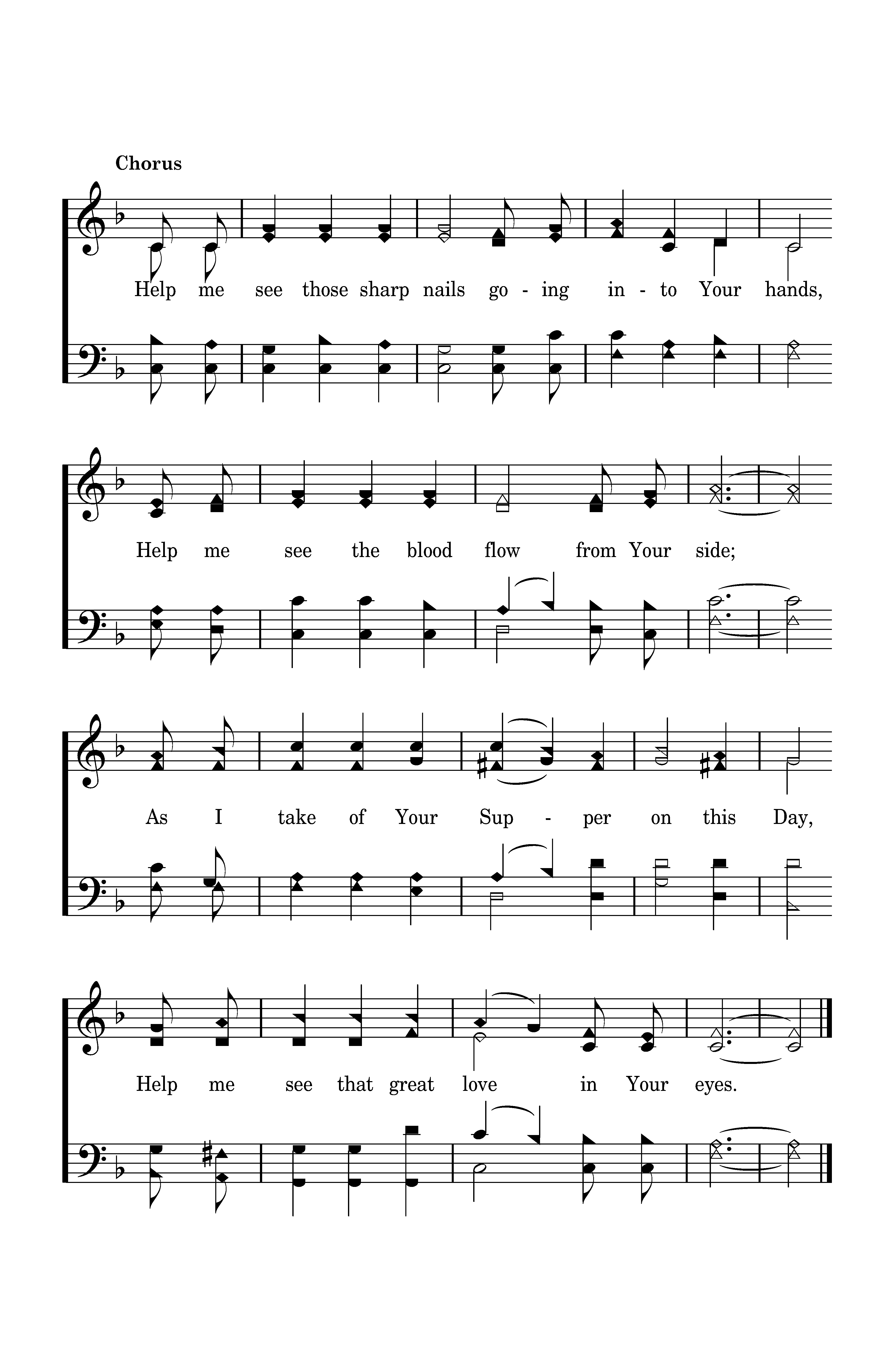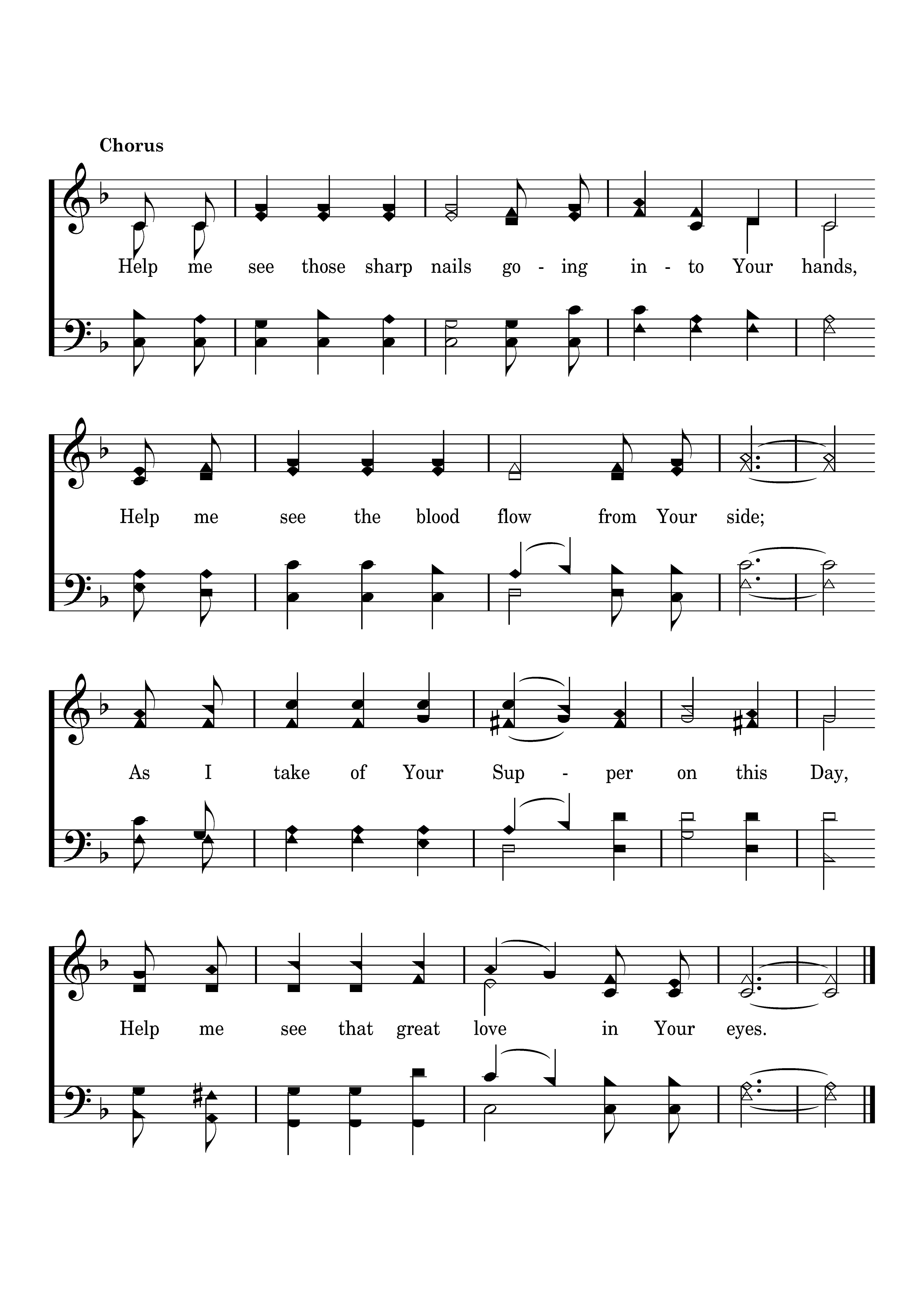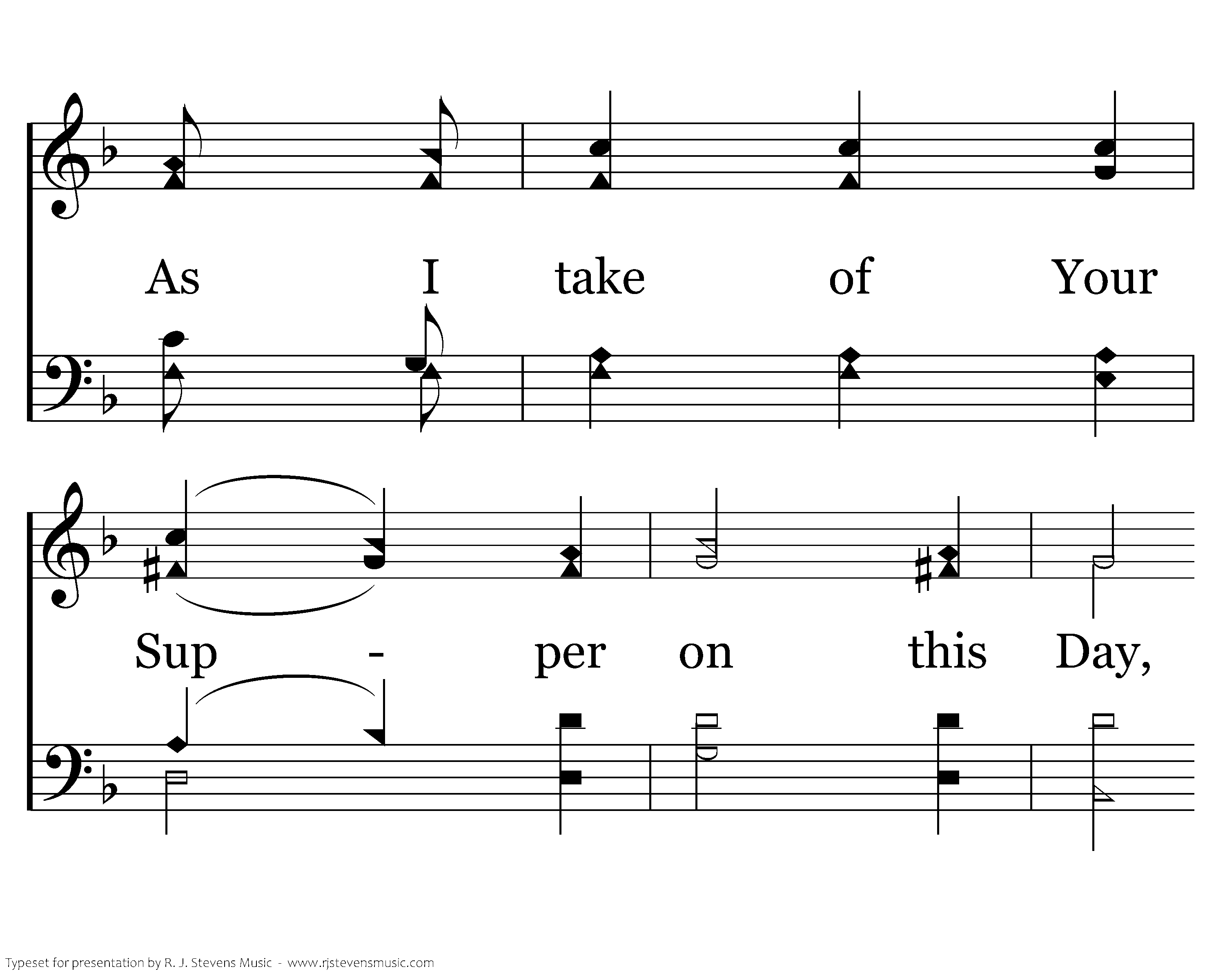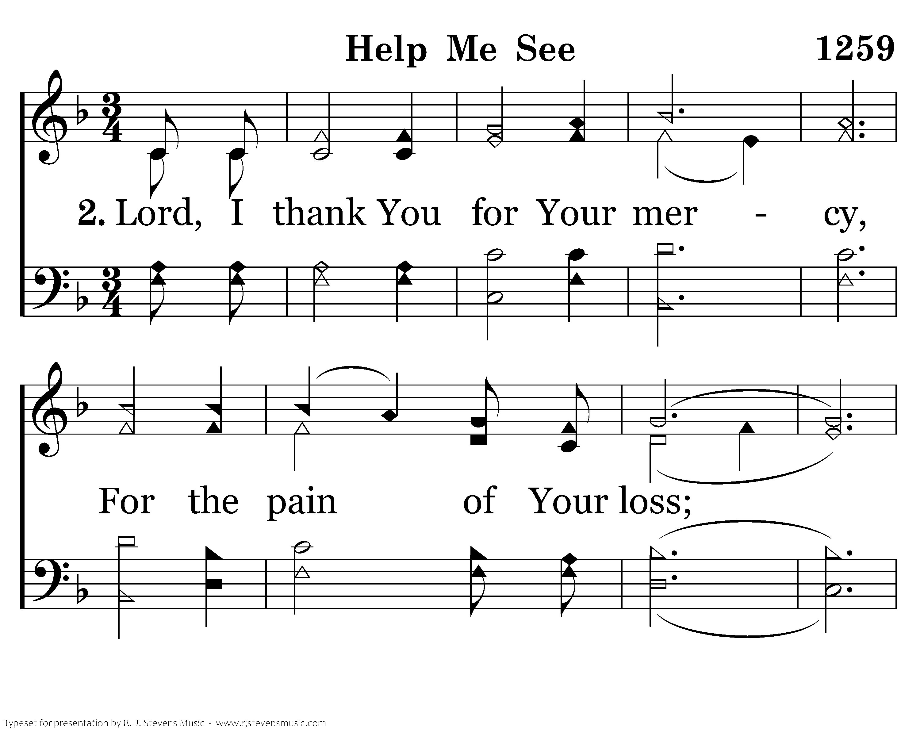 Help me see those sharp nails going into Your hands, Help me see the blood flow from Your side; As I take of Your Supper on this Day, Help me see that great love in Your eyes.