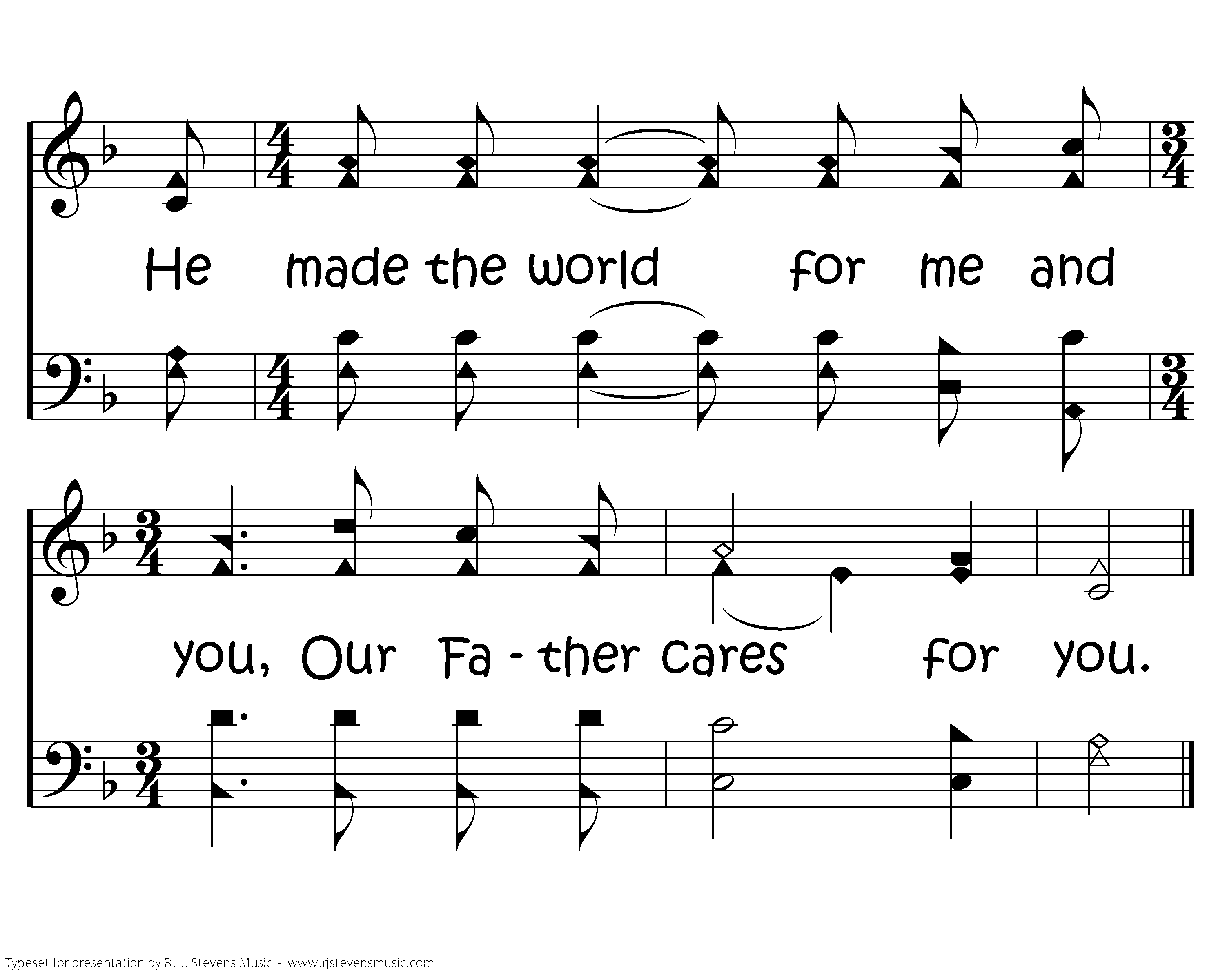 God cares for you, He cares for me, His love is very plain to see; He made the world for me and you, Our Father cares for you.