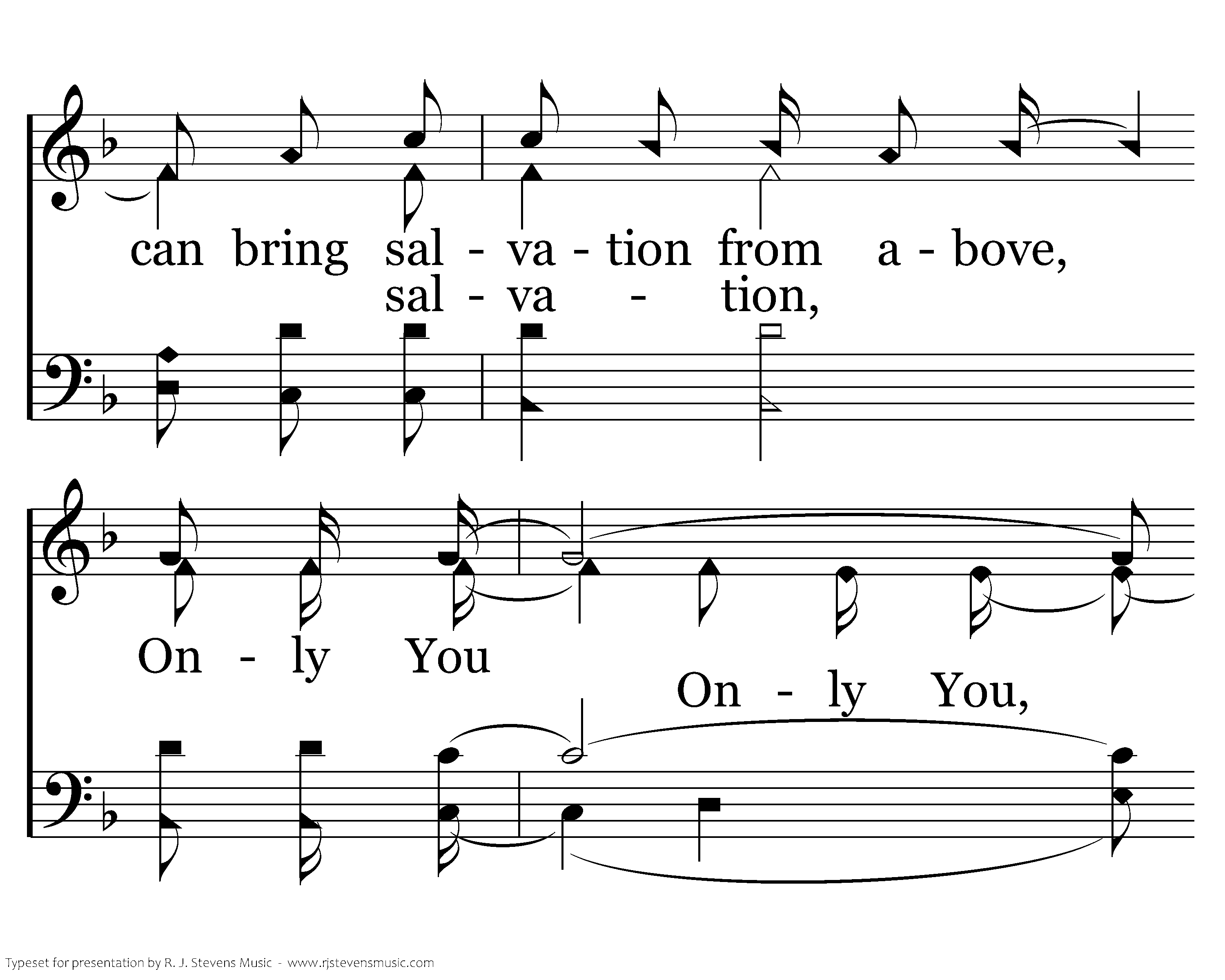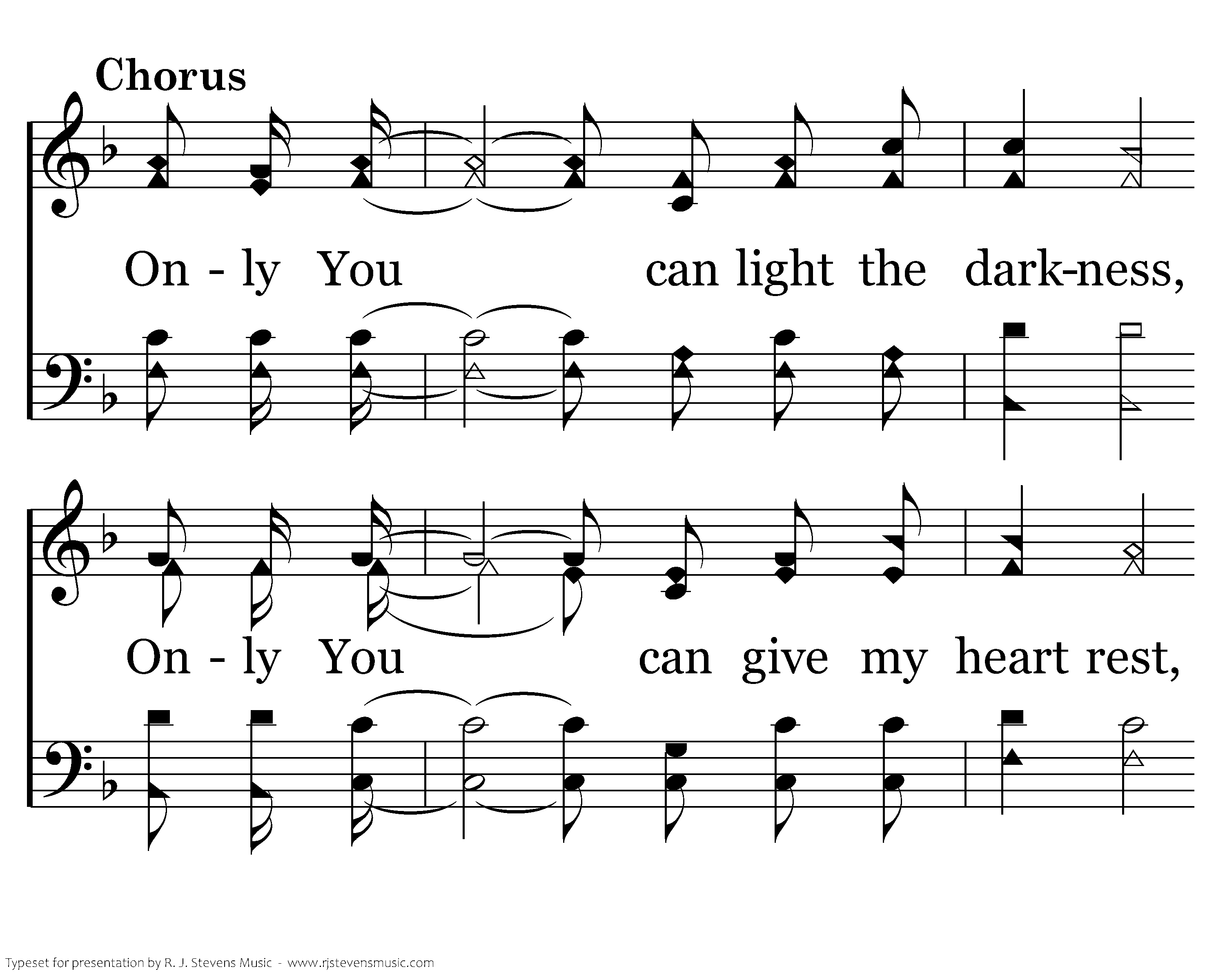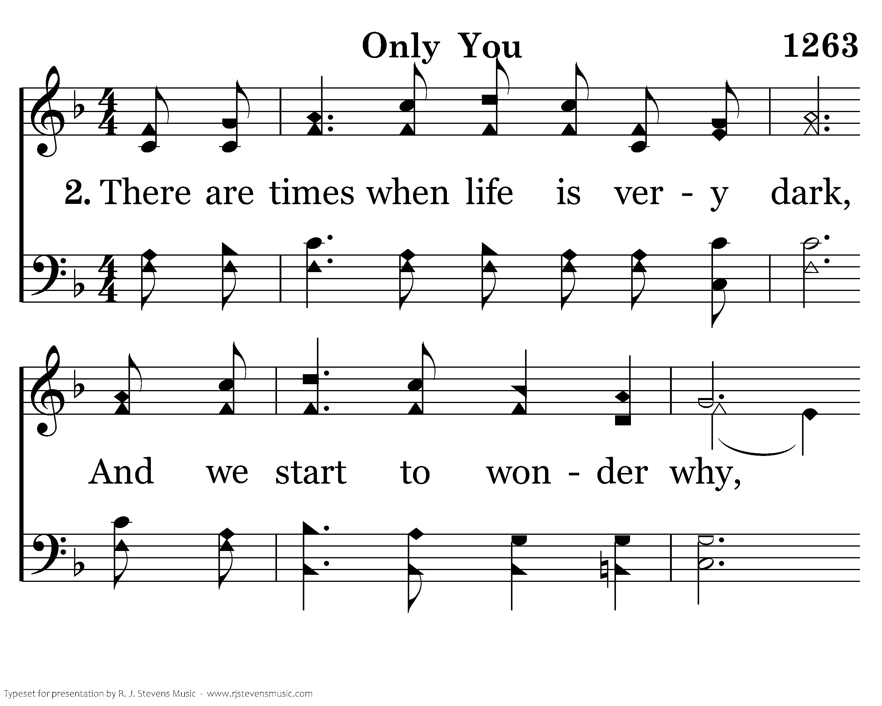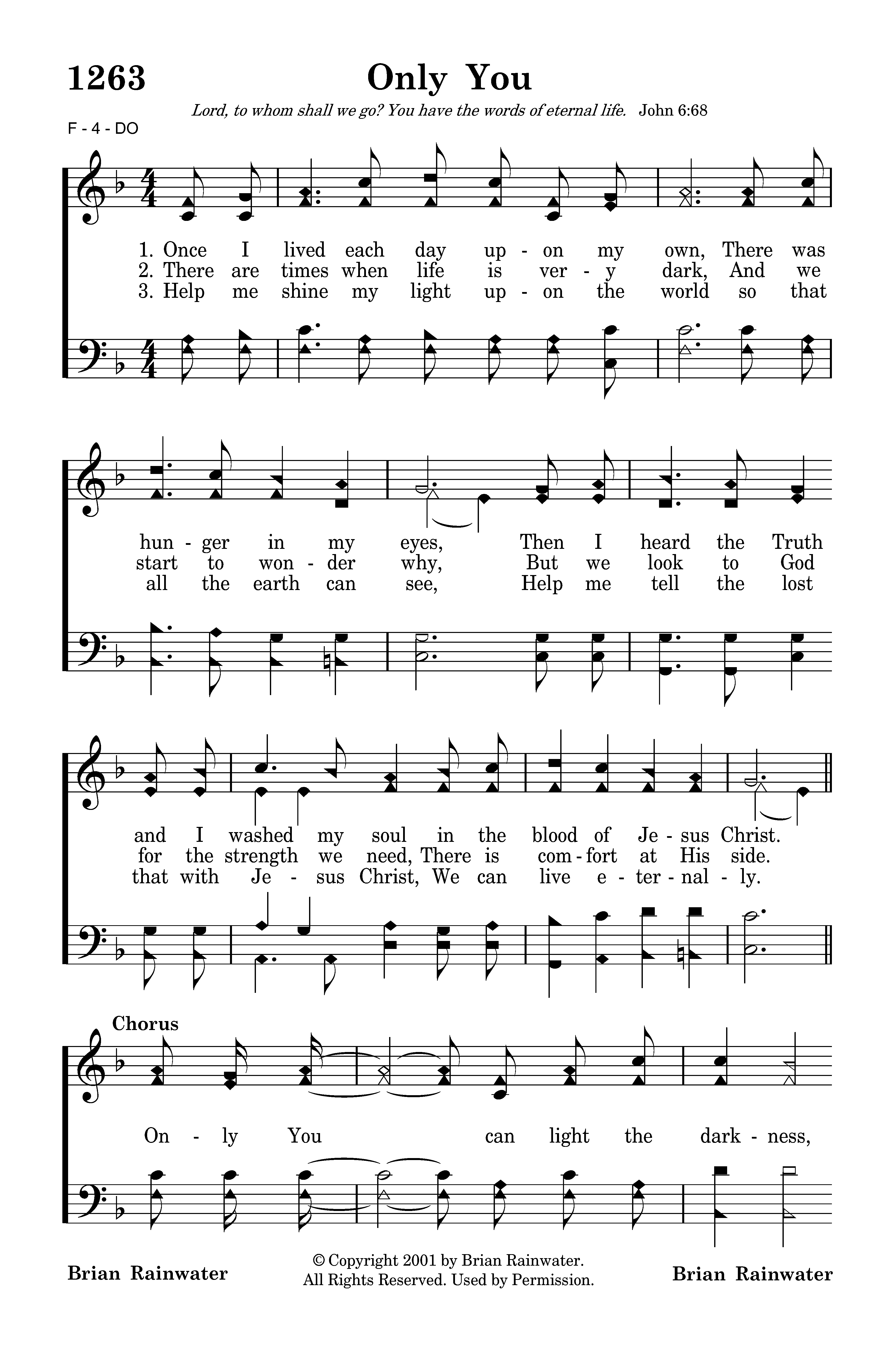 There are times when life is very dark, And we start to wonder why, But we look to God for the strength we need, There is comfort at His side. Only You can light the darkness, Only You can give my heart rest, Only You can change my life; Only You can bring salvation from above, Only You can bless creation with Your love, Only You can save my soul, Only You.