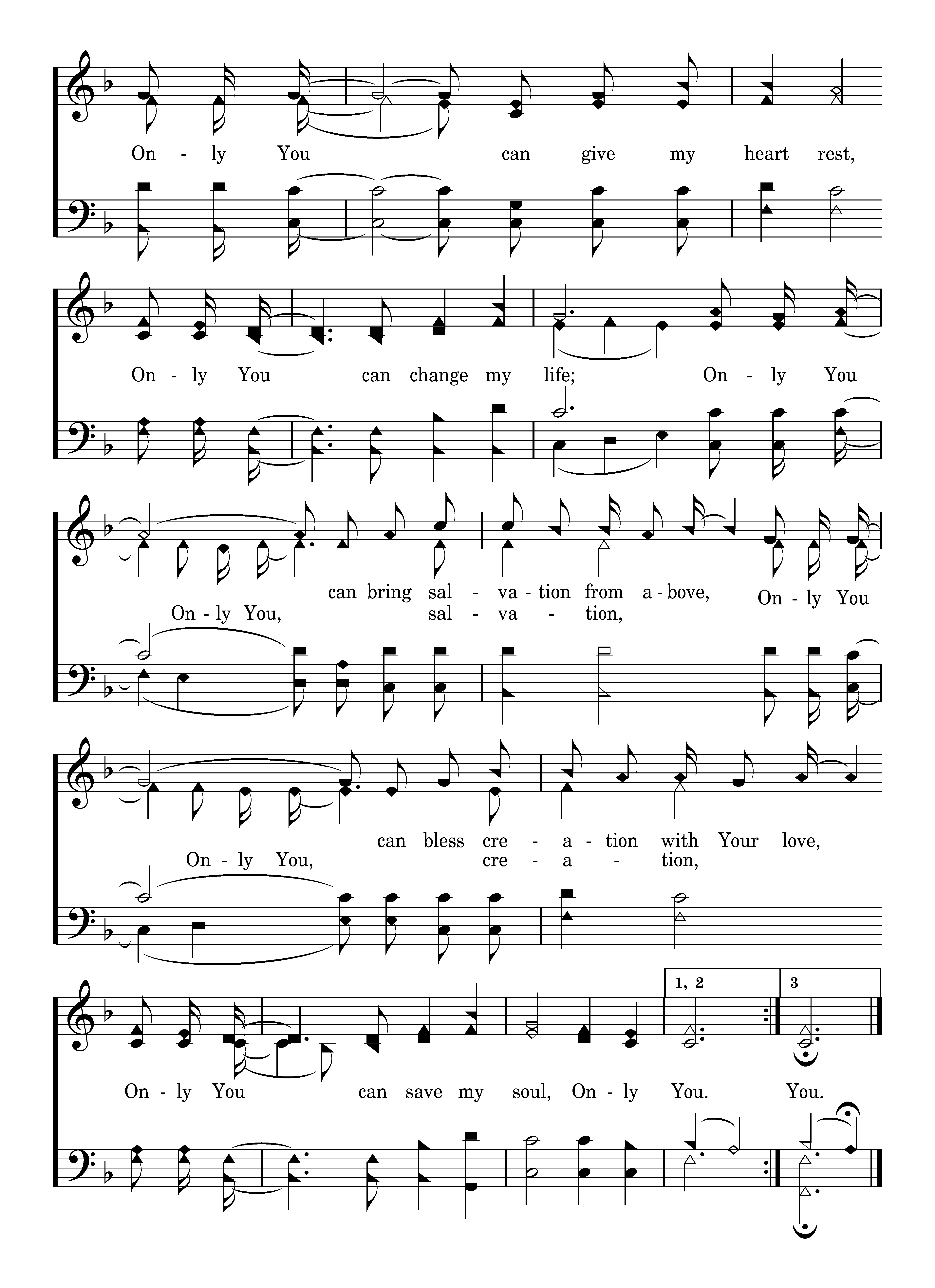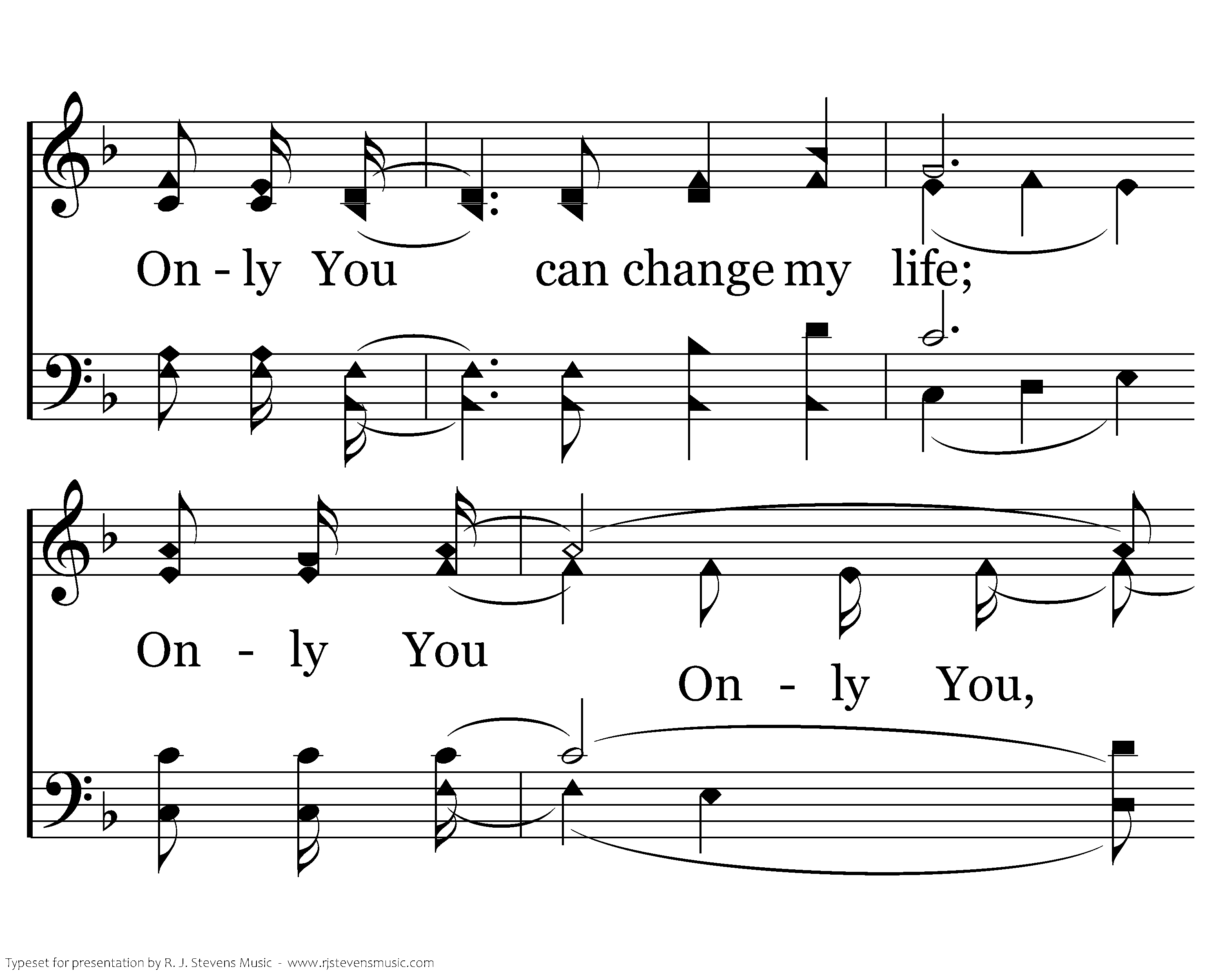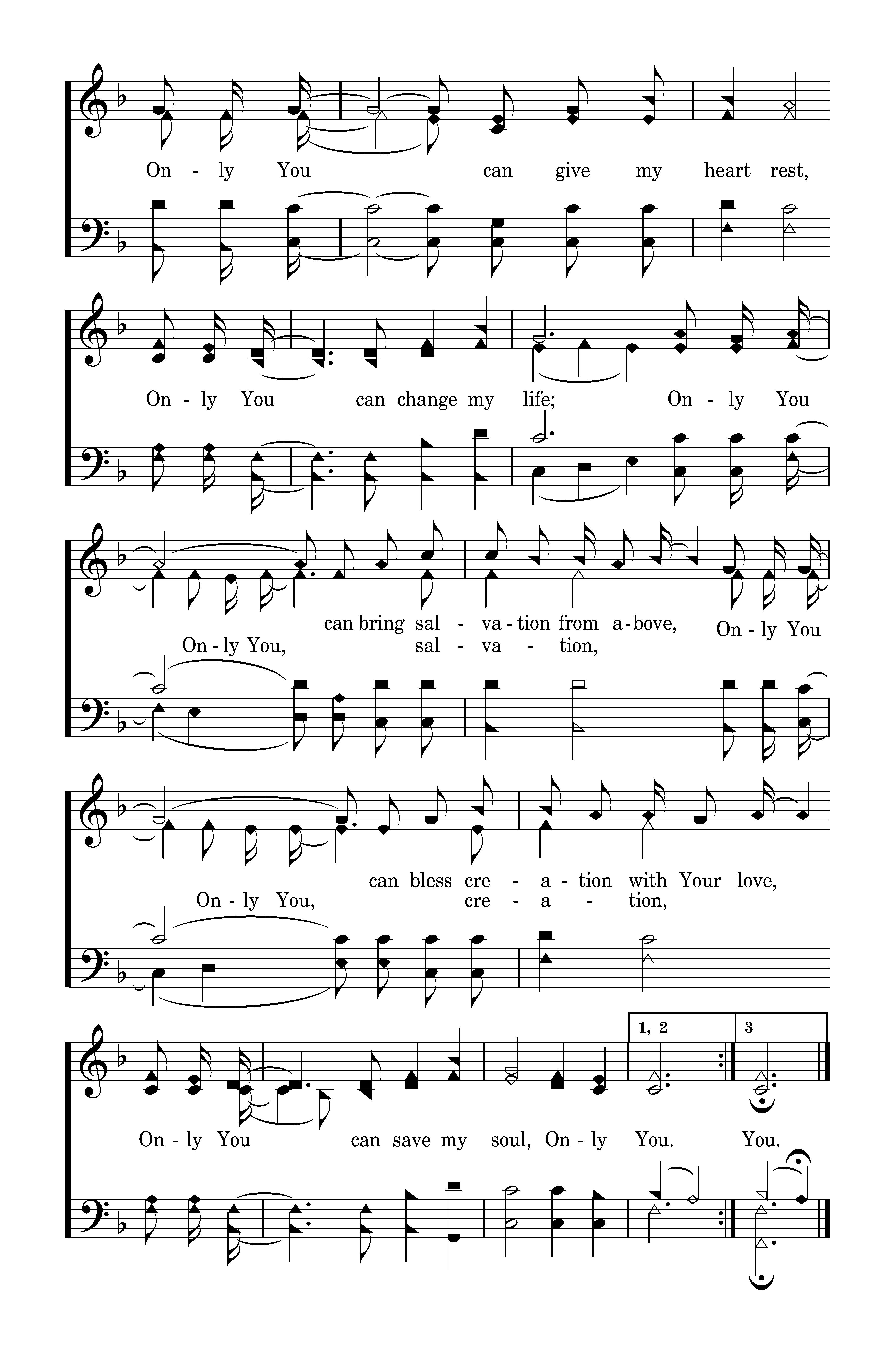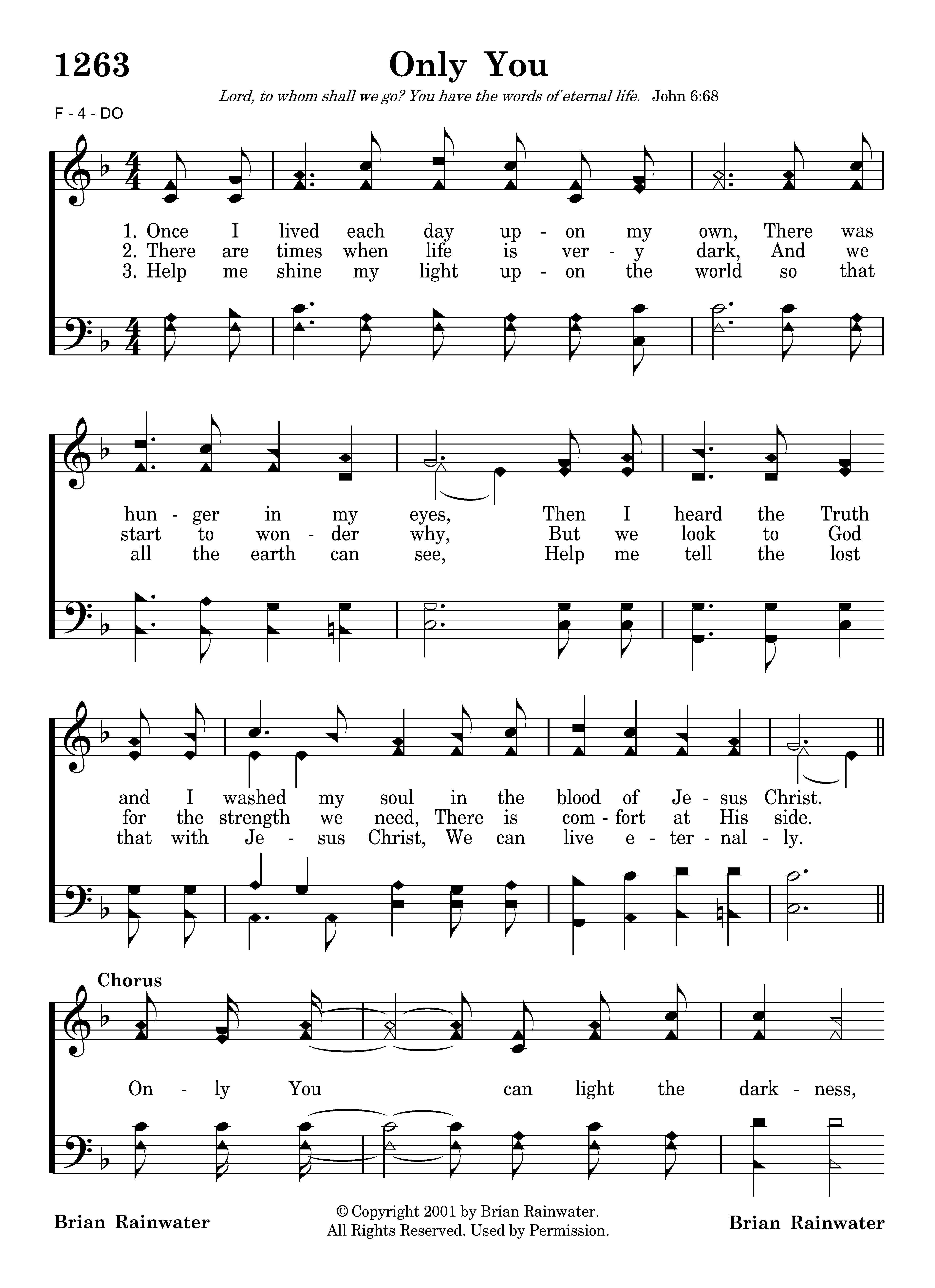 Once I lived each day upon my own, There was hunger in my eyes, Then I heard the Truth and I washed my soul in the blood of Jesus Christ. Only You can light the darkness, Only You can give my heart rest, Only You can change my life; Only You can bring salvation from above, Only You can bless creation with Your love, Only You can save my soul, Only You.