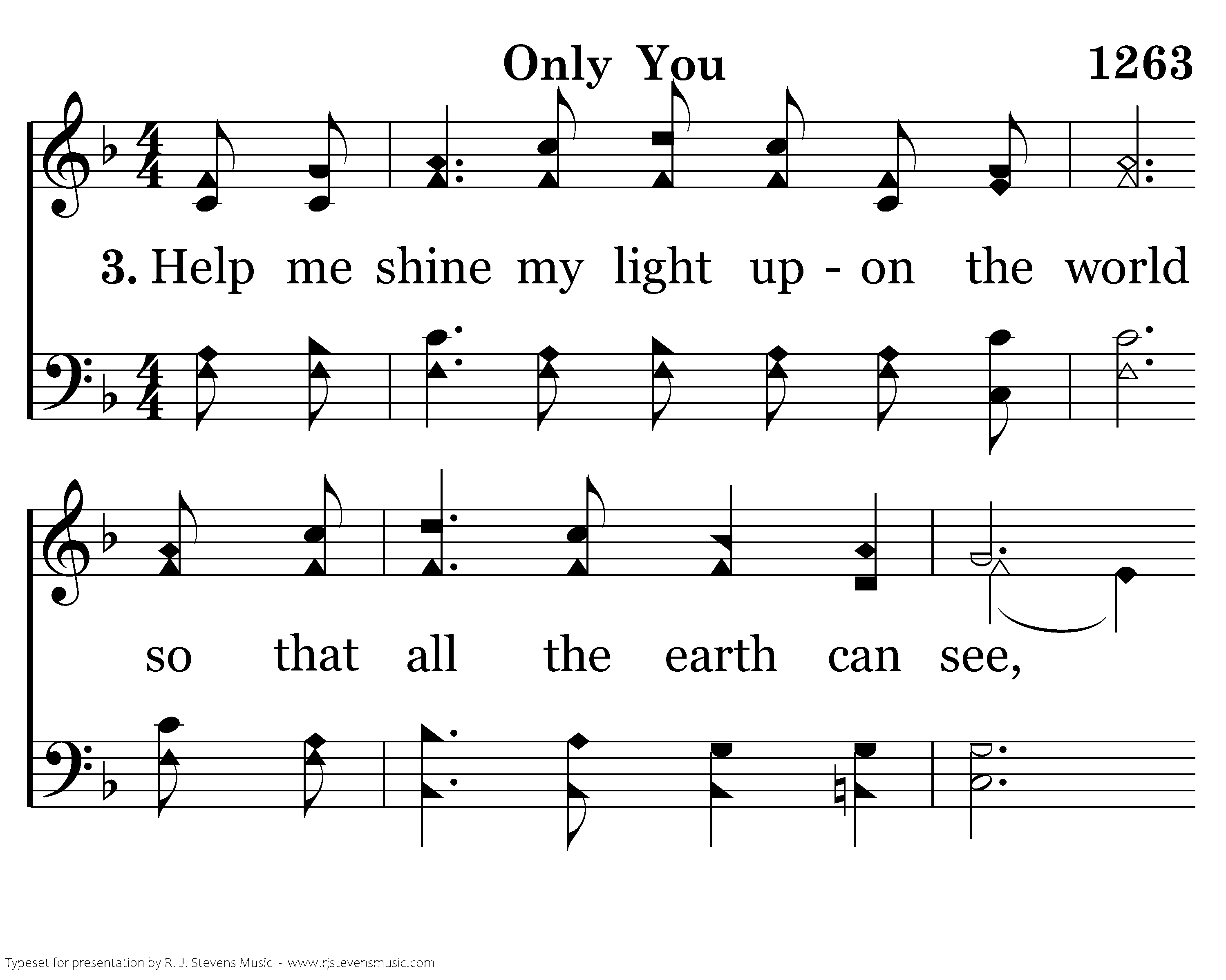 Help me shine my light upon the world so that all the earth can see, Help me tell the lost that with Jesus Christ, We can live eternally. Only You can light the darkness, Only You can give my heart rest, Only You can change my life; Only You can bring salvation from above, Only You can bless creation with Your love, Only You can save my soul, Only You.