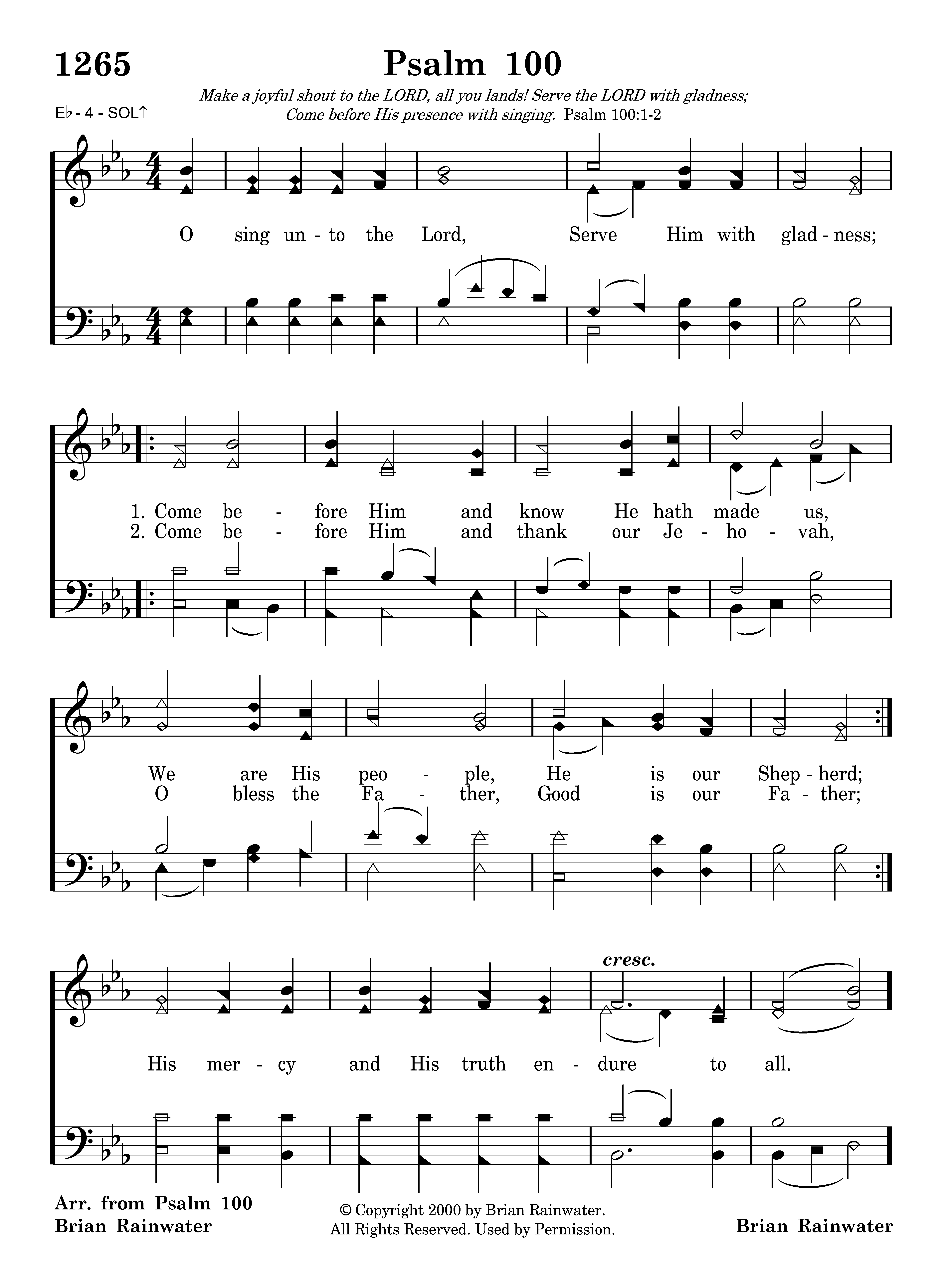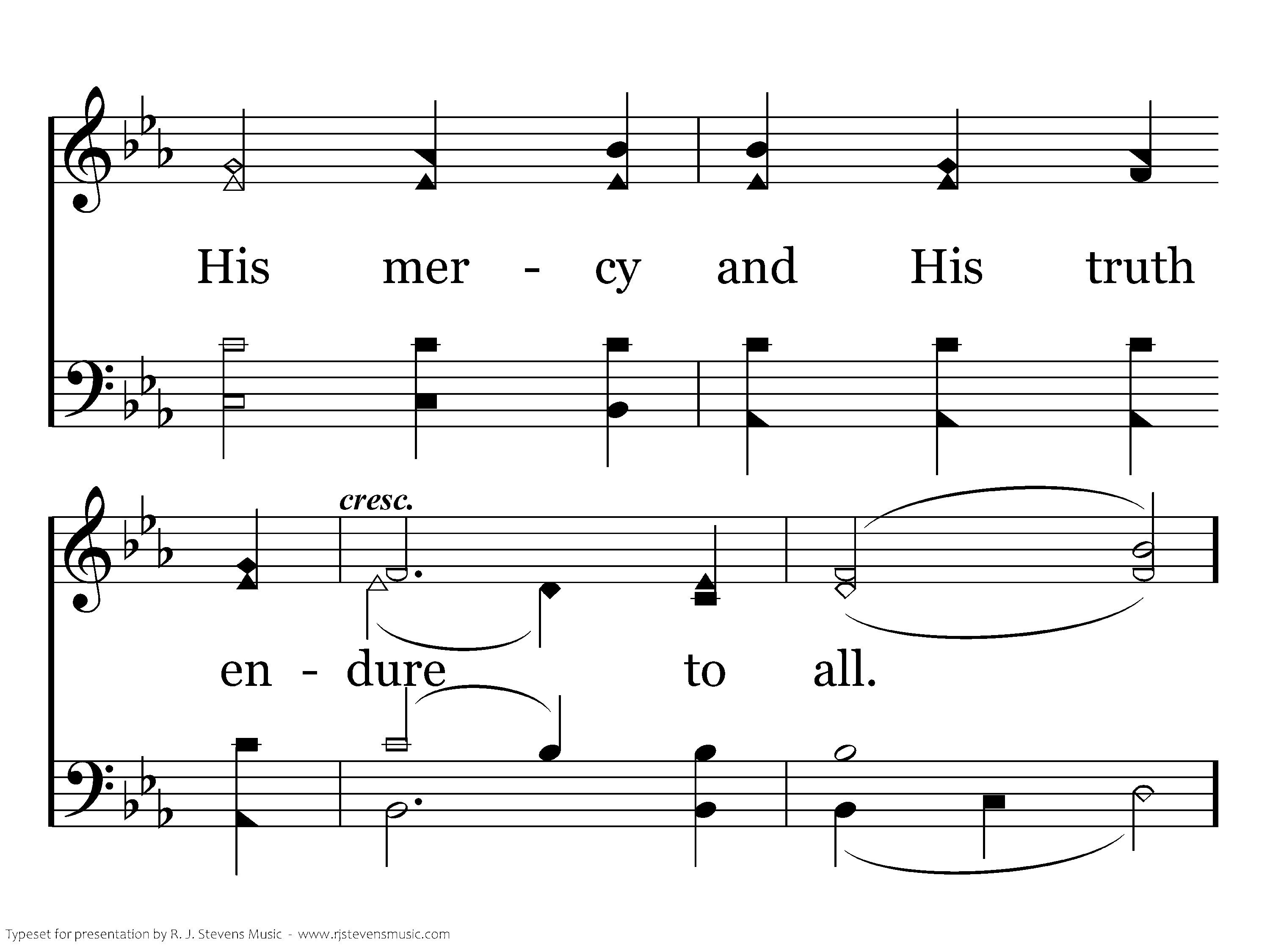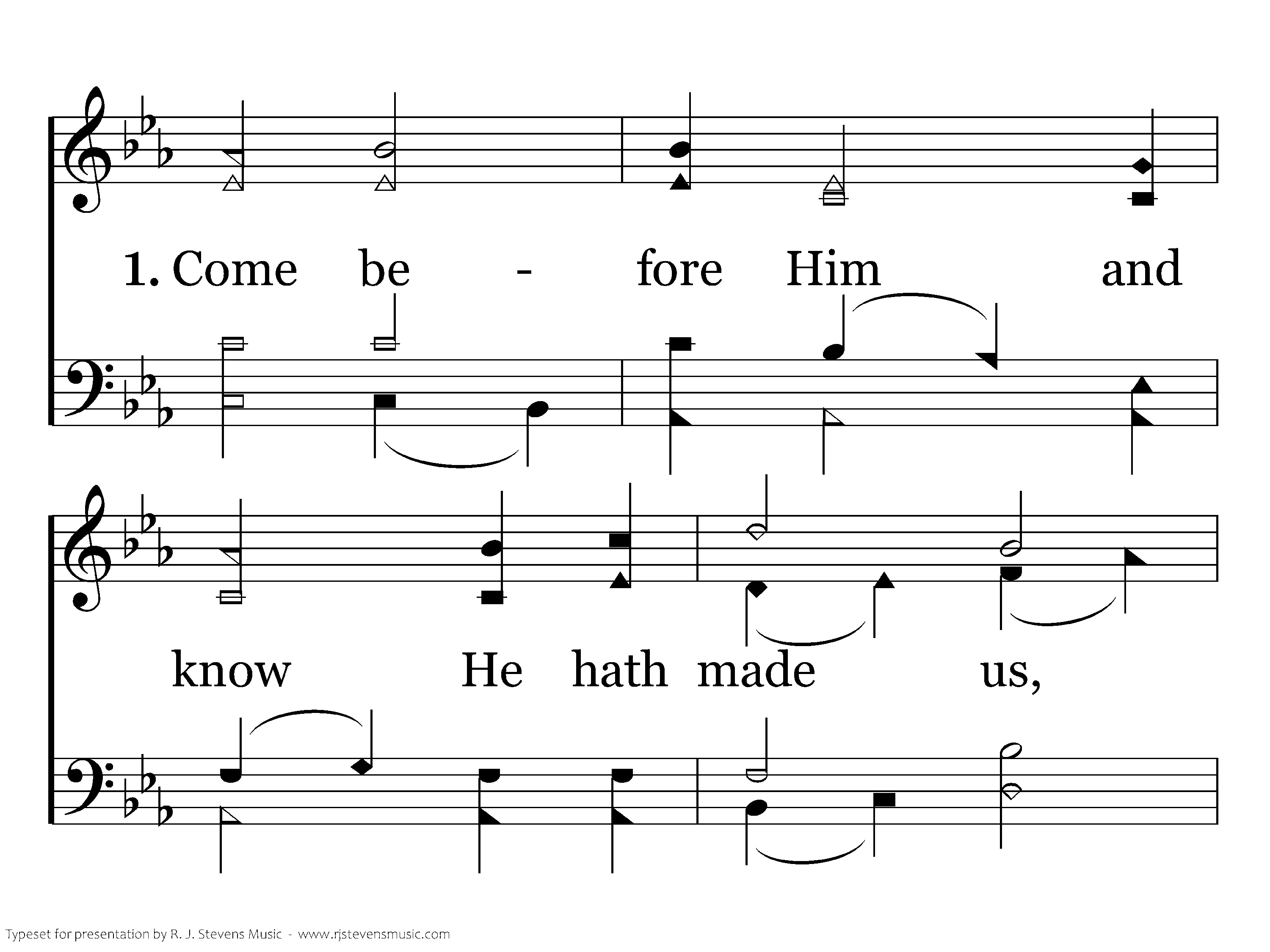 O sing unto the Lord, Serve Him with gladness; Come before Him and know He hath made us, We are His people, He is our Shepherd; Come before Him and thank our Jehovah, O bless the Father, Good is our Father; His mercy and His truth endure to all. Sing unto the Lord! Glory to the Lord! O Praise Jehovah! Forevermore! Amen! Amen!