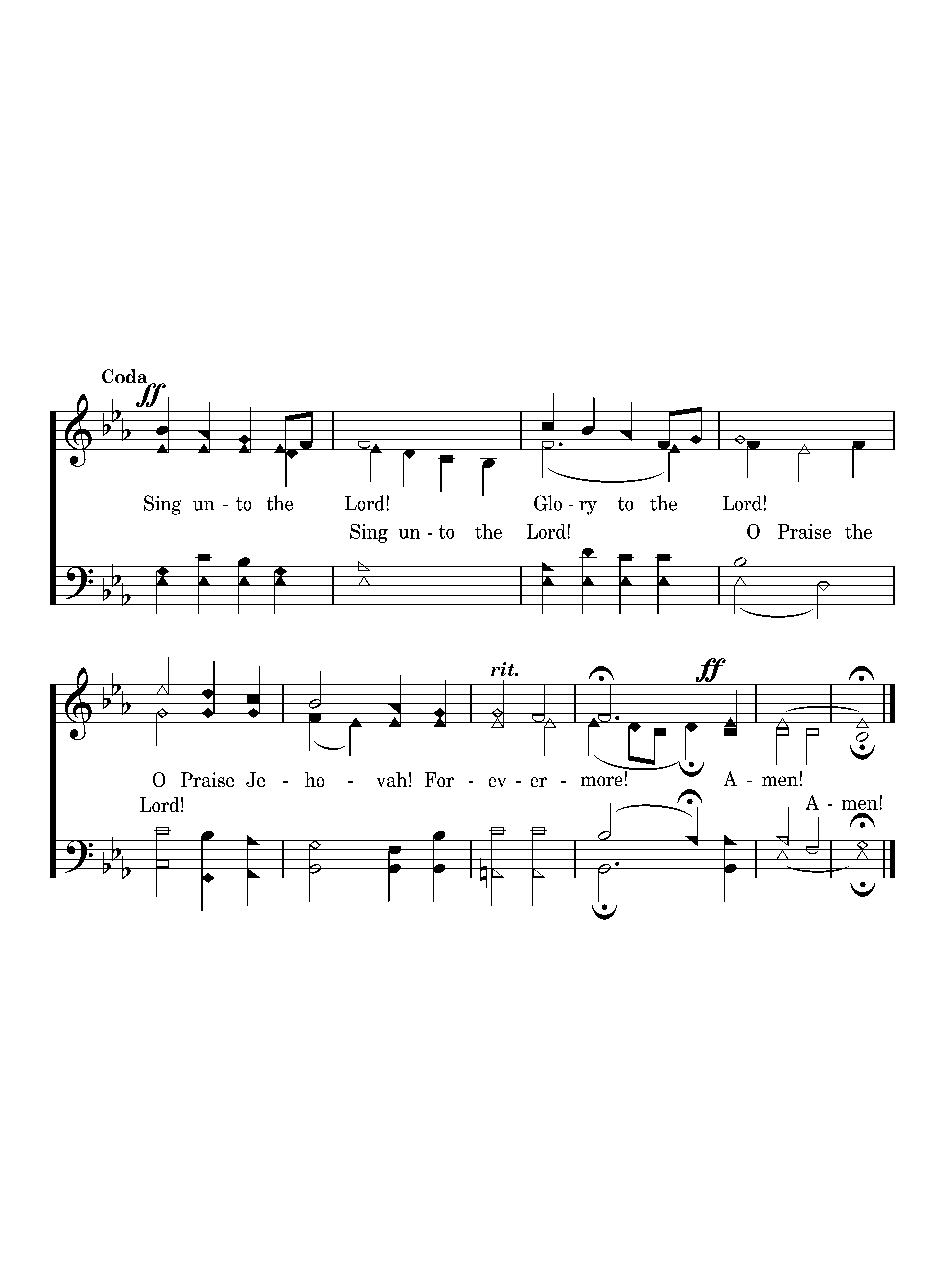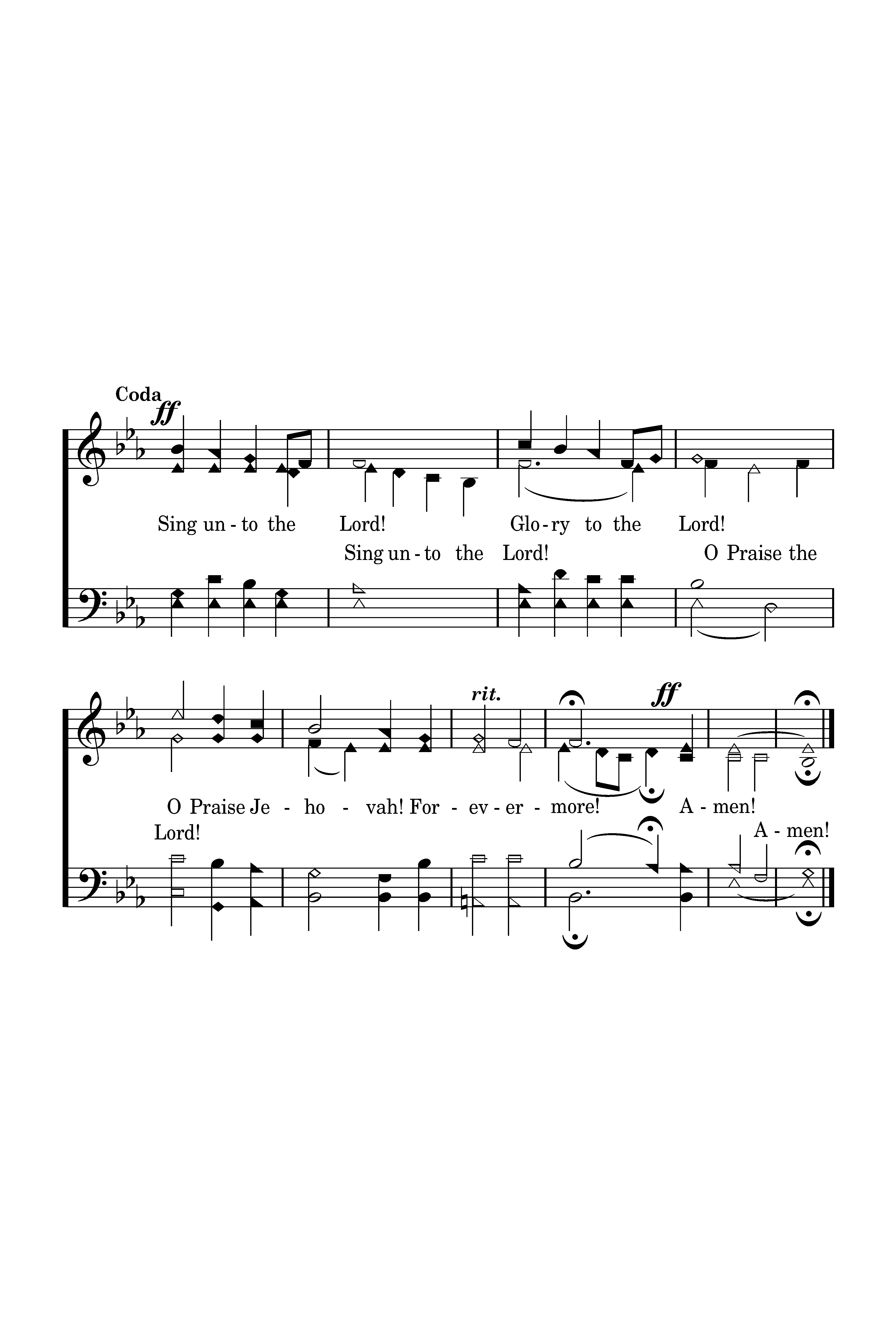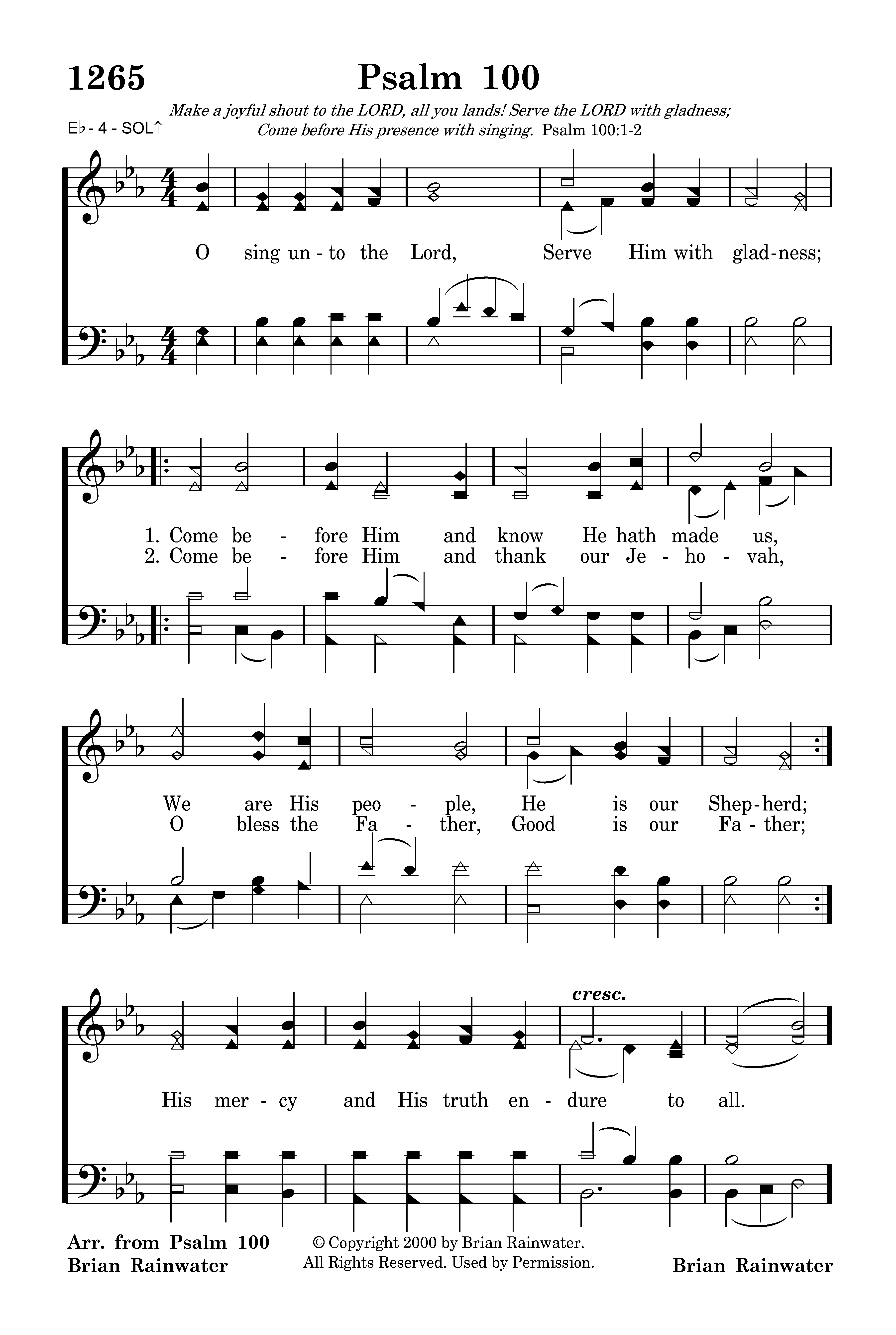 O sing unto the Lord, Serve Him with gladness; Come before Him and know He hath made us, We are His people, He is our Shepherd; Come before Him and thank our Jehovah, O bless the Father, Good is our Father; His mercy and His truth endure to all. Sing unto the Lord! Glory to the Lord! O Praise Jehovah! Forevermore! Amen! Amen!