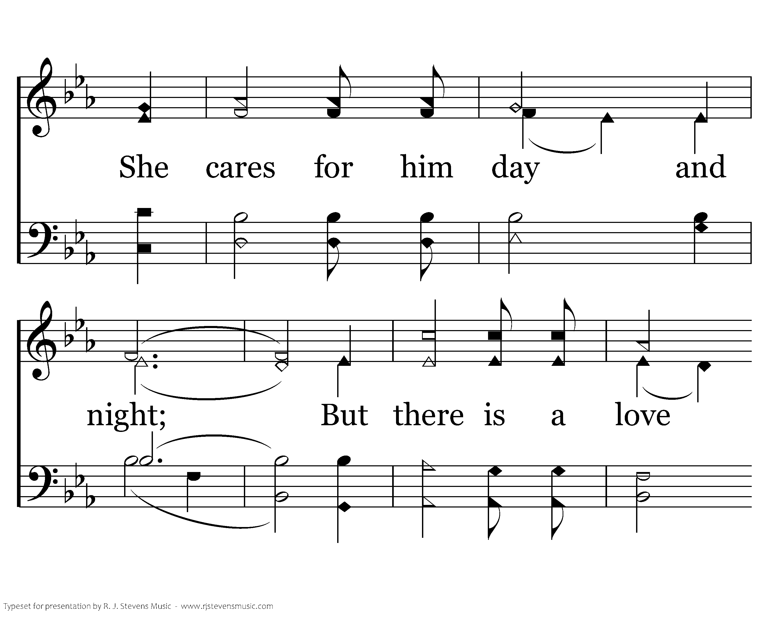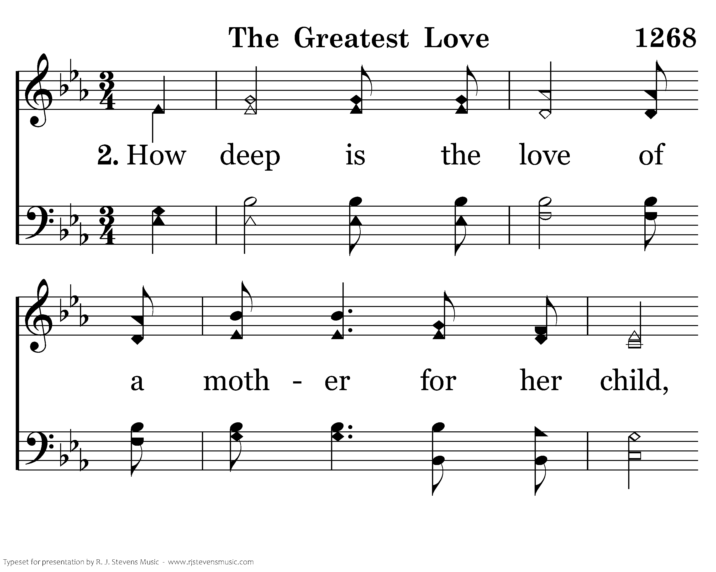 How deep is the love of a mother for her child, she cares for her day and night; But there is a love that is greater still, It lasts thru the end of time.