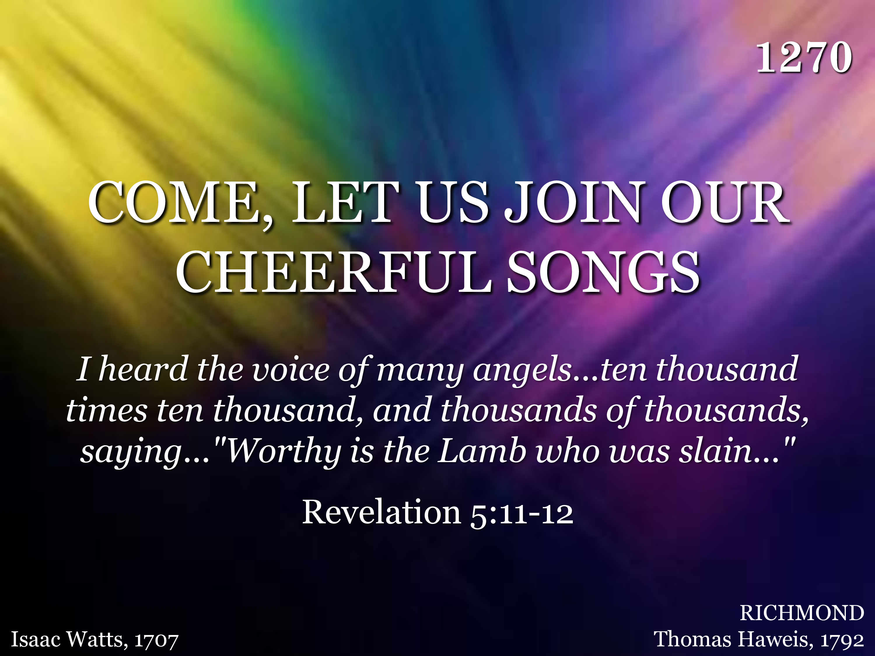 Come, let us join our cheerful songs With angels round the throne; Ten thousand thousand are their tongues, But all their joys are one.