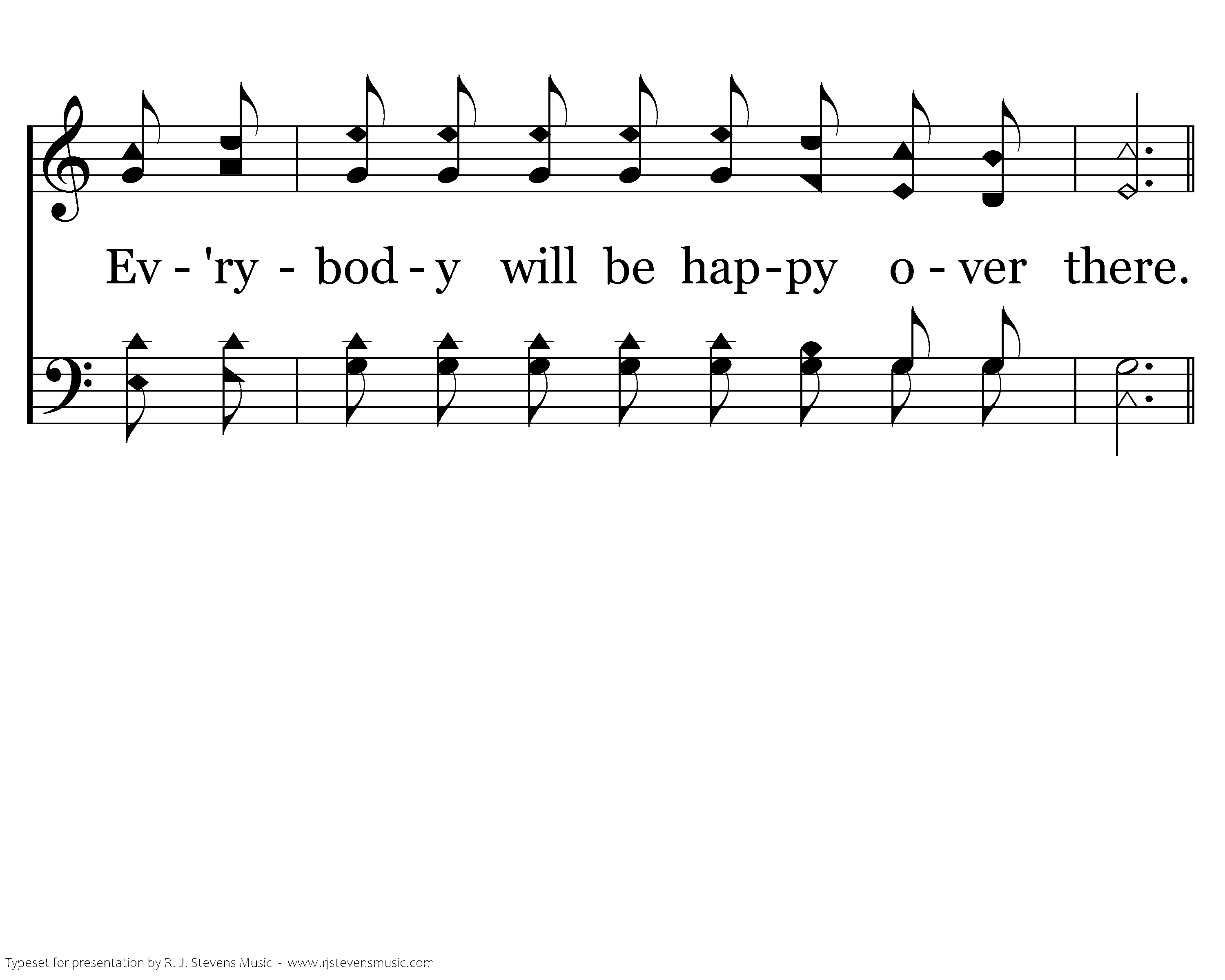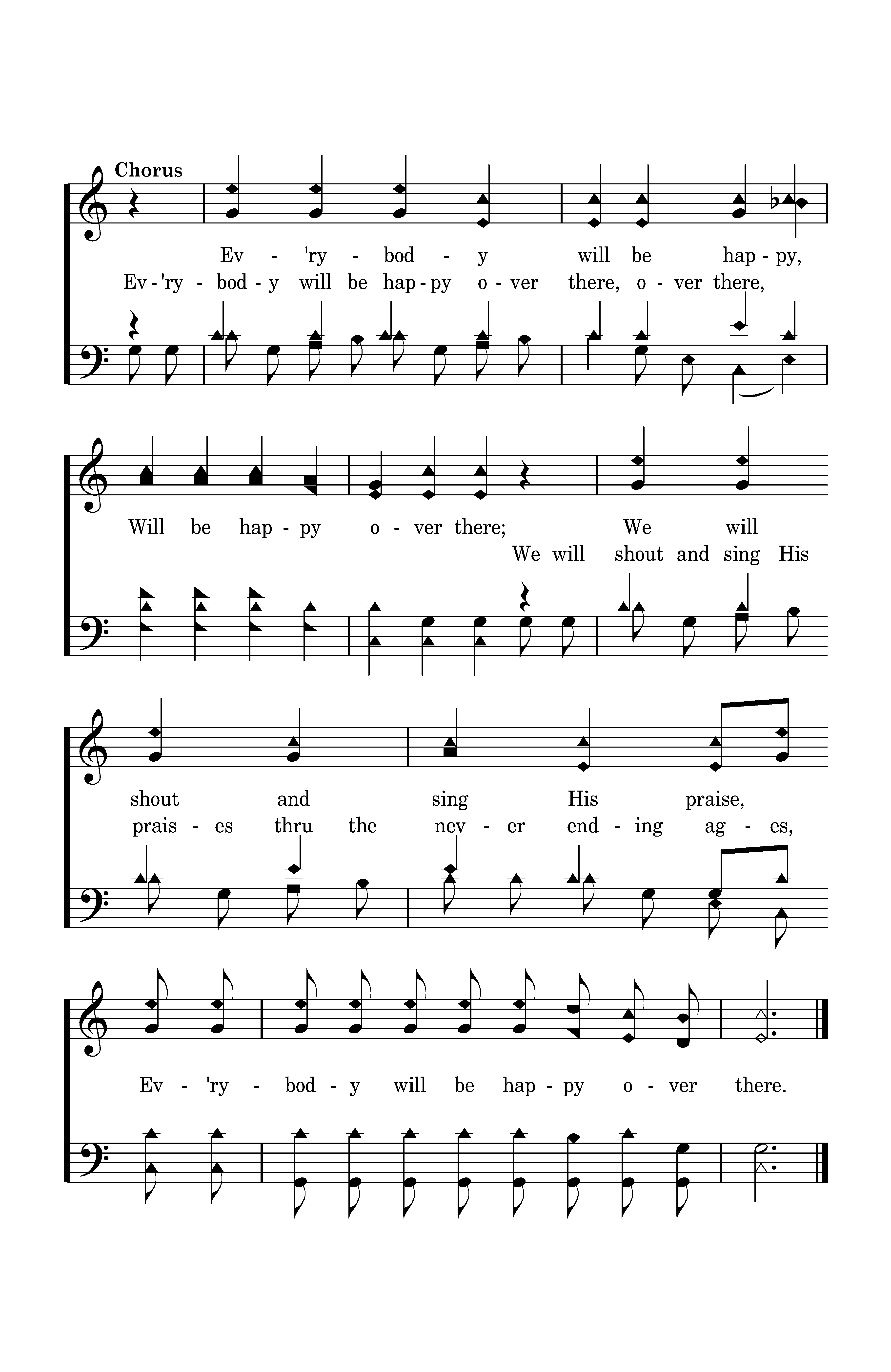 Ev'rybody will be happy over there, over there, We will shout and sing His praises thru the never ending ages, Ev'rybody will be happy, Will be happy over there; We will shout and sing His praise, Ev'rybody will be happy over there.