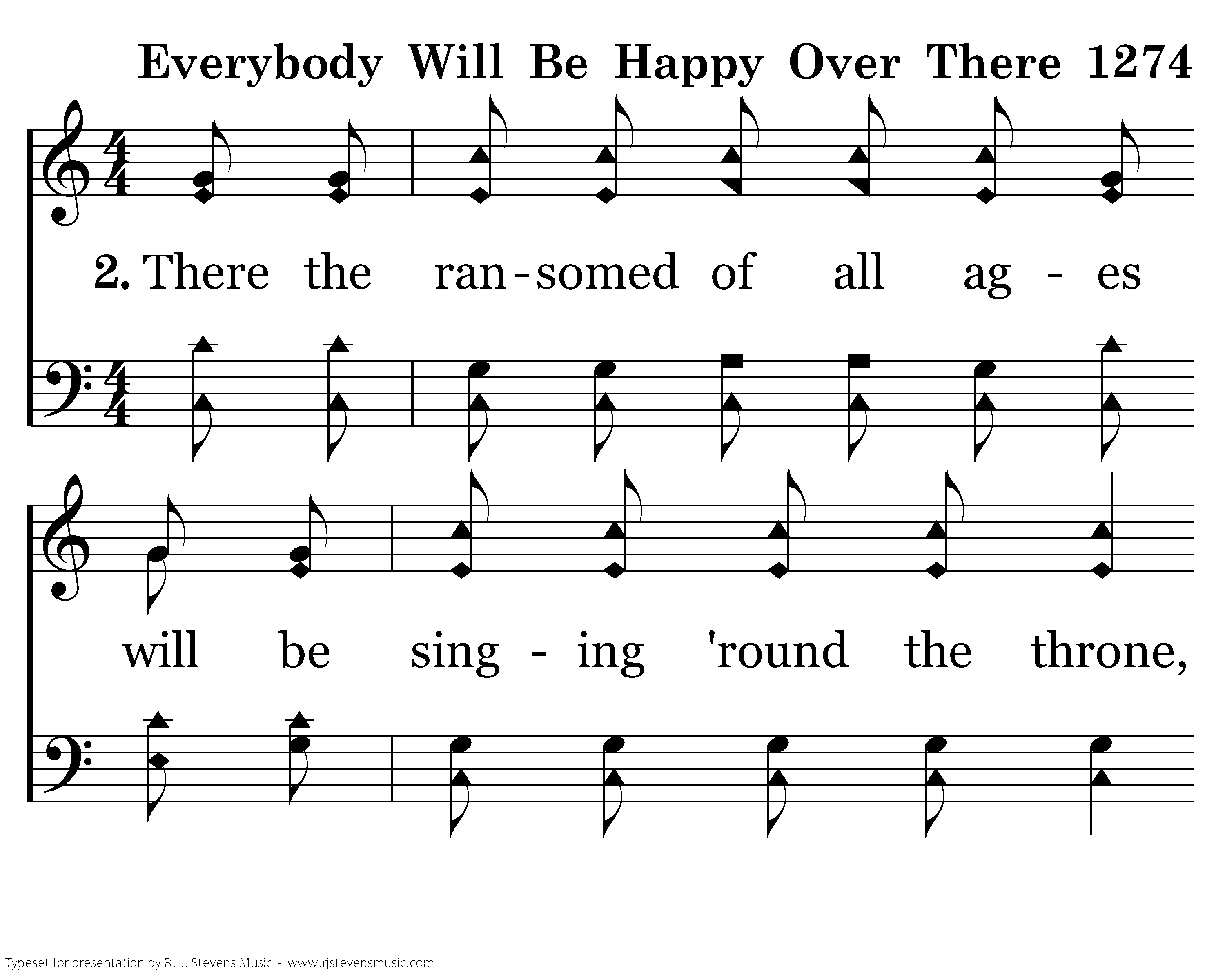 There the ransomed of all ages will be singing 'round the throne, In that land where no one ever knows a care; And the Christians of all nations will join in the triumph song, Ev'rybody will be happy over there.