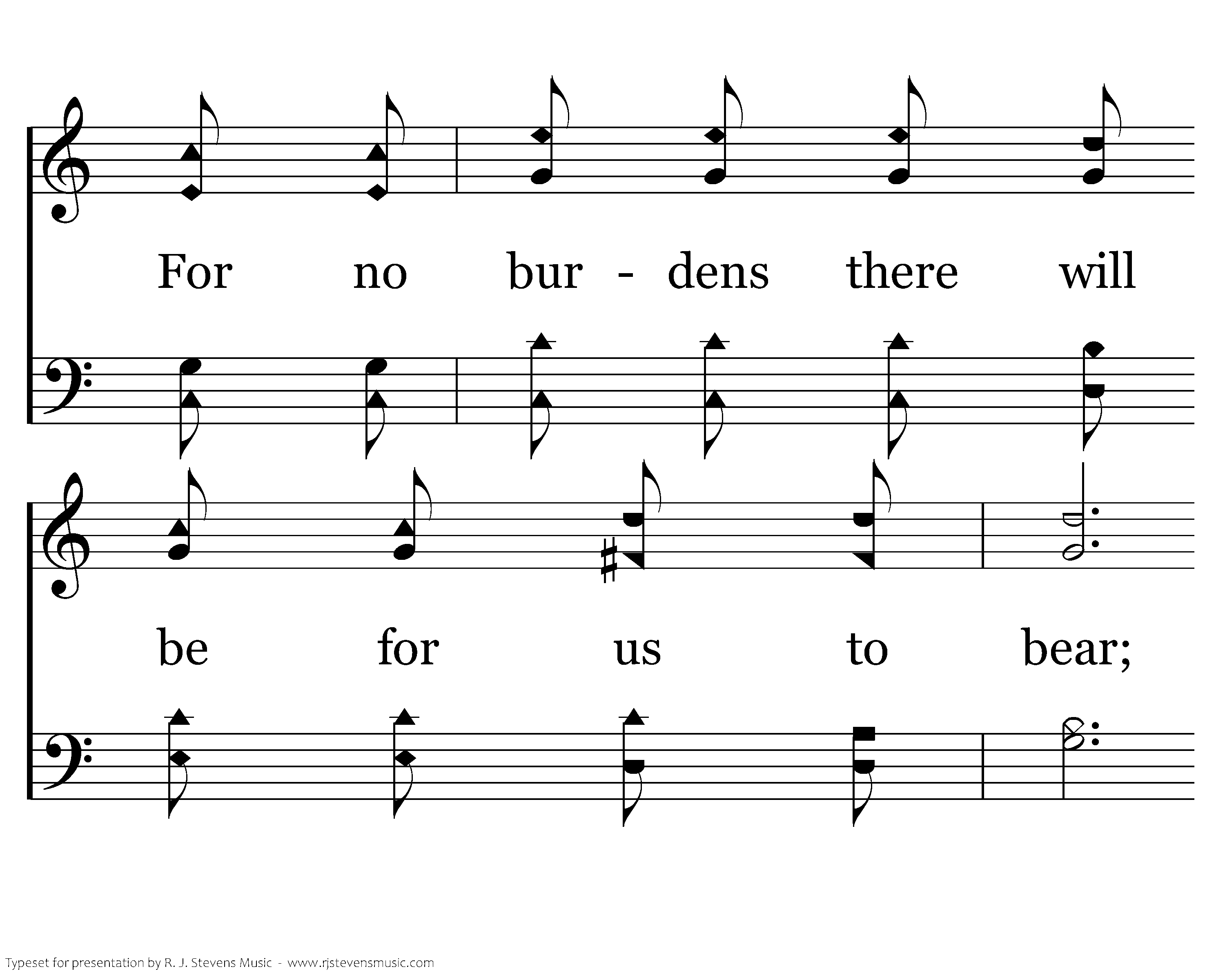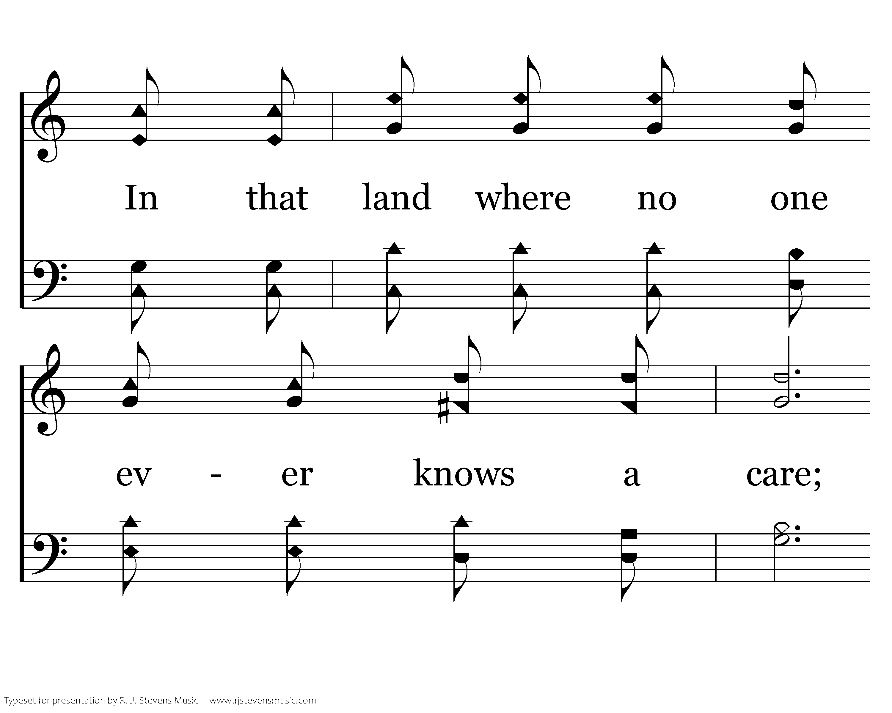 We will hear nobody praying and no mourning in that land, For no burdens there will be for us to bear; All the people will be singing "Glory, glory to the Lamb," Ev'rybody will be happy over there.