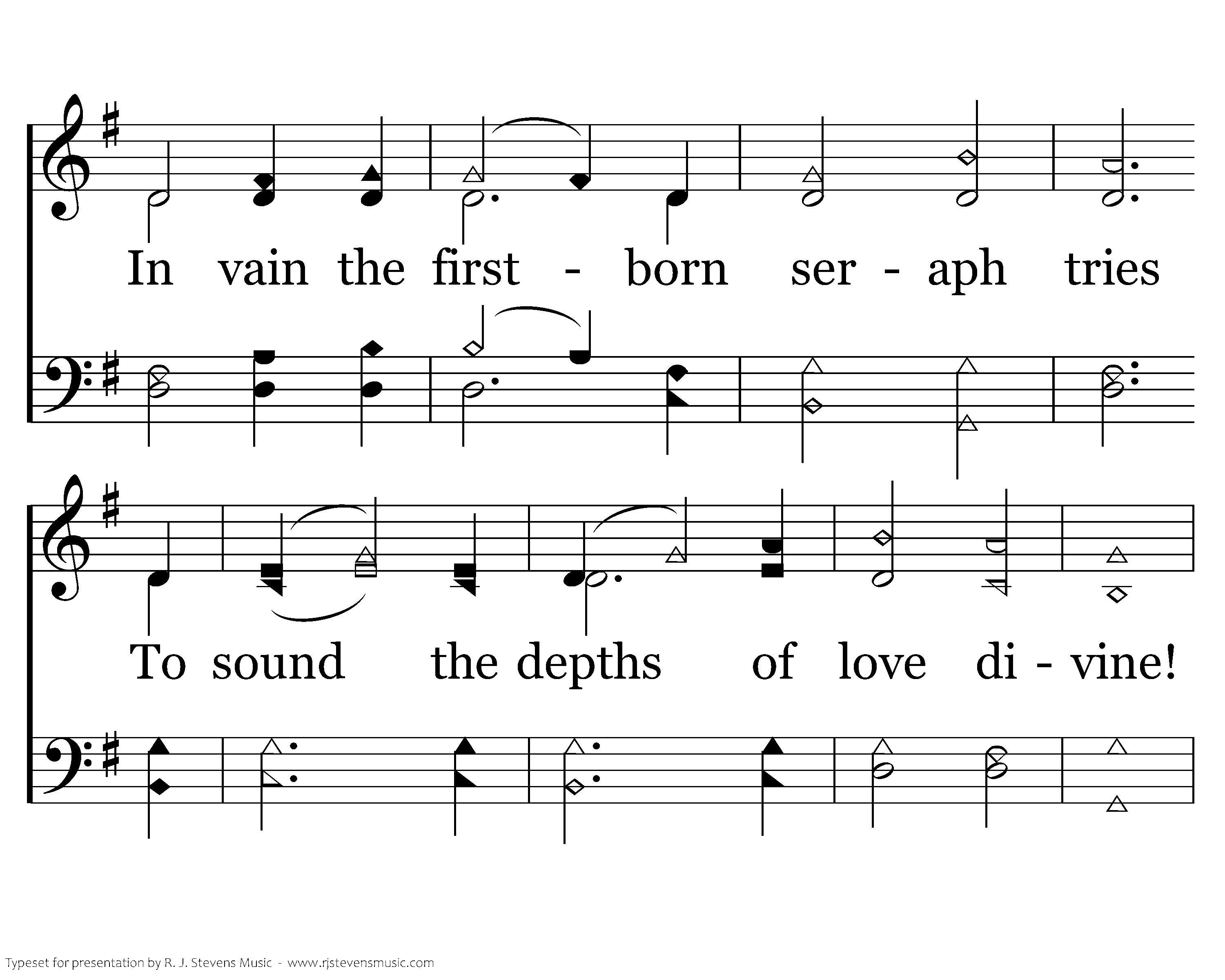 Tis myst'ry all! Th'Immortal dies! Who can explore His strange design? In vain the firstborn seraph tries To sound the depths of love divine! 'Tis mercy all! Let earth adore, Let angel minds inquire no more.