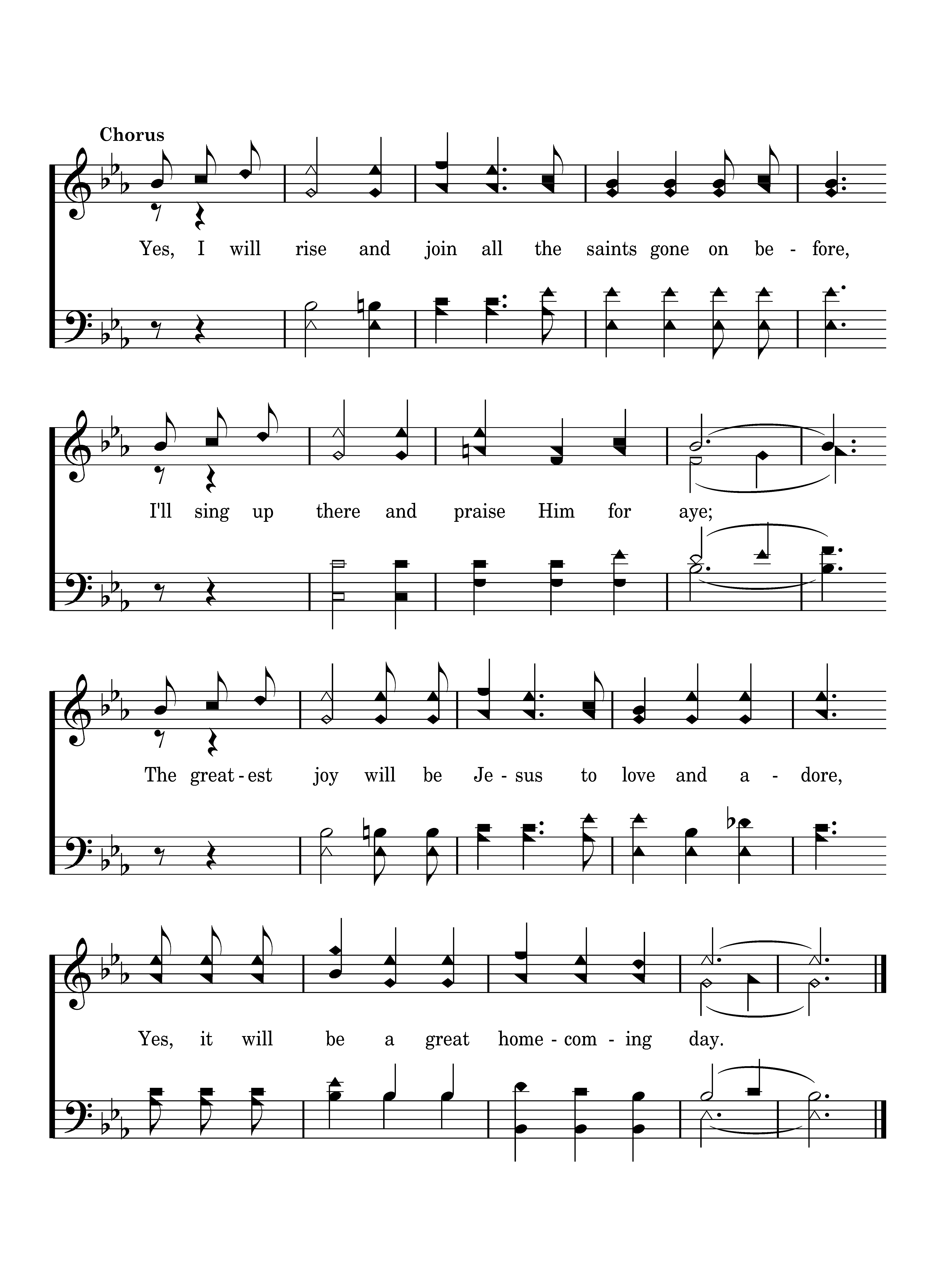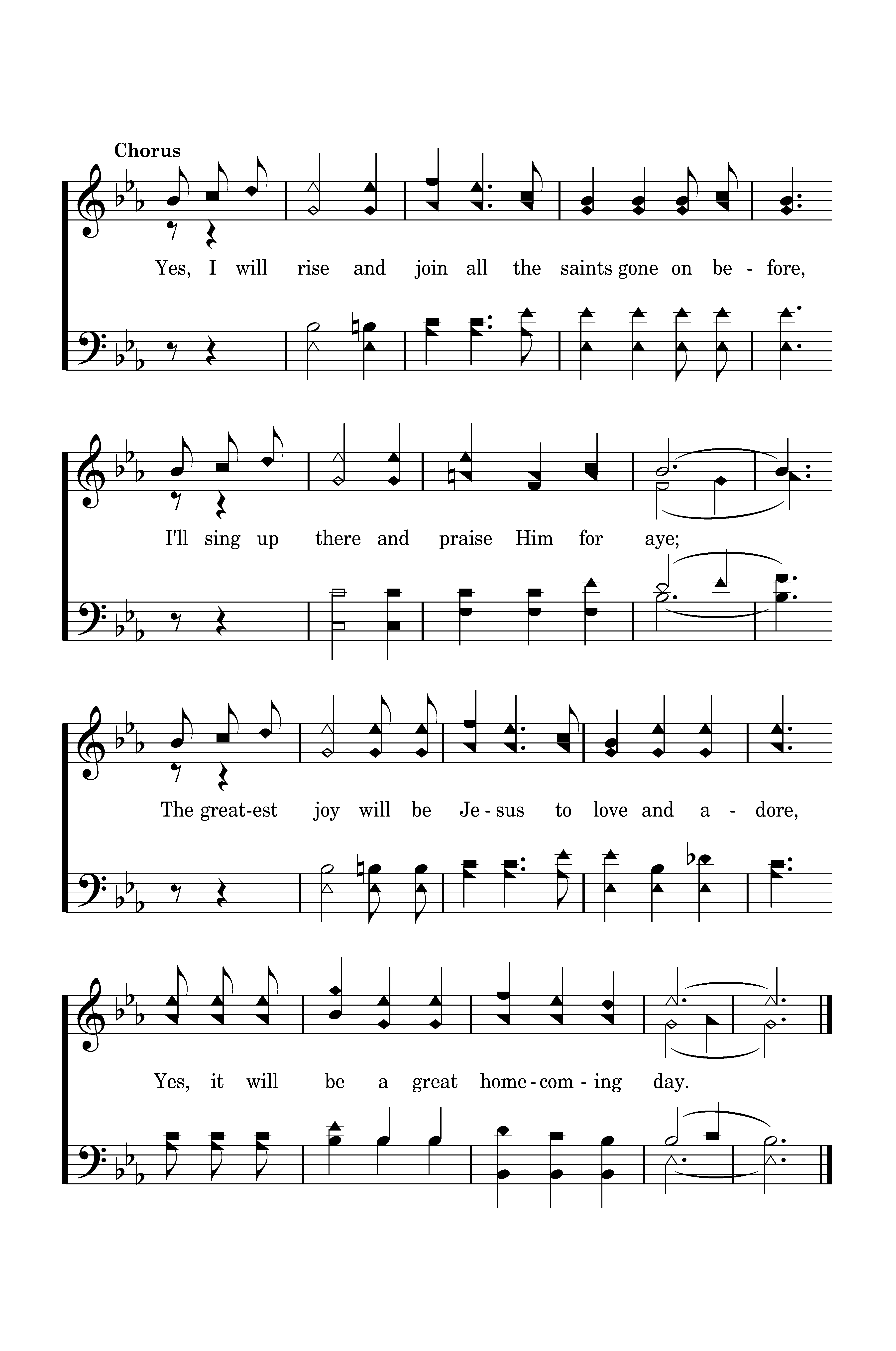 Yes, I will rise and join all the saints gone on before, I'll sing up there and praise Him for aye; The greatest joy will be Jesus to love and adore, Yes, it will be a great homecoming day.