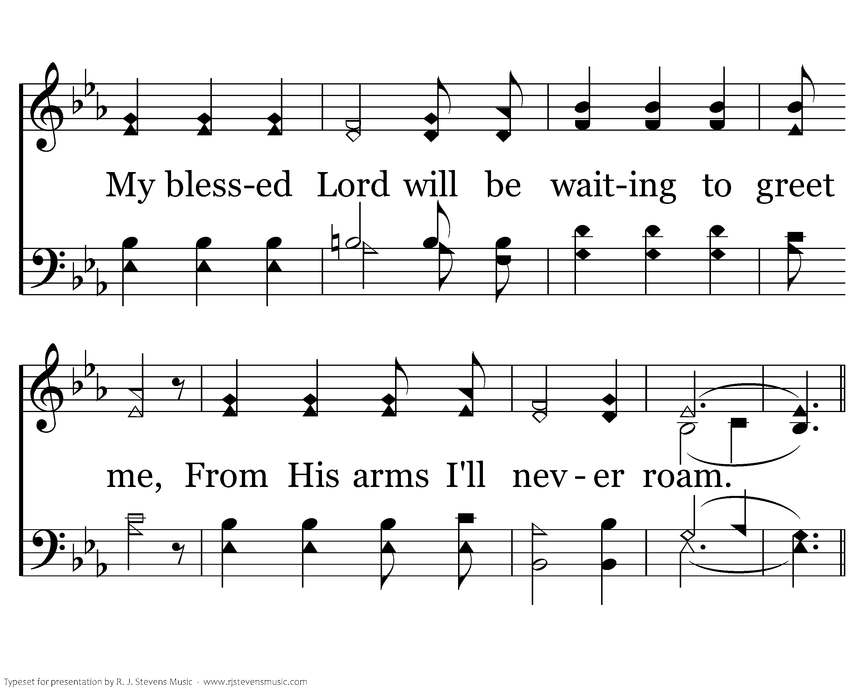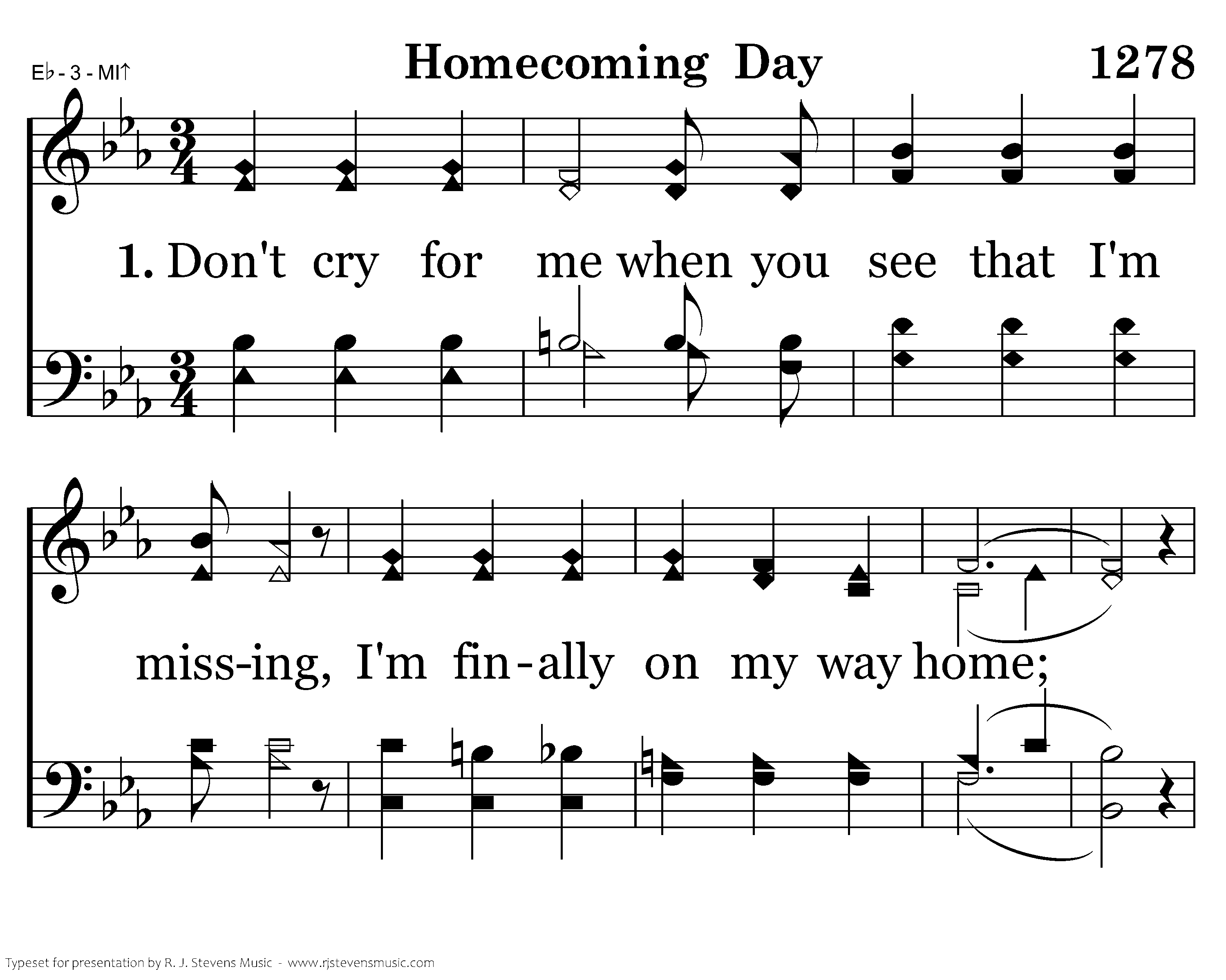 Don't cry for me when you see that I'm missing, I'm finally on my way home; My blessed Lord will be waiting to greet me, From His arms I'll never roam.
