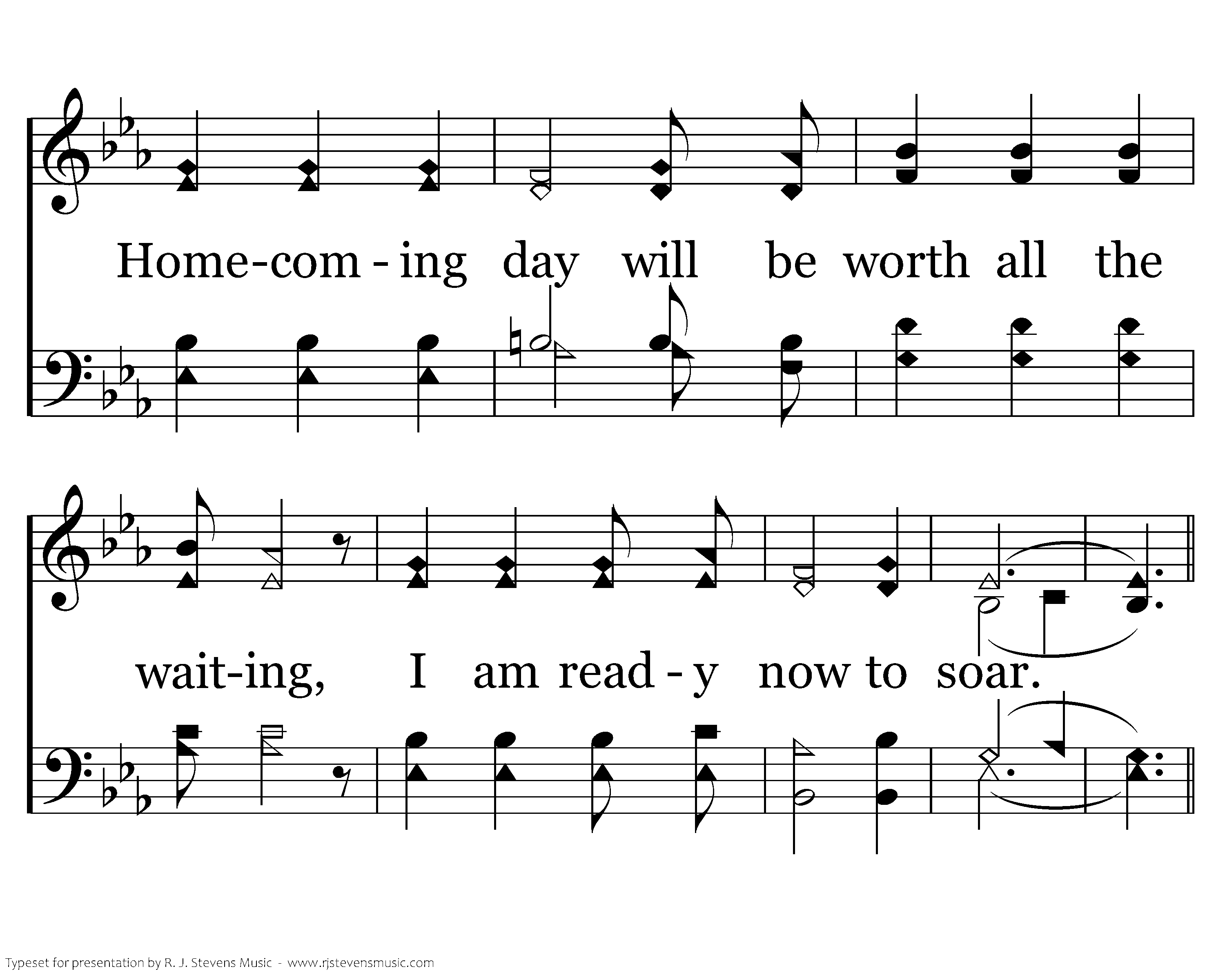 I'll take my flight to that gloryland city, I'll sing and shout evermore; Homecoming day will be worth all the waiting, I am ready now to soar.
