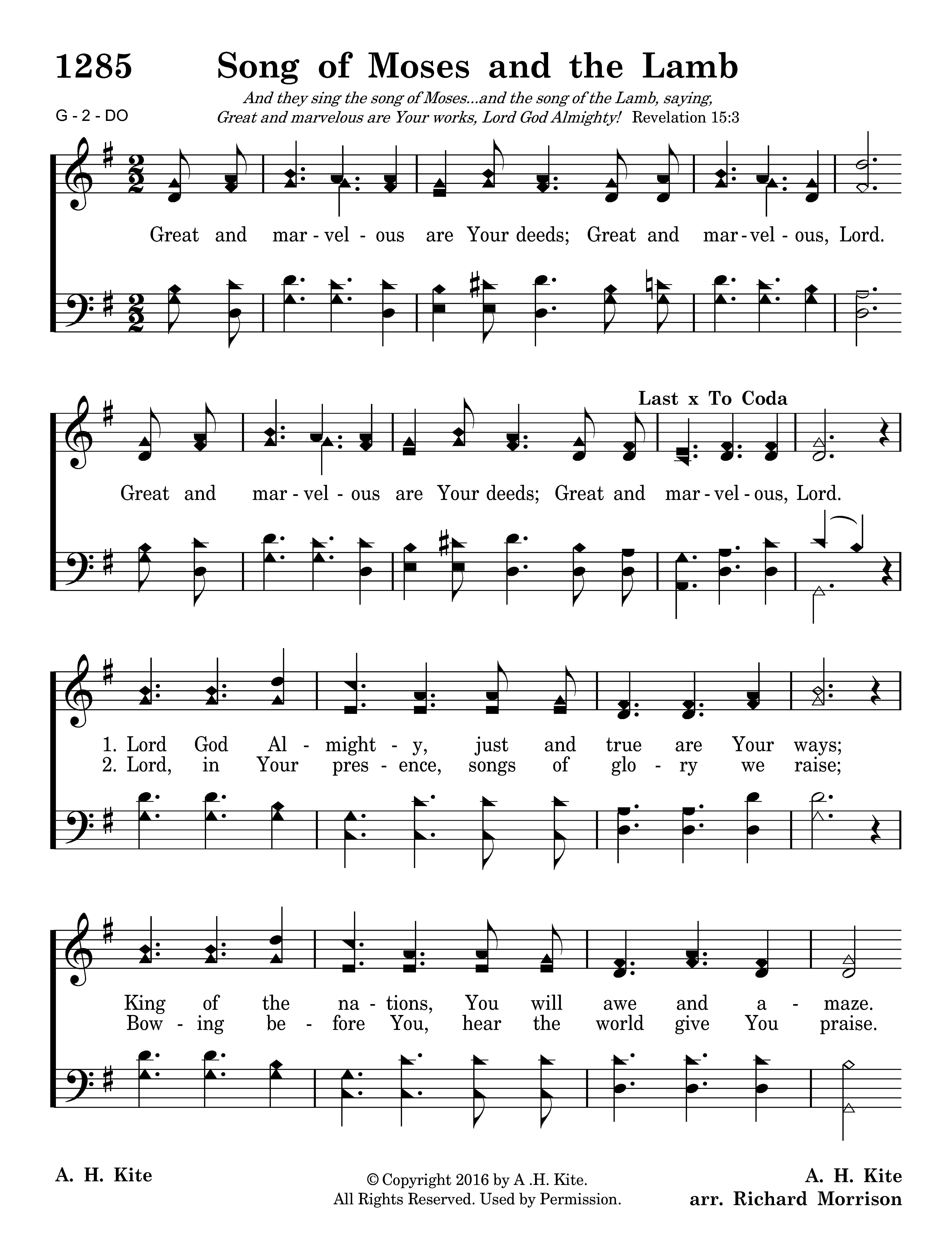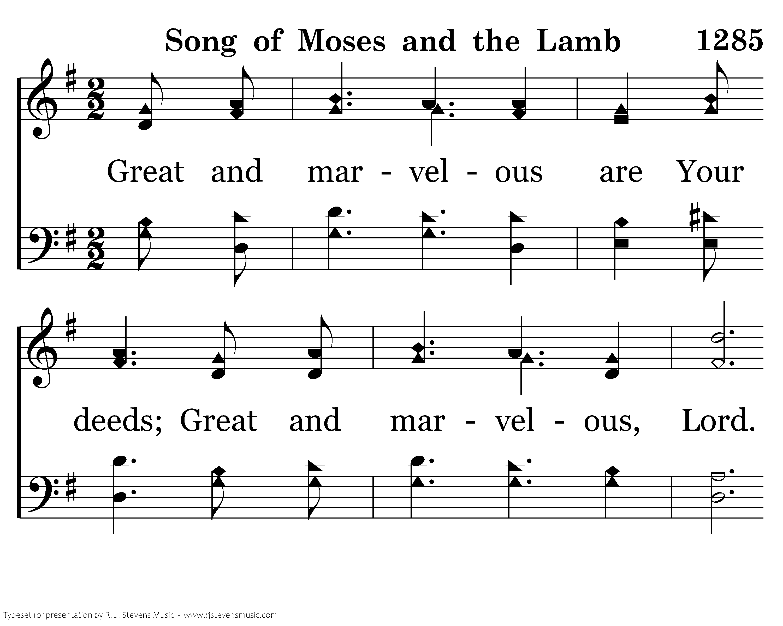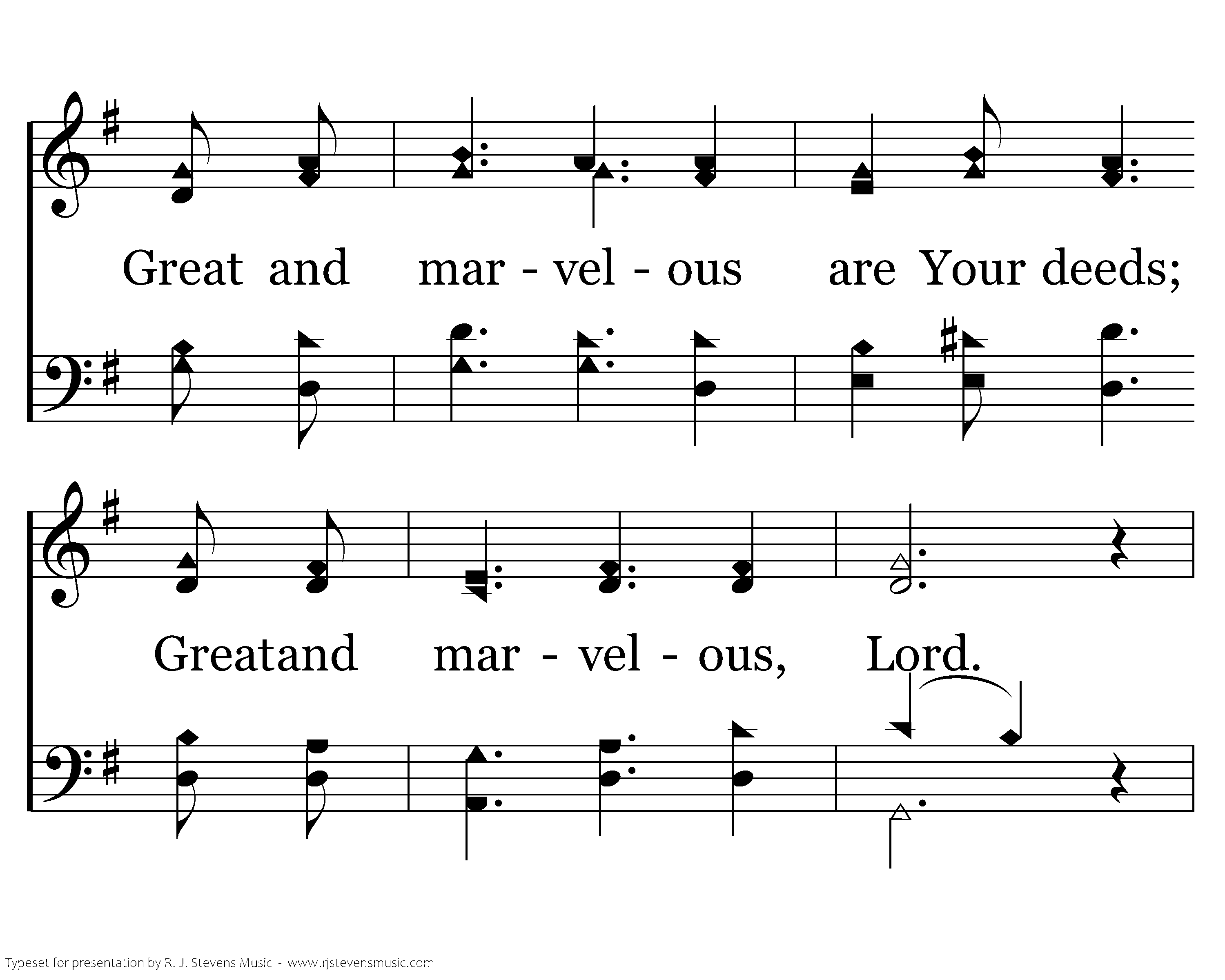 Great and marvelous are Your deeds; Great and marvelous, Lord. Great and marvelous are Your deeds; Great and marvelous, Lord. Lord God Almighty, just and true are Your ways; King of the nations, You will awe and amaze. For You alone are holy. Nations come and worship at Your throne. For all Your righteous acts have been revealed; The glory all is Yours.
