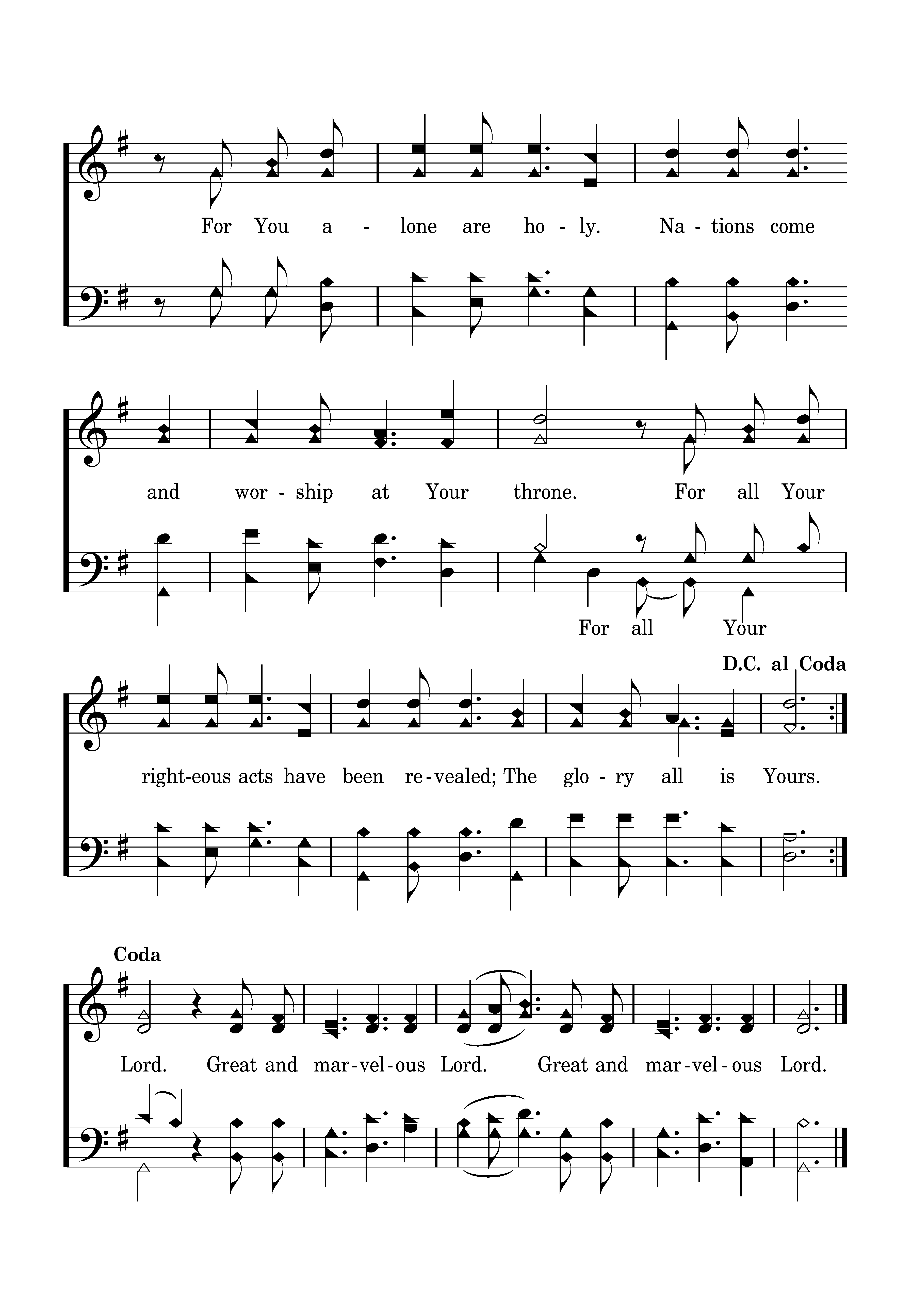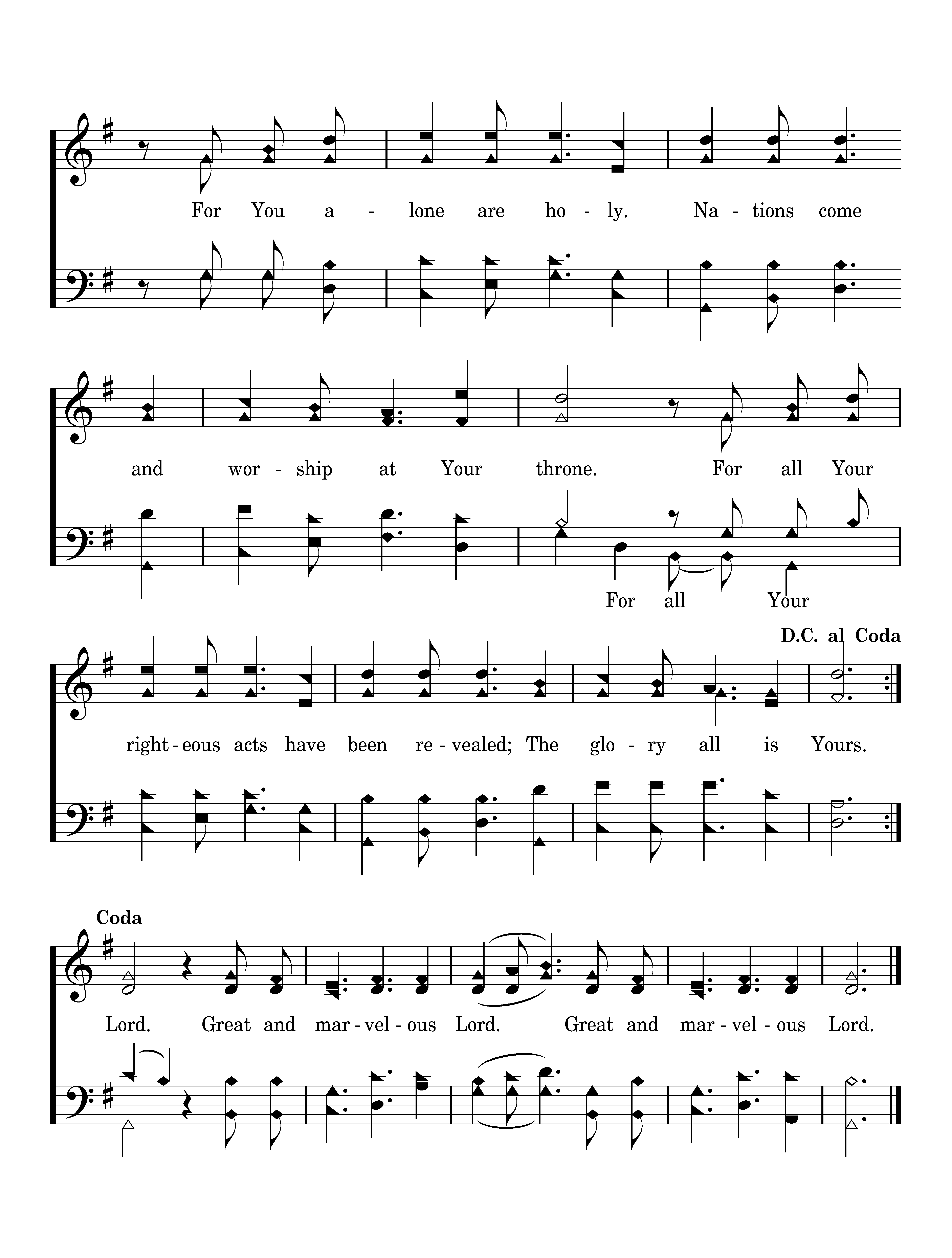 Great and marvelous are Your deeds; Great and marvelous, Lord. Great and marvelous are Your deeds; Great and marvelous, Lord. Lord, in Your presence, songs of glory we raise; Bowing before You, hear the world give You praise. For You alone are holy. Nations come and worship at Your throne. For all Your righteous acts have been revealed; The glory all is Yours. Great and marvelous are Your deeds; Great and marvelous, Lord. Great and marvelous are Your deeds; Great and marvelous, Lord.