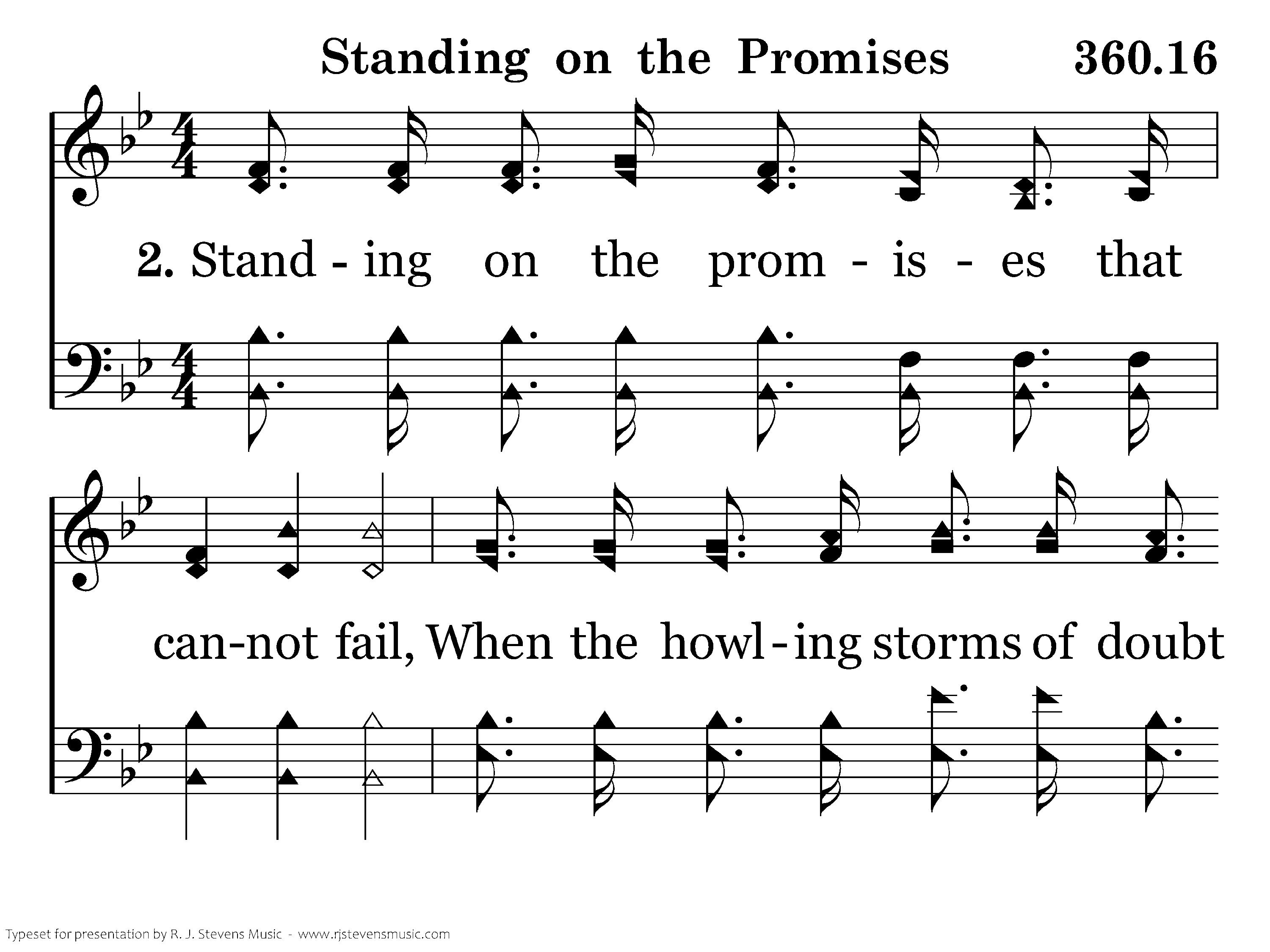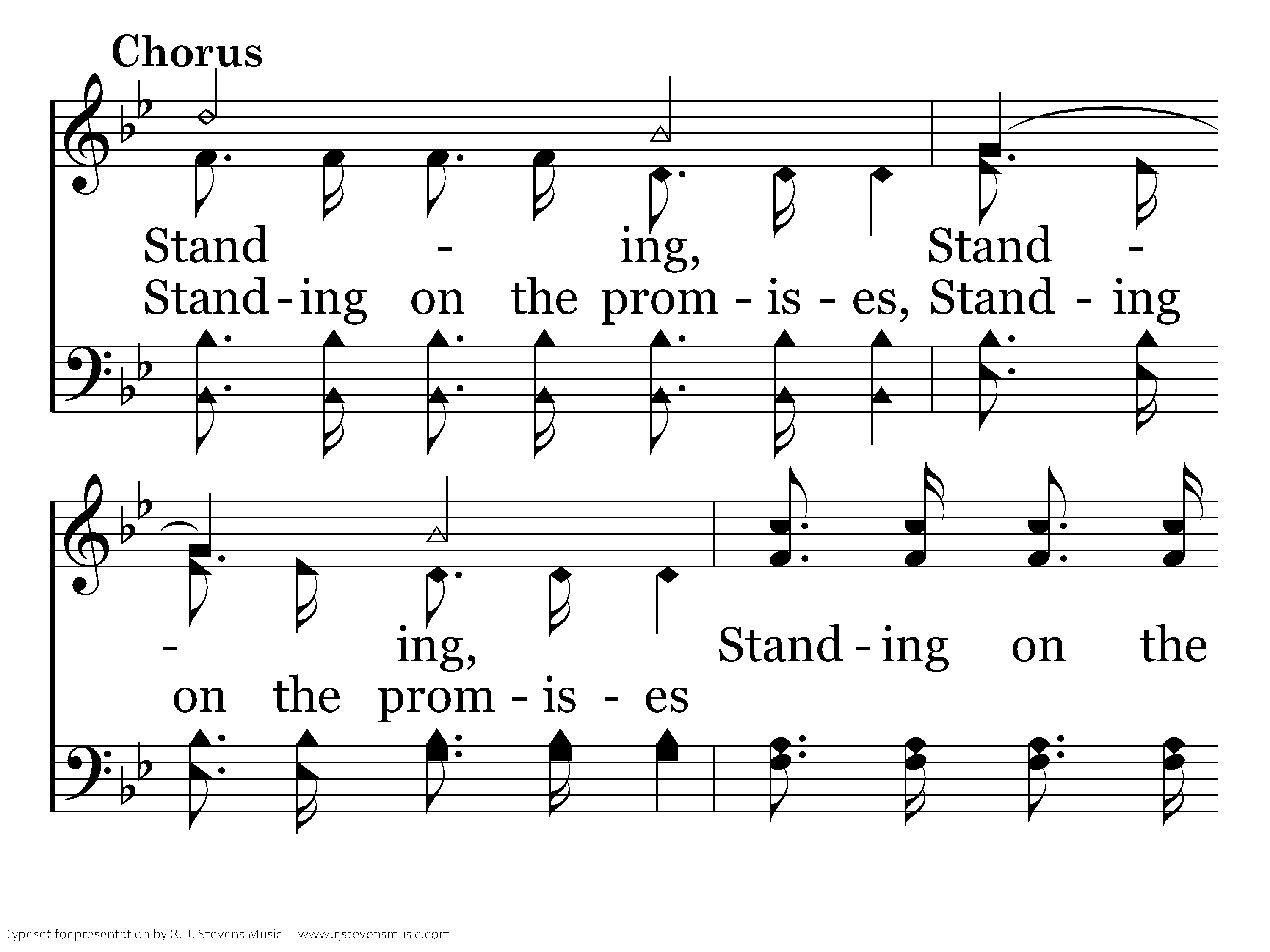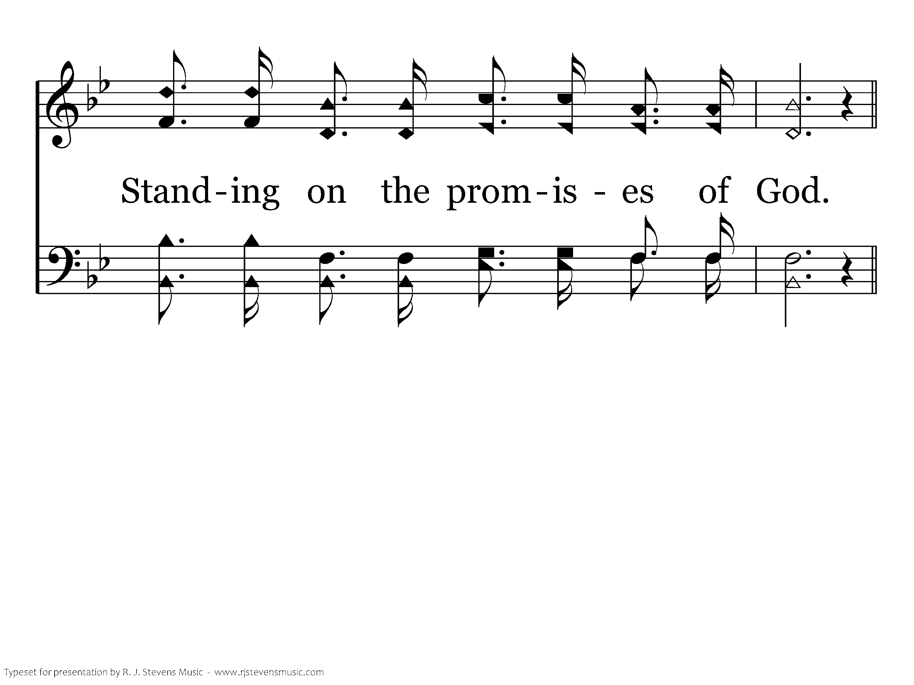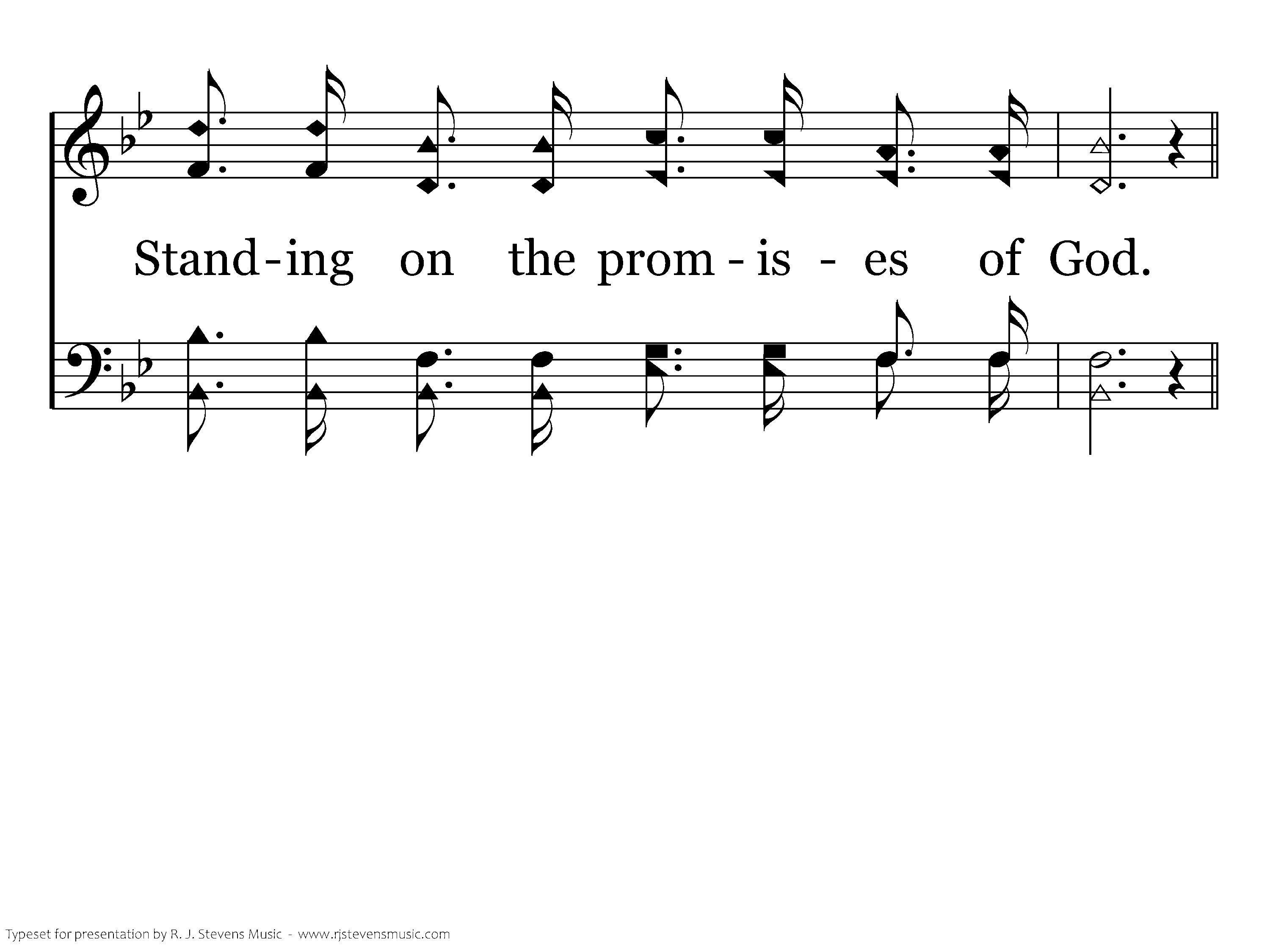 Standing on the promises of God. Standing, standing, Standing on the promises of God my Savior; Standing, standing, I'm standing on the promises of God.