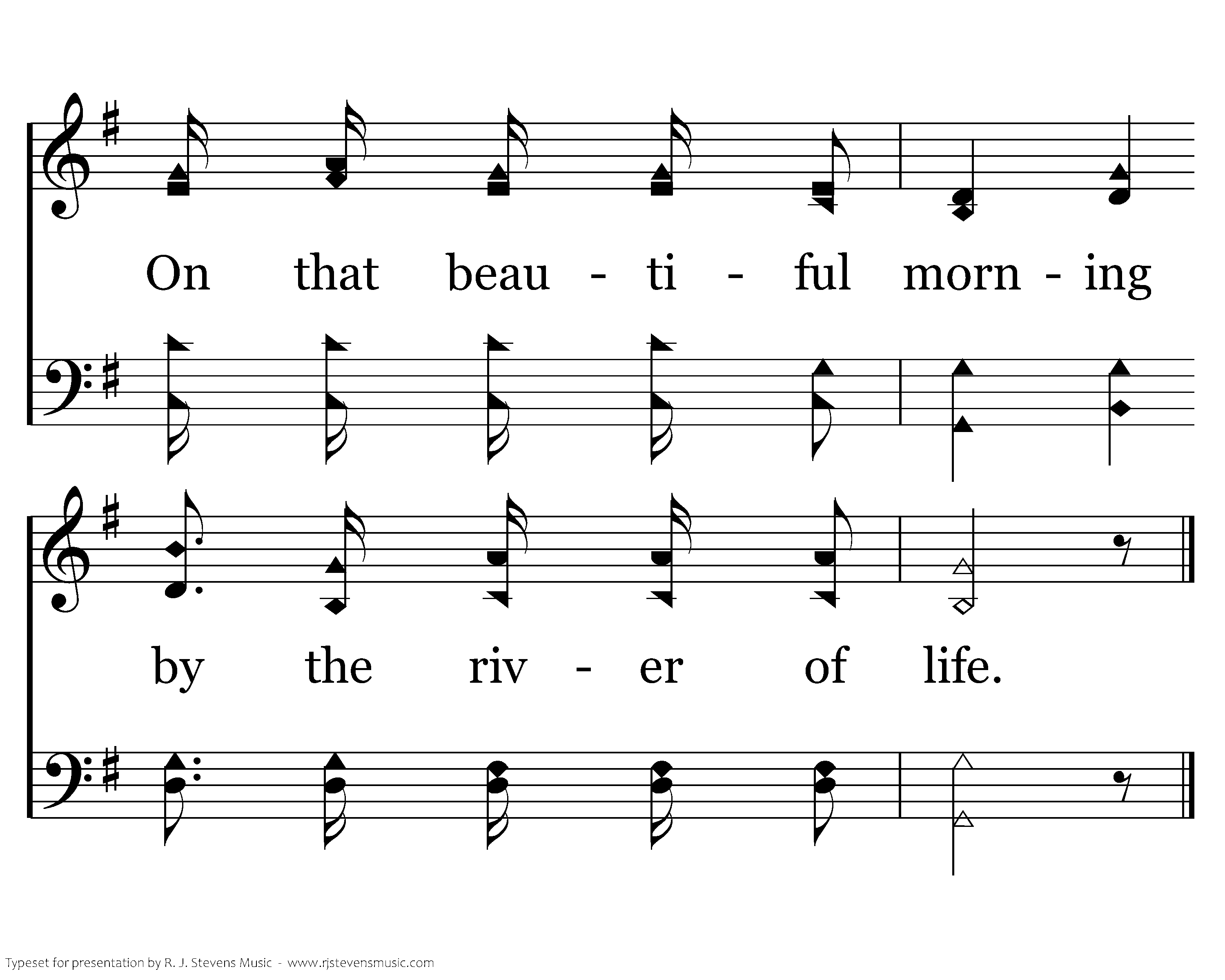 I want to meet you by that beautiful river, On that eternal morning in the sky, Where we'll live in peace thru endless ages, Where we'll never say goodbye. The prettiest robes and crowns we'll all be wearing In the city foursquare beyond this world of strife, And the prettiest song with angels we'll be singing On that beautiful morning by the river of life.