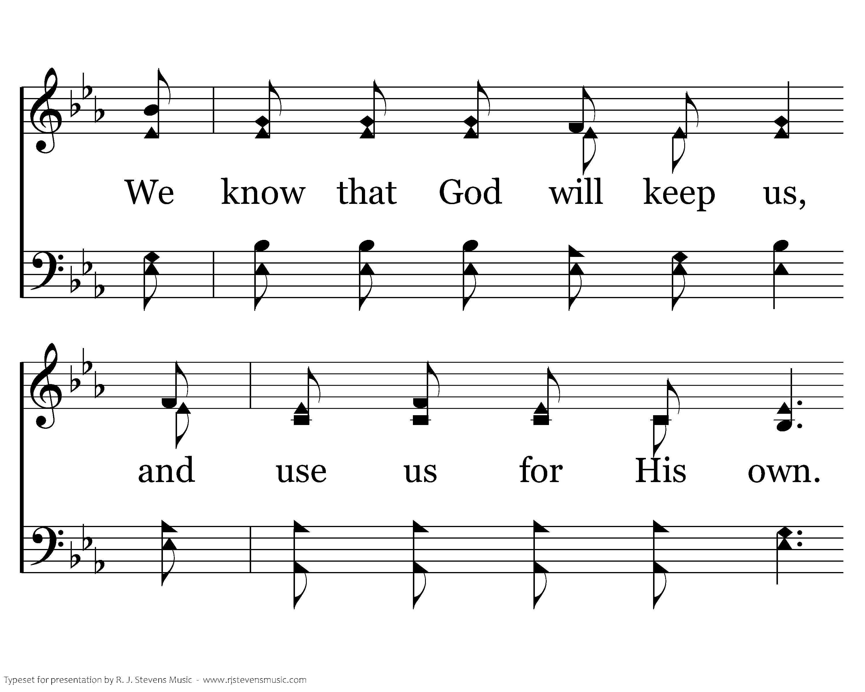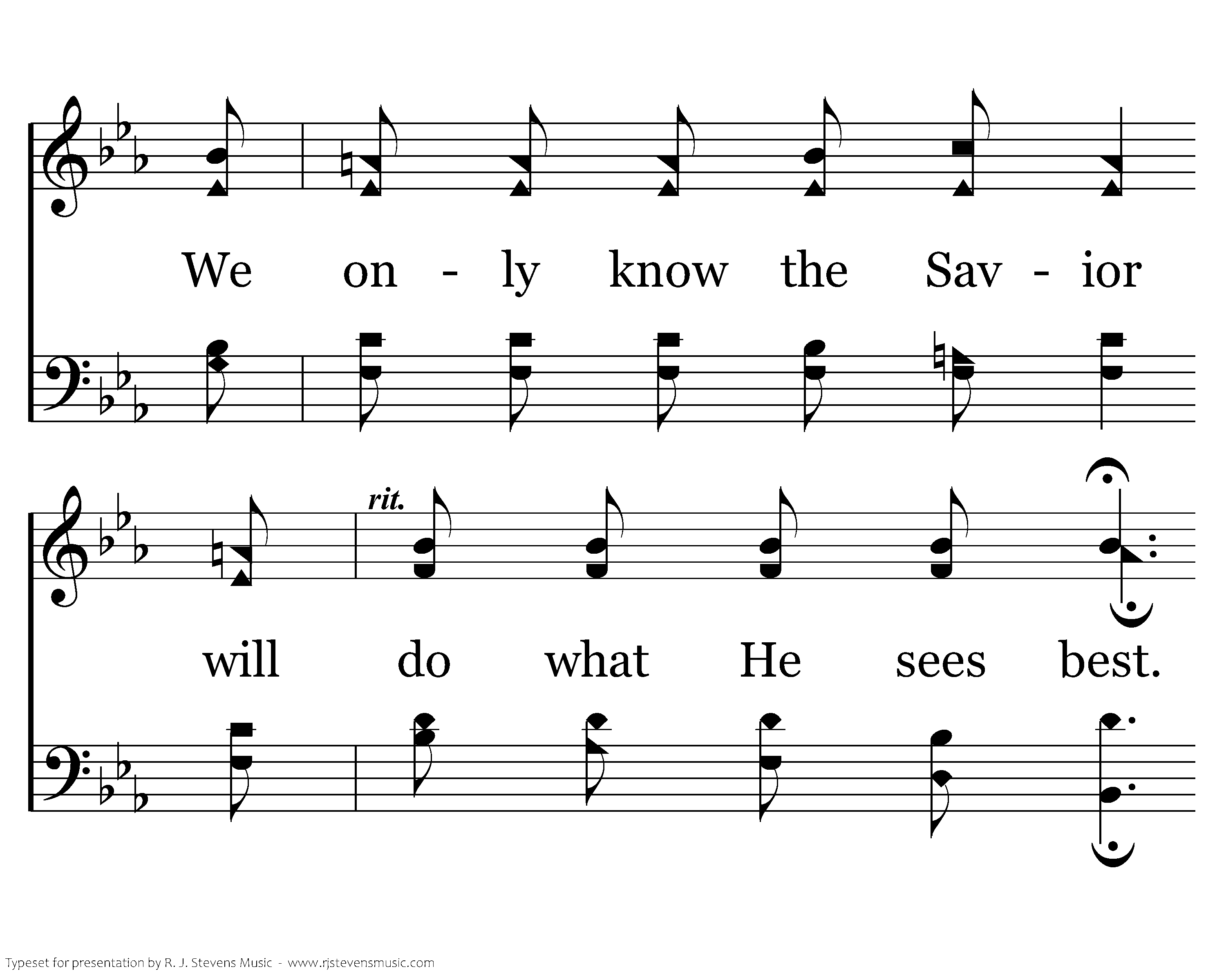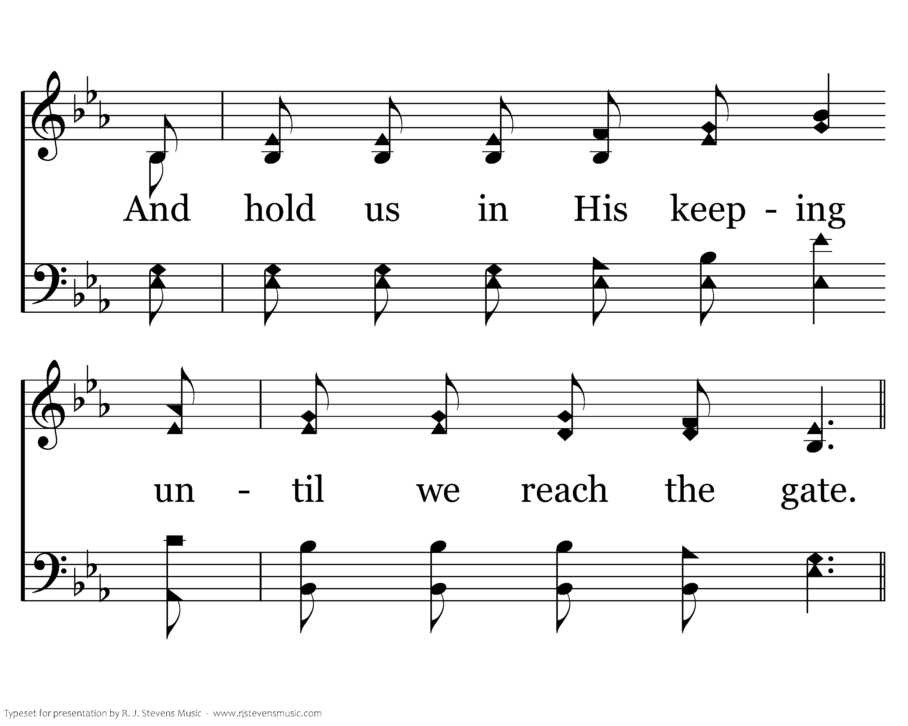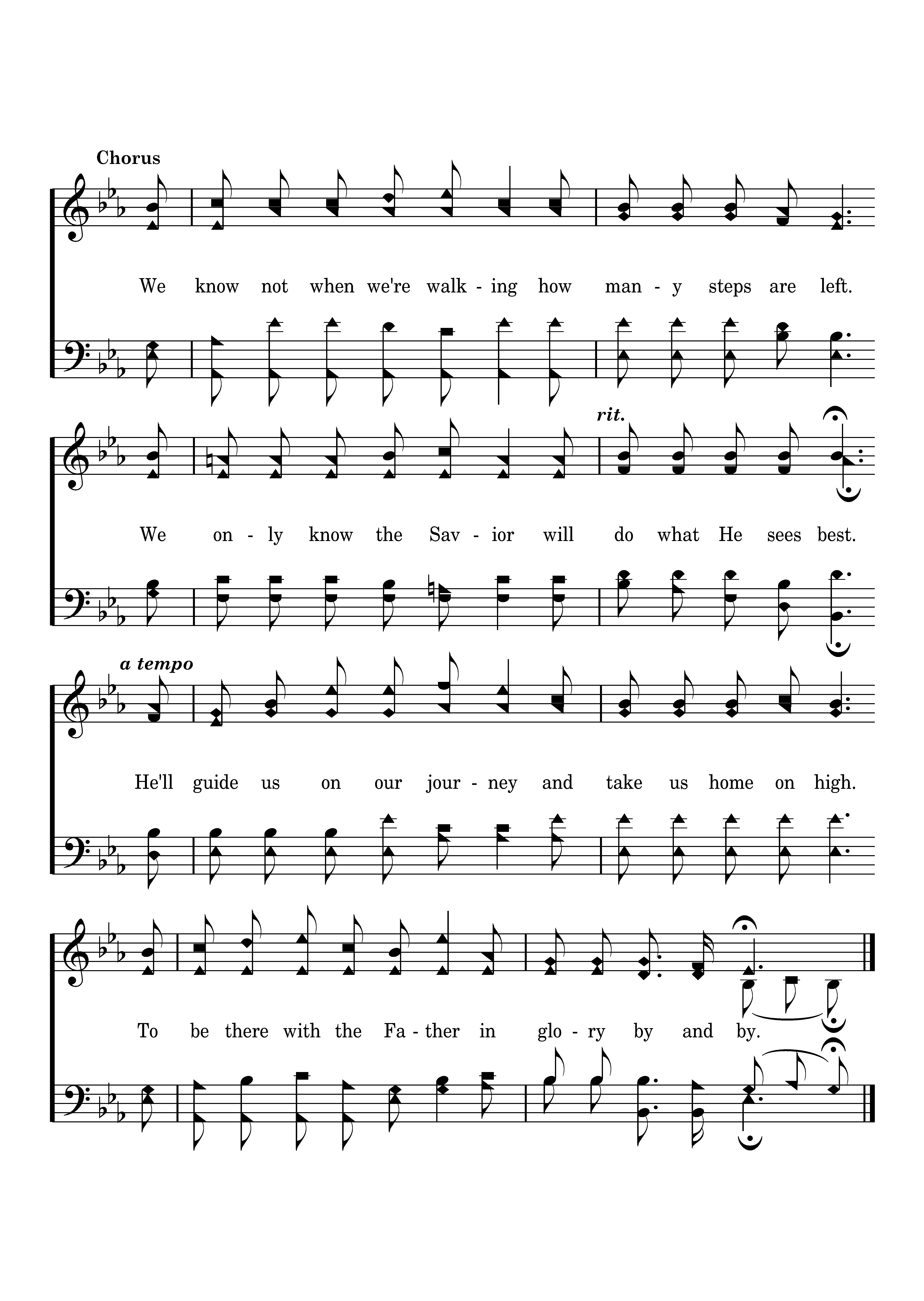 We know not when we're walking how many steps are left. We only know the Sav-ior will do what He sees best. He'll guide us on our journey and take us home on high. To be there with the Father in glory by and by.