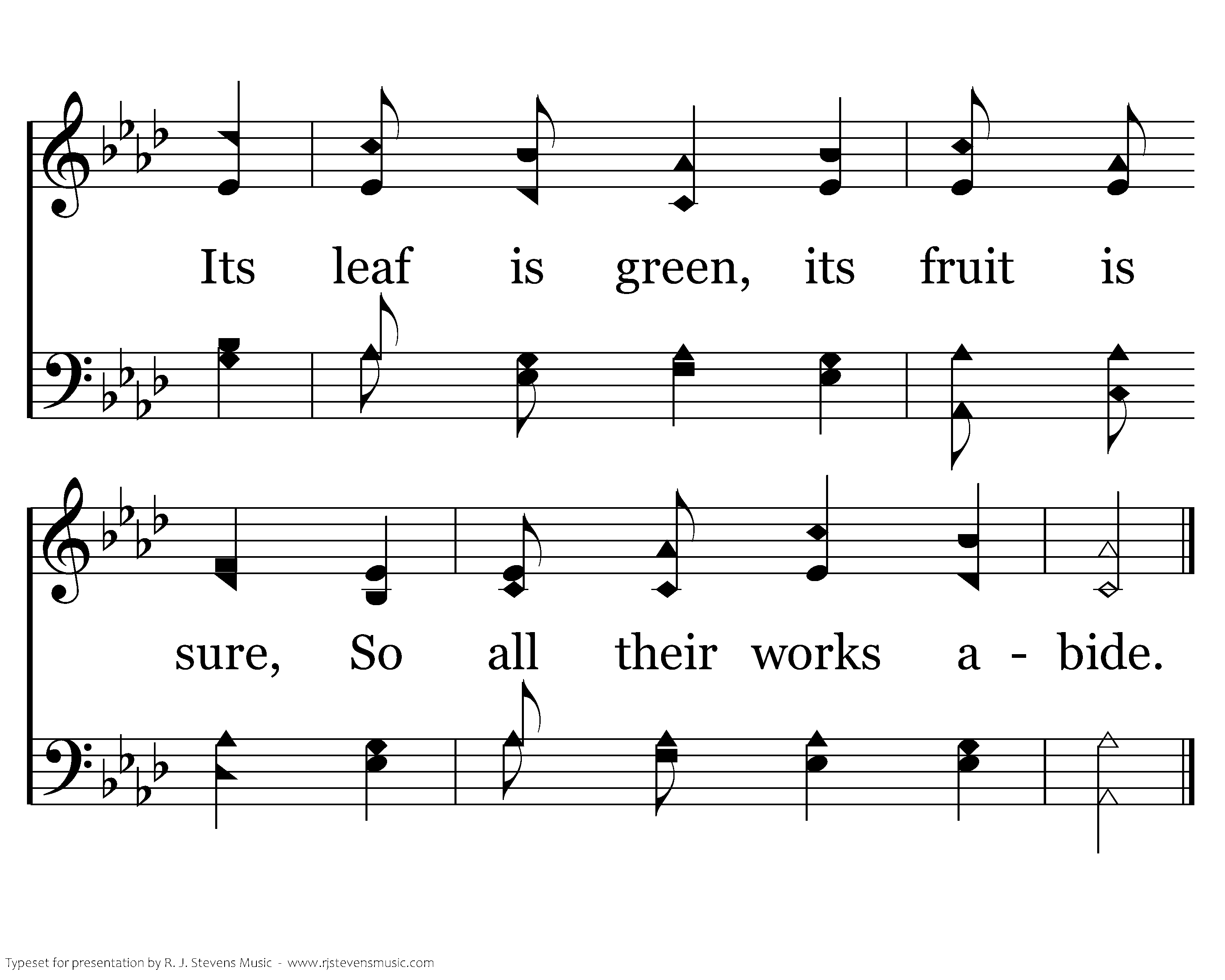 Their lives are nourished like a tree Set by the river's side; Its leaf is green, its fruit is sure, So all their works abide.