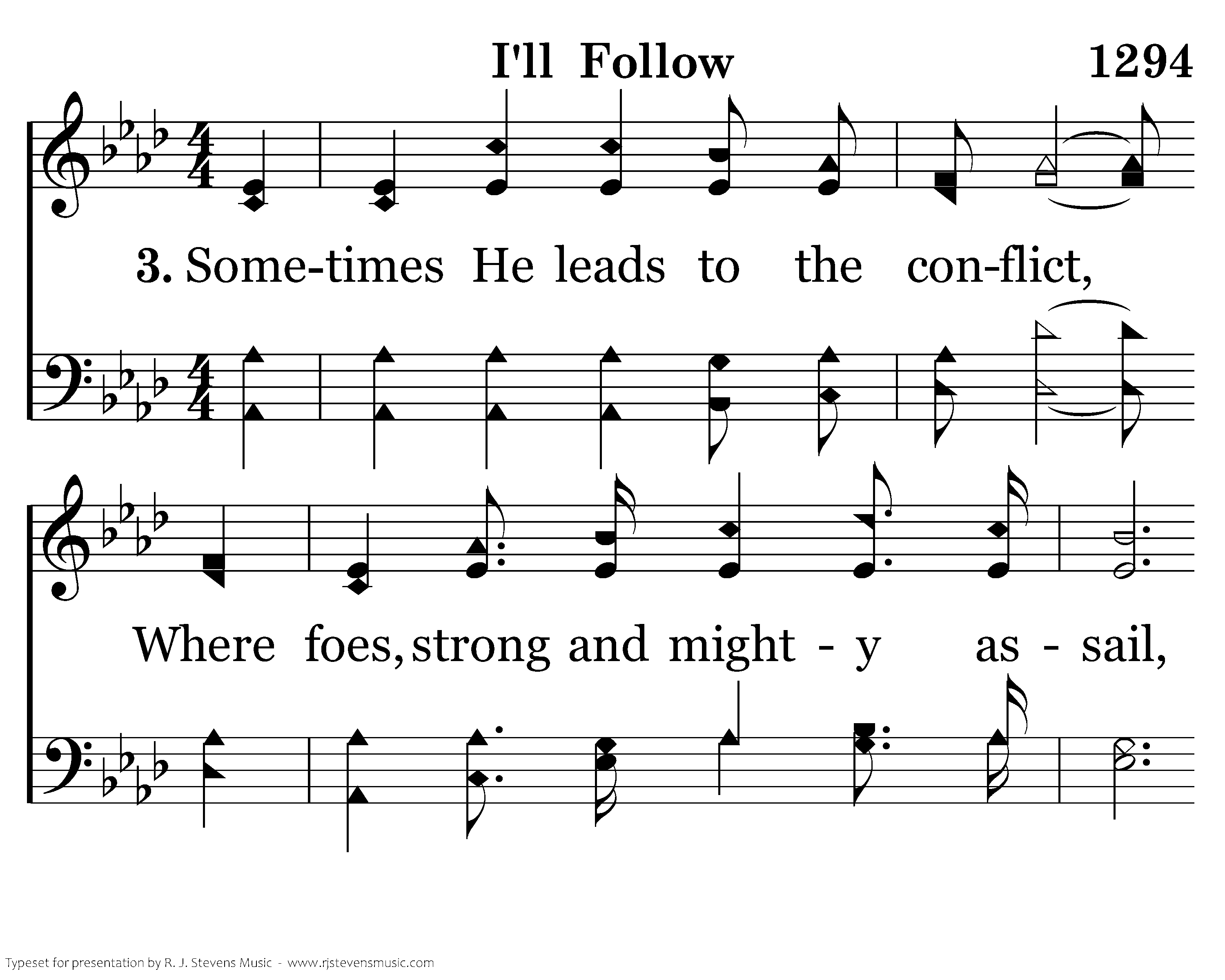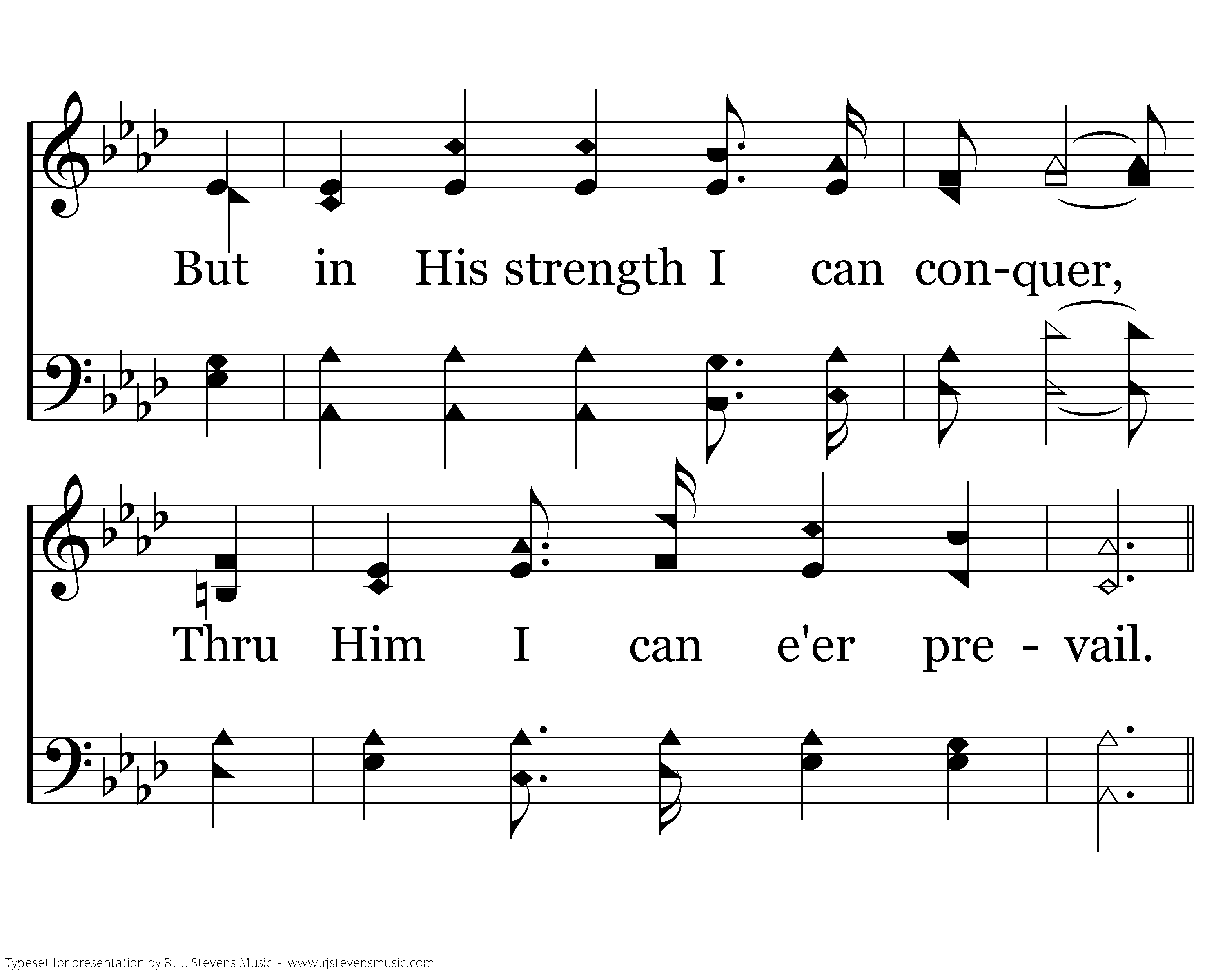 Sometimes He leads to the conflict, Where foes, strong and mighty assail, But in His strength I can conquer, Thru Him I can e'er prevail.
