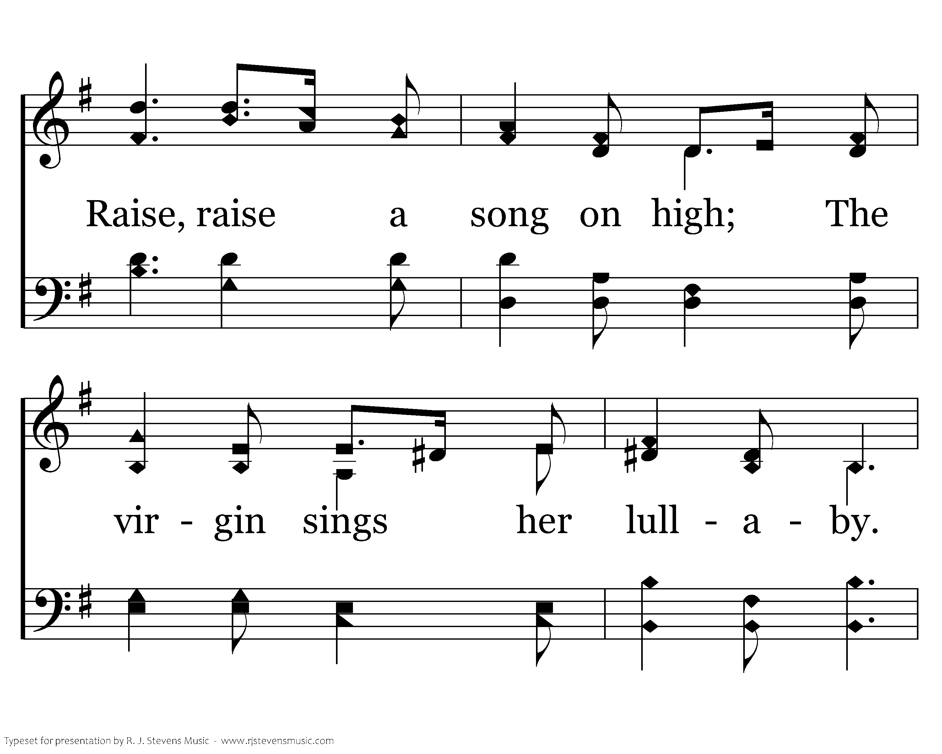 So bring Him incense, gold and myrrh, Come peasant, king, to own Him. The King of kings salvation brings; Let loving hearts enthrone Him. Raise, raise a song on high; The virgin sings her lullaby. Joy, Joy, for Christ is born, The babe, the son of Mary.