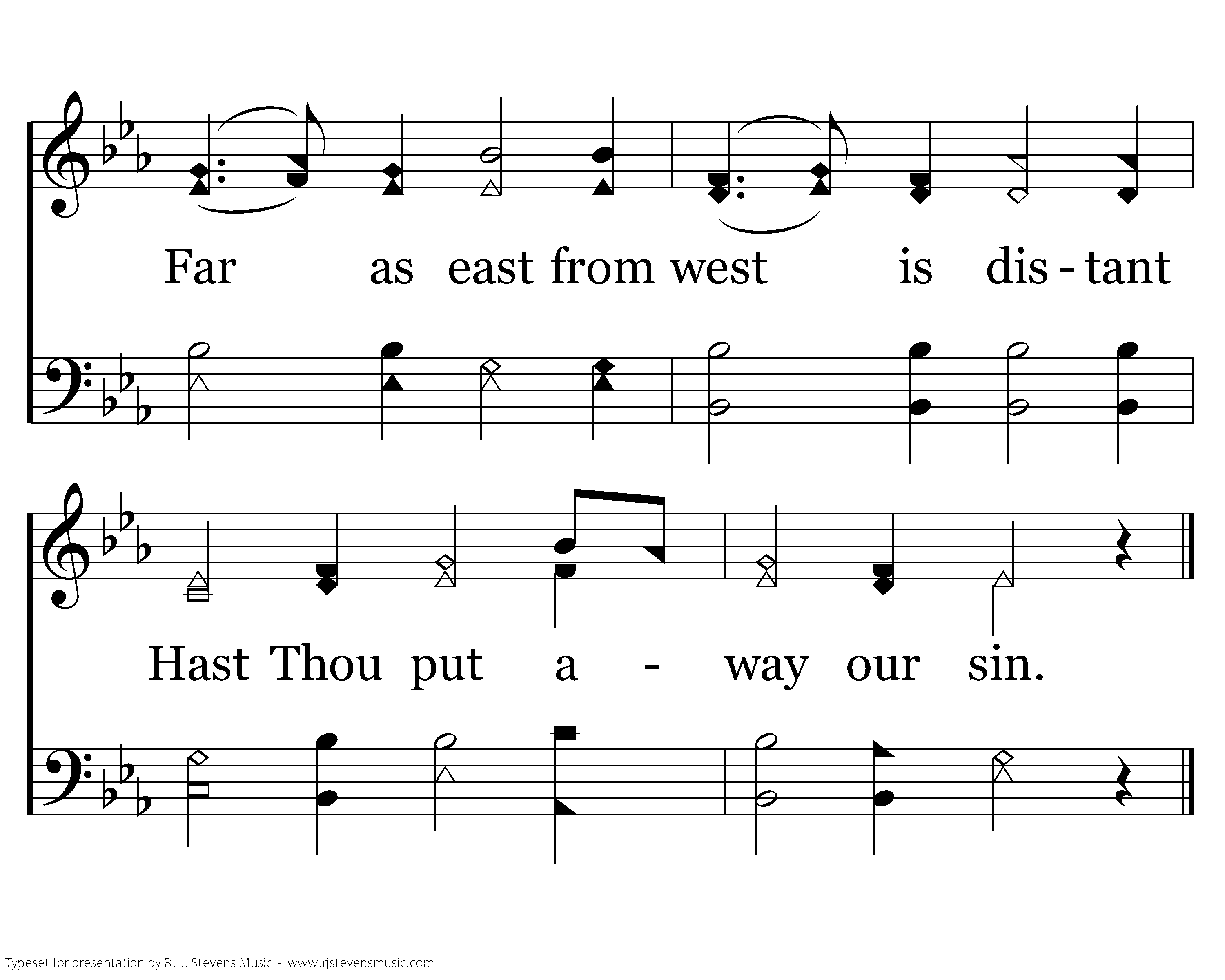 Thou art merciful, O Father, Full of pity, love and grace; Thou wilt not forever chasten, Nor in anger hide Thy face. High as heaven, vast and boundless, Hath Thy lovingkindness been; Far as east from west is distant Hast Thou put away our sin.