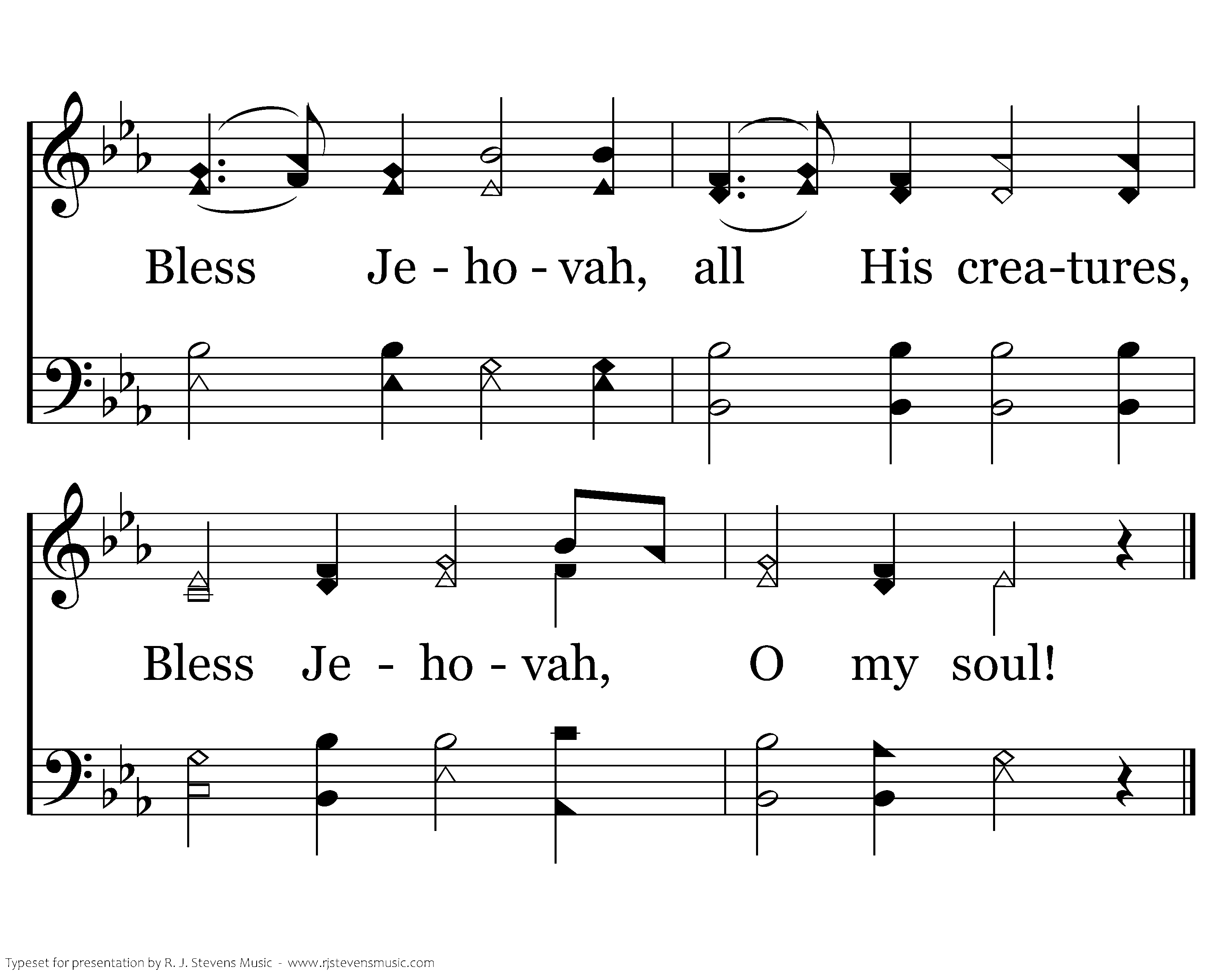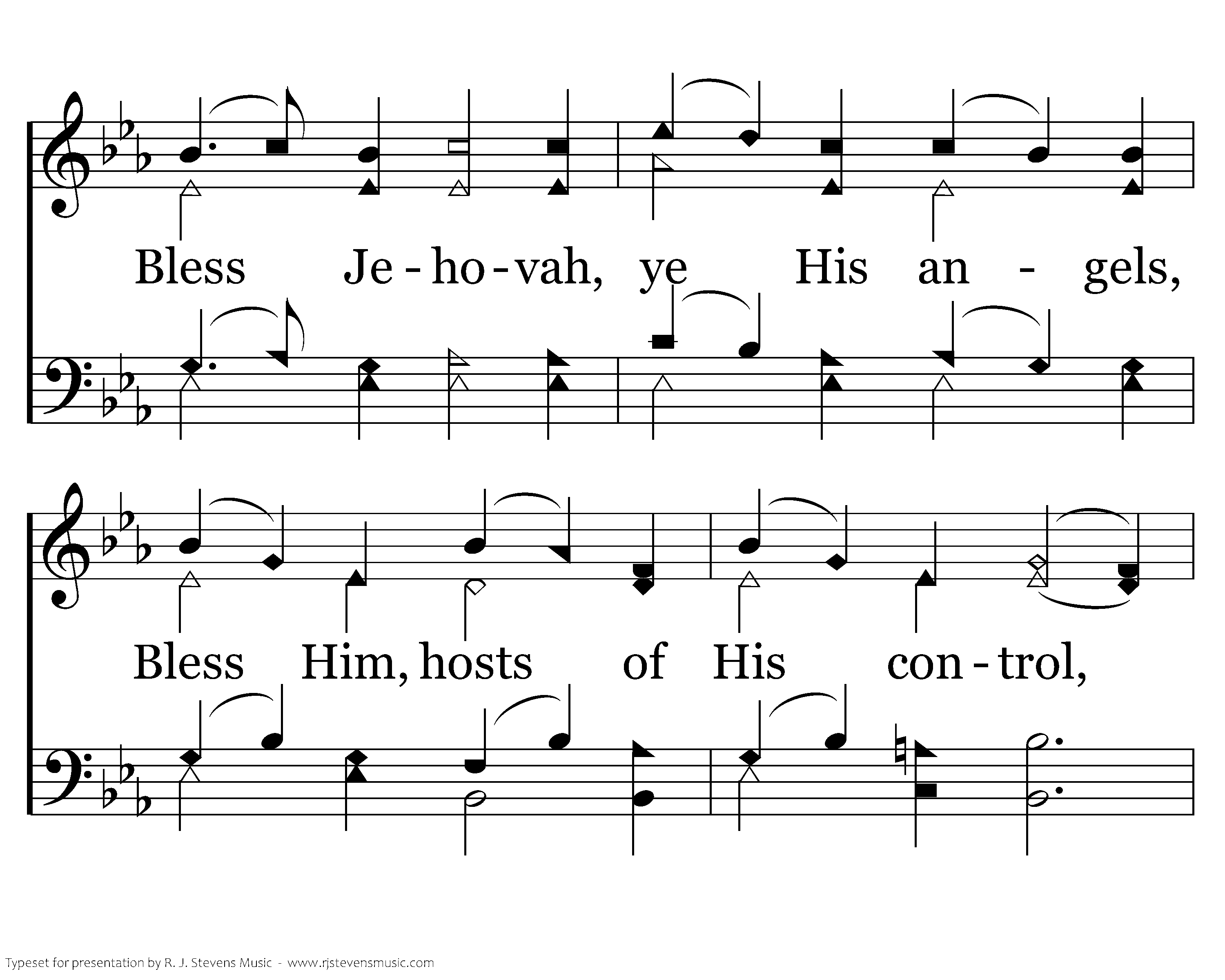 In the heavens, well established, Is His universal throne; For His kingdom ruleth ever, And His sway all kings shall own. Bless Jehovah, ye His angels, Bless Him, hosts of His control, Bless Jehovah, all His creatures, Bless Jehovah, O my soul!
