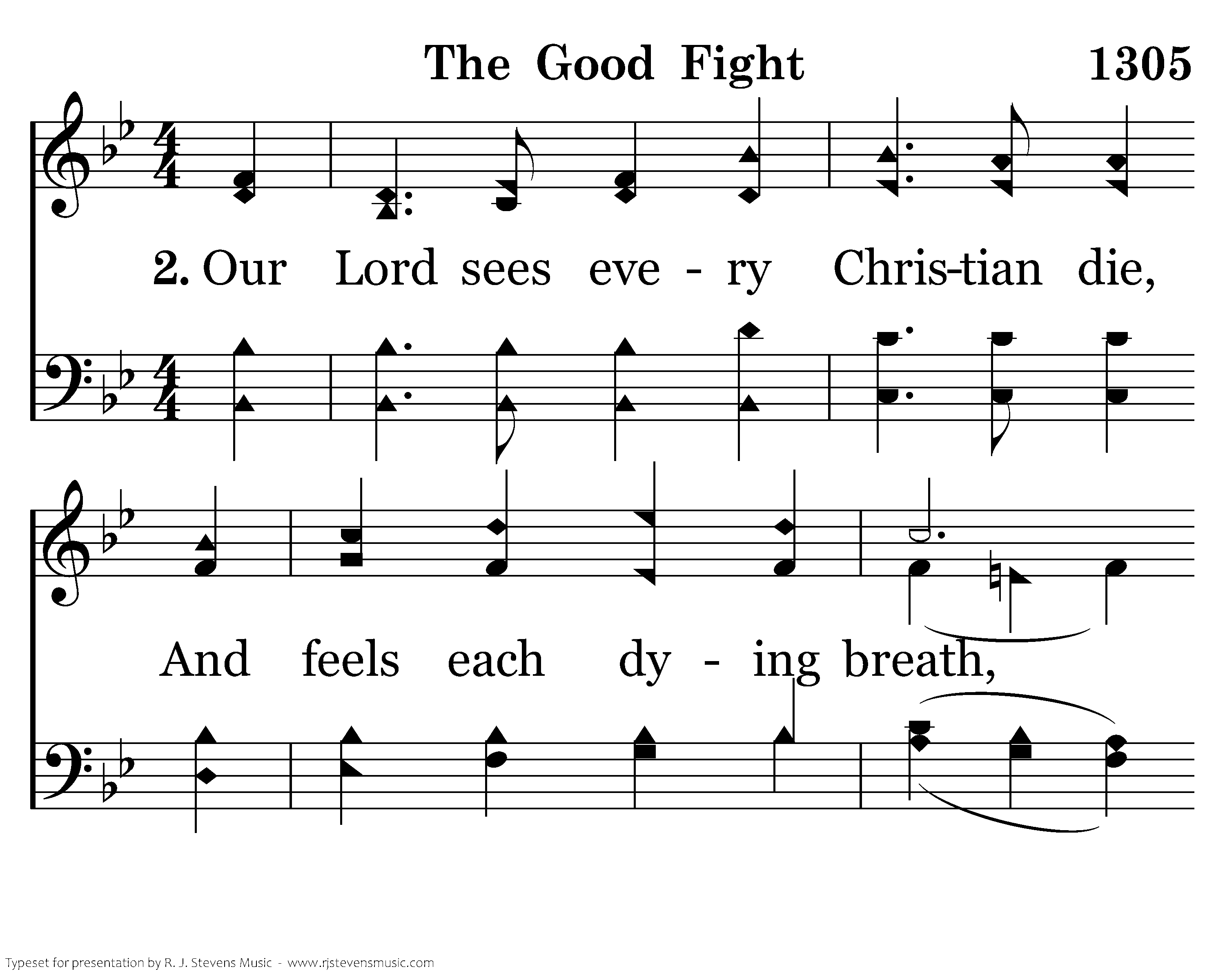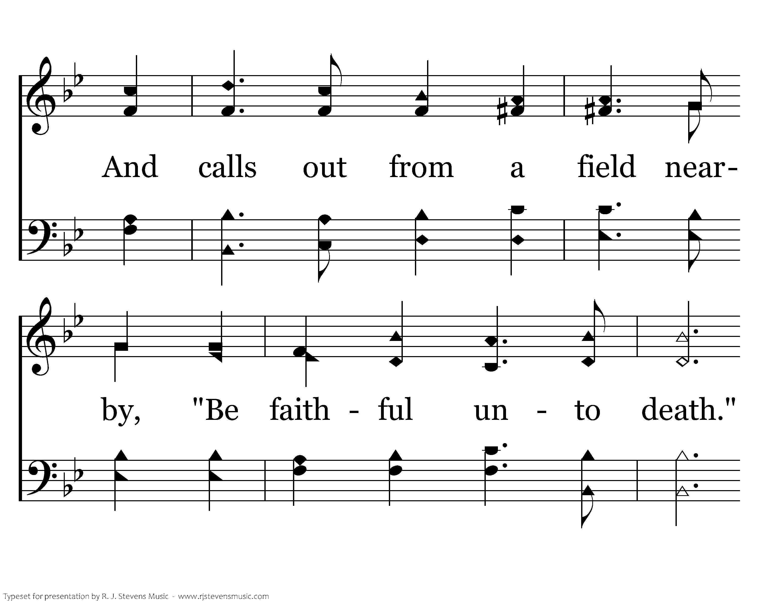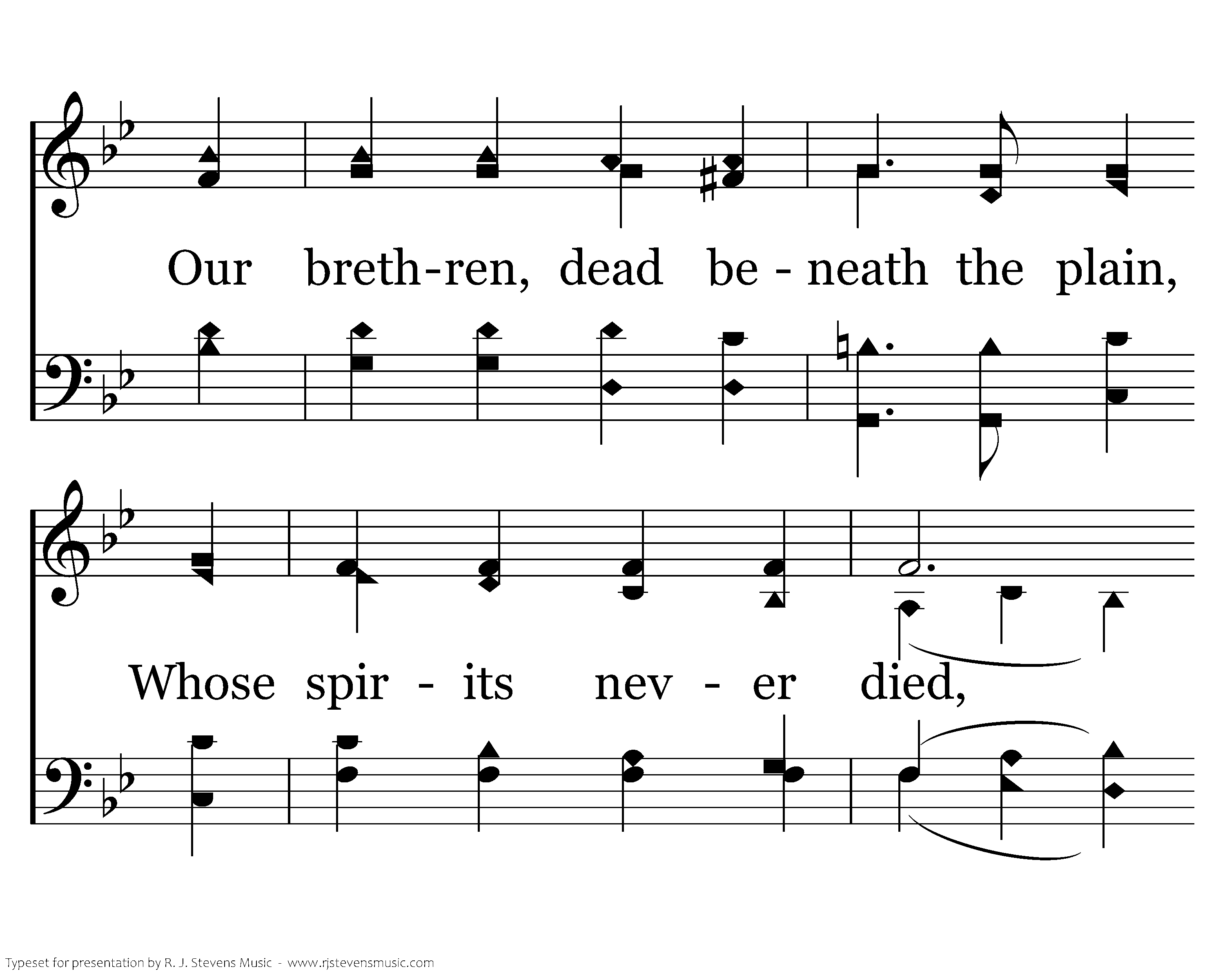 Our Lord sees every Christian die, And feels each dying breath, And calls out from a field nearby, "Be faithful unto death." Our brethren, dead beneath the plain, Whose spirits never died, Rise up to march and shout again, "O Christ, be glorified."