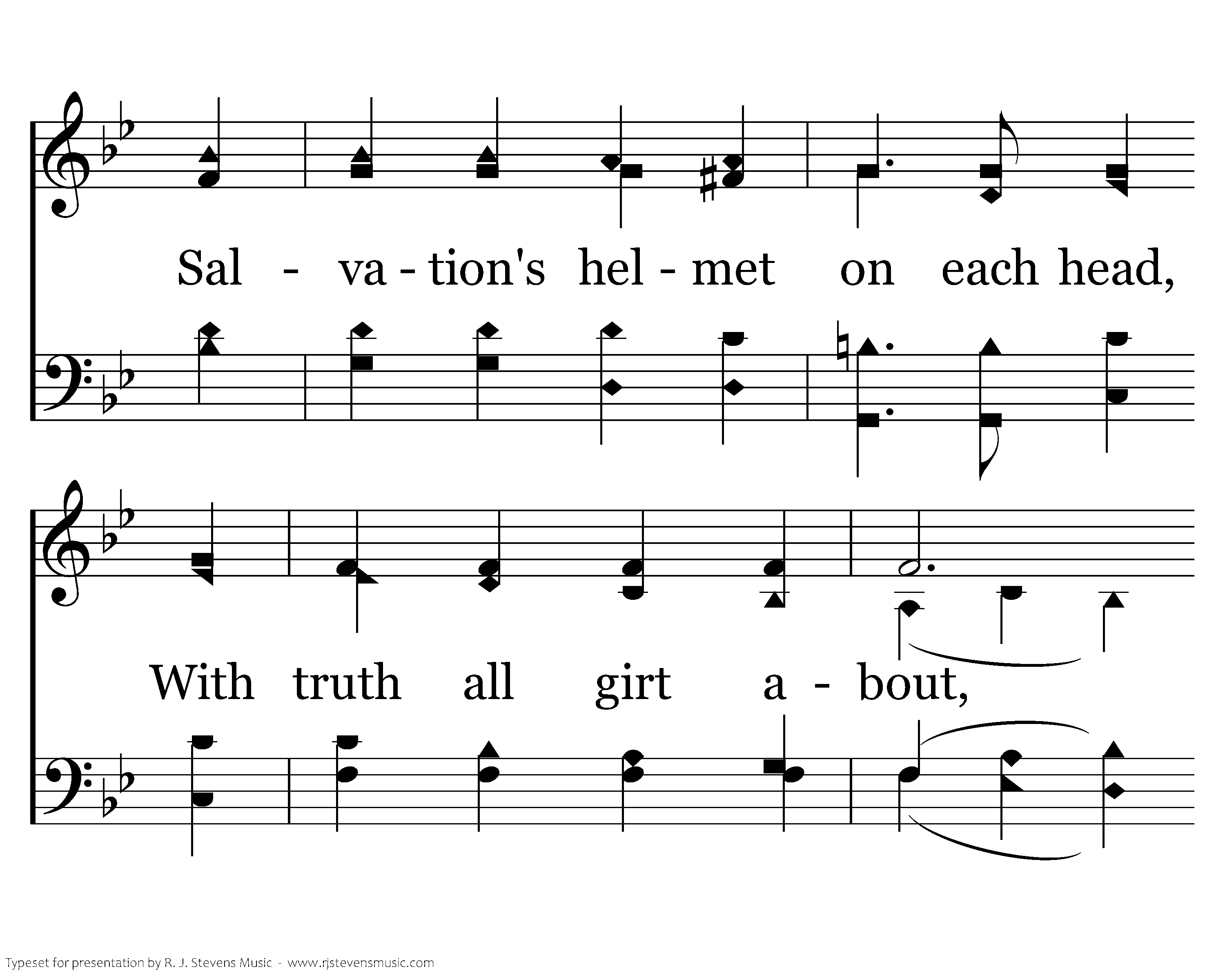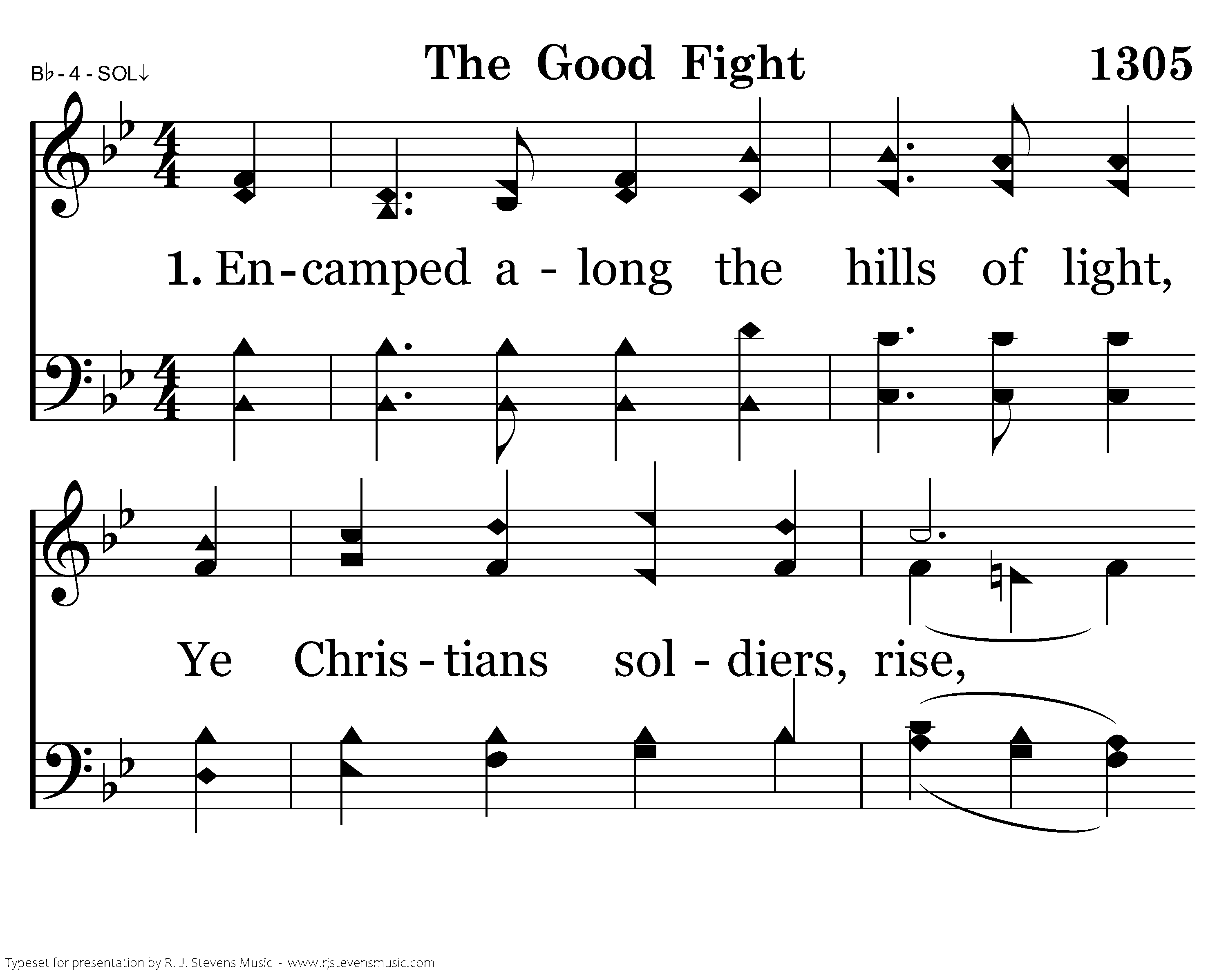 Encamped along the hills of light, Ye Christians soldiers, rise, And press the battle ere the night Shall veil the glowing skies. Salvation's helmet on each head, With truth all girt about, The earth shall tremble 'neath our tread And echo with our shout.