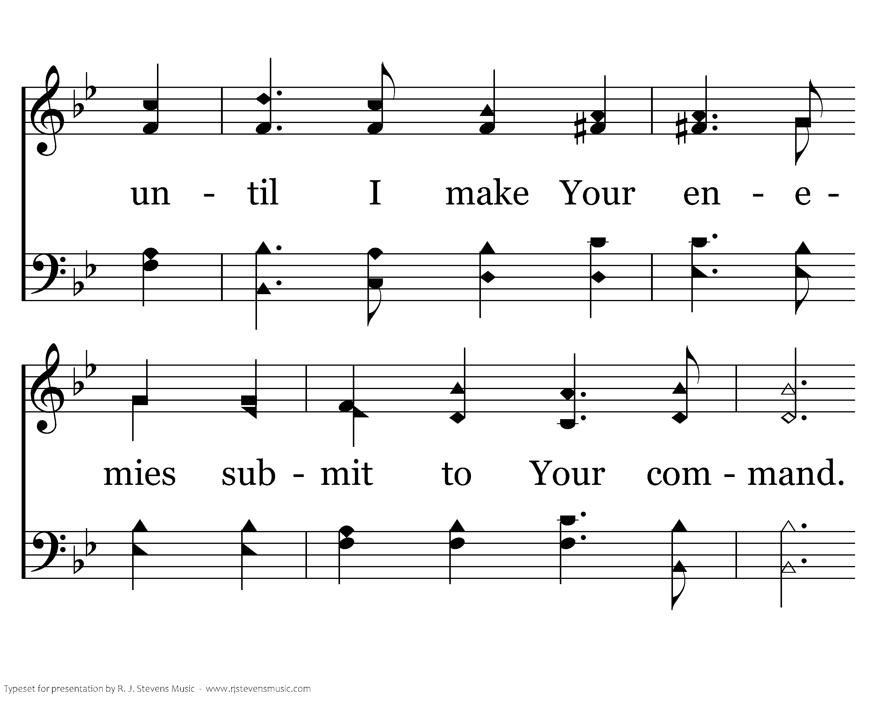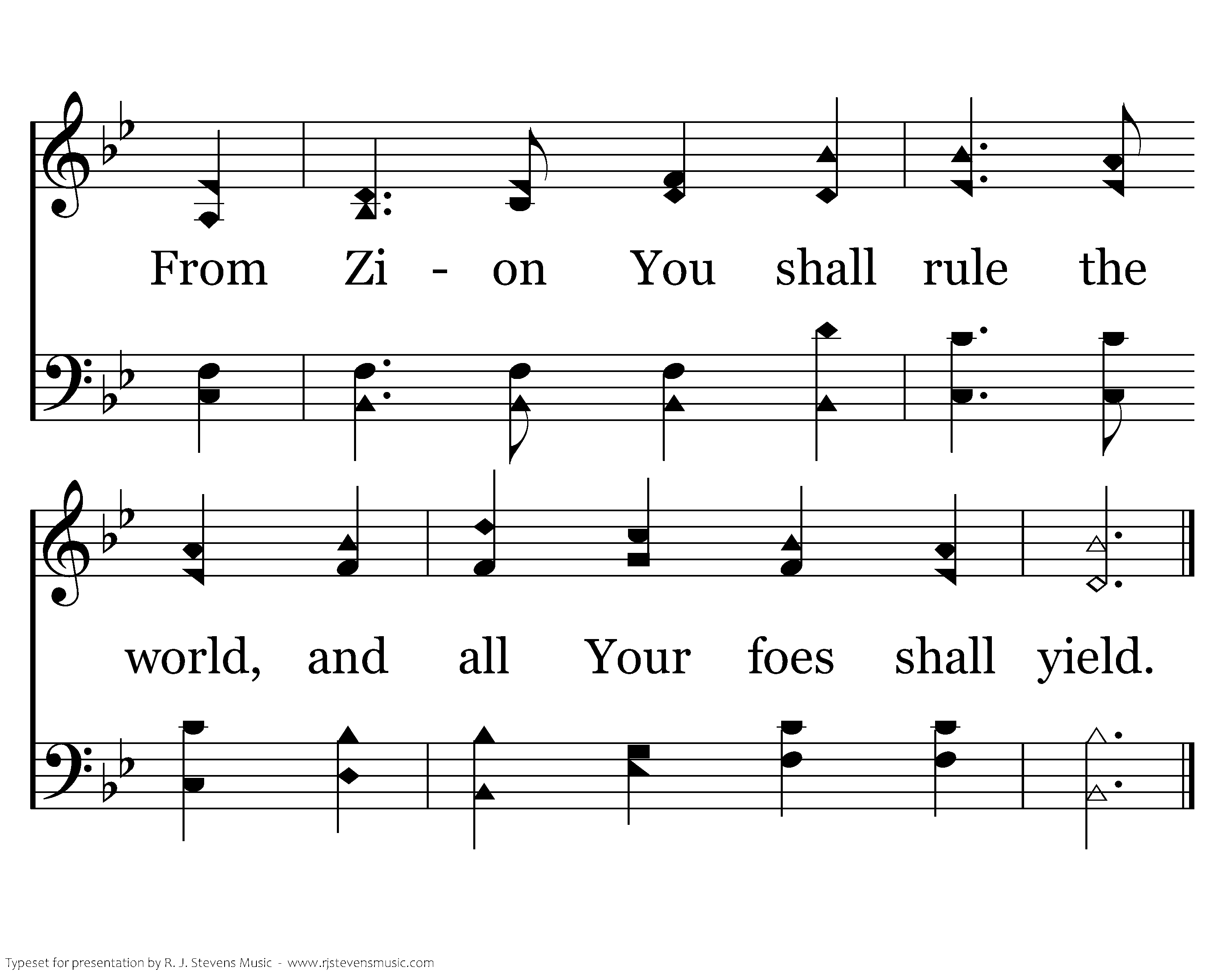 The LORD unto my Lord has said, "Sit here at my right hand until I make Your enemies submit to Your command. A scepter prospered by the LORD Your mighty hand shall wield; From Zion You shall rule the world, and all Your foes shall yield.