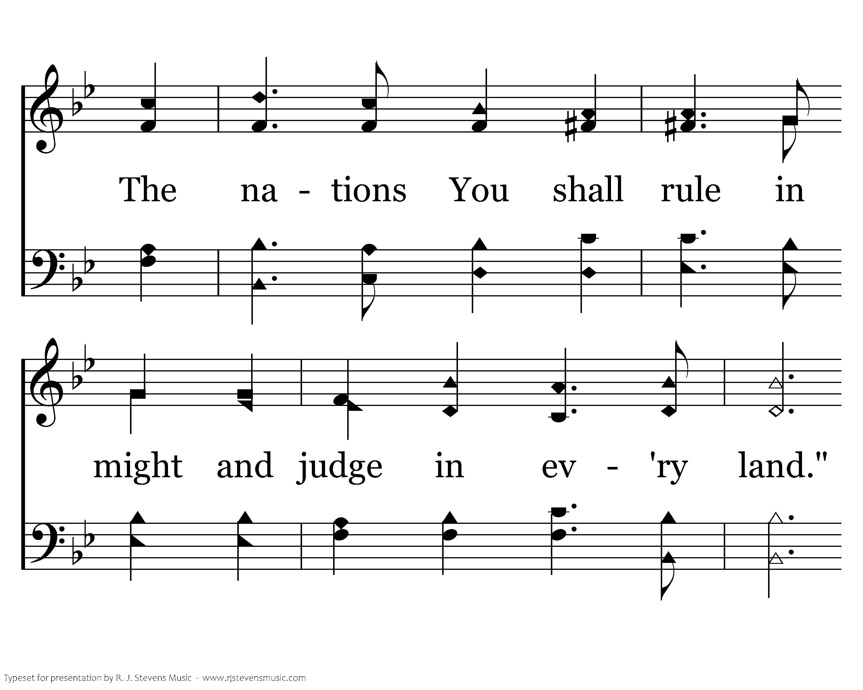 "You shall subdue the kings of earth, with God at Your right hand; The nations You shall rule in might and judge in ev'ry land." The Lord, refreshed by living streams, shall neither faint nor fall, And He shall be the glorious head, exalted over all.