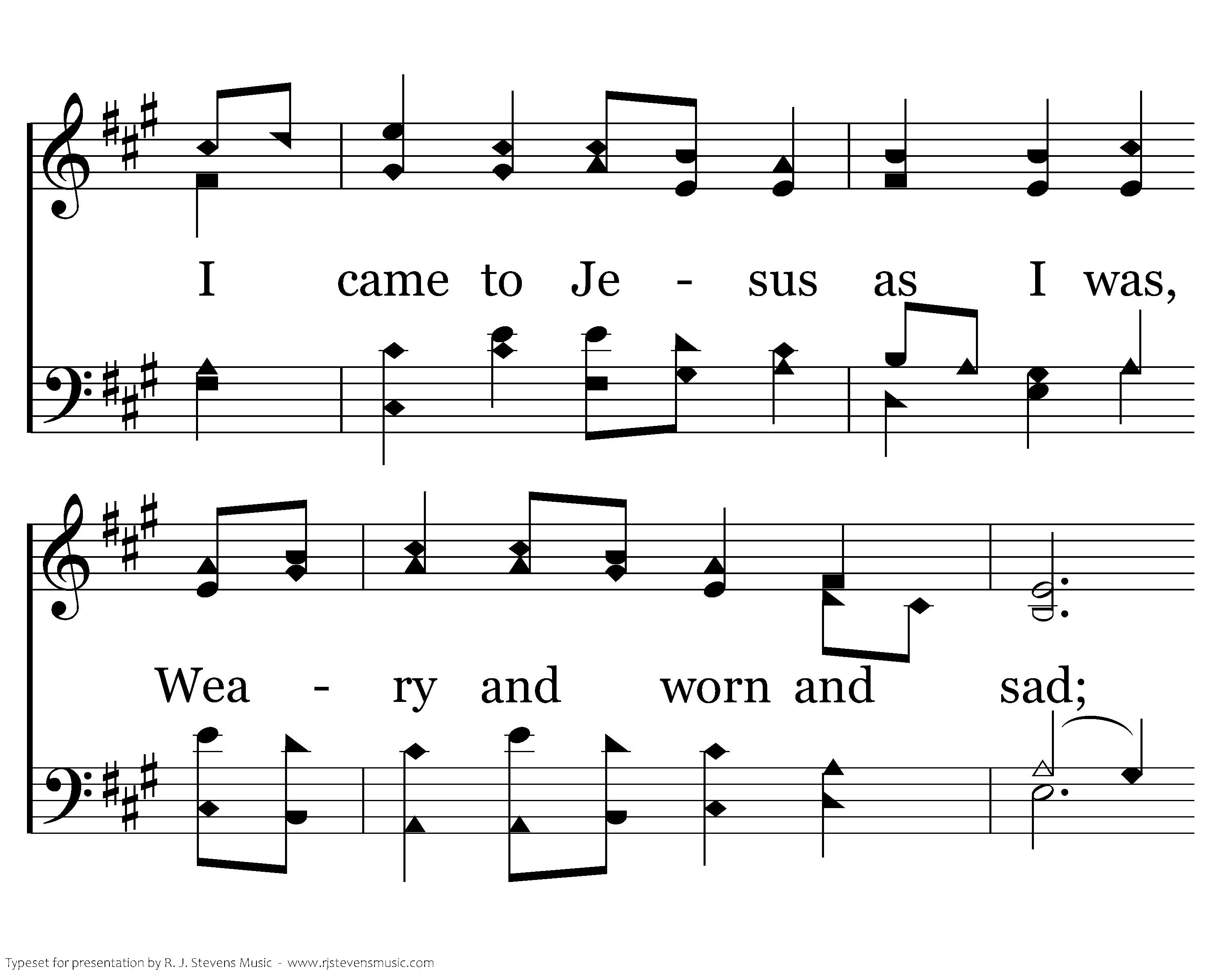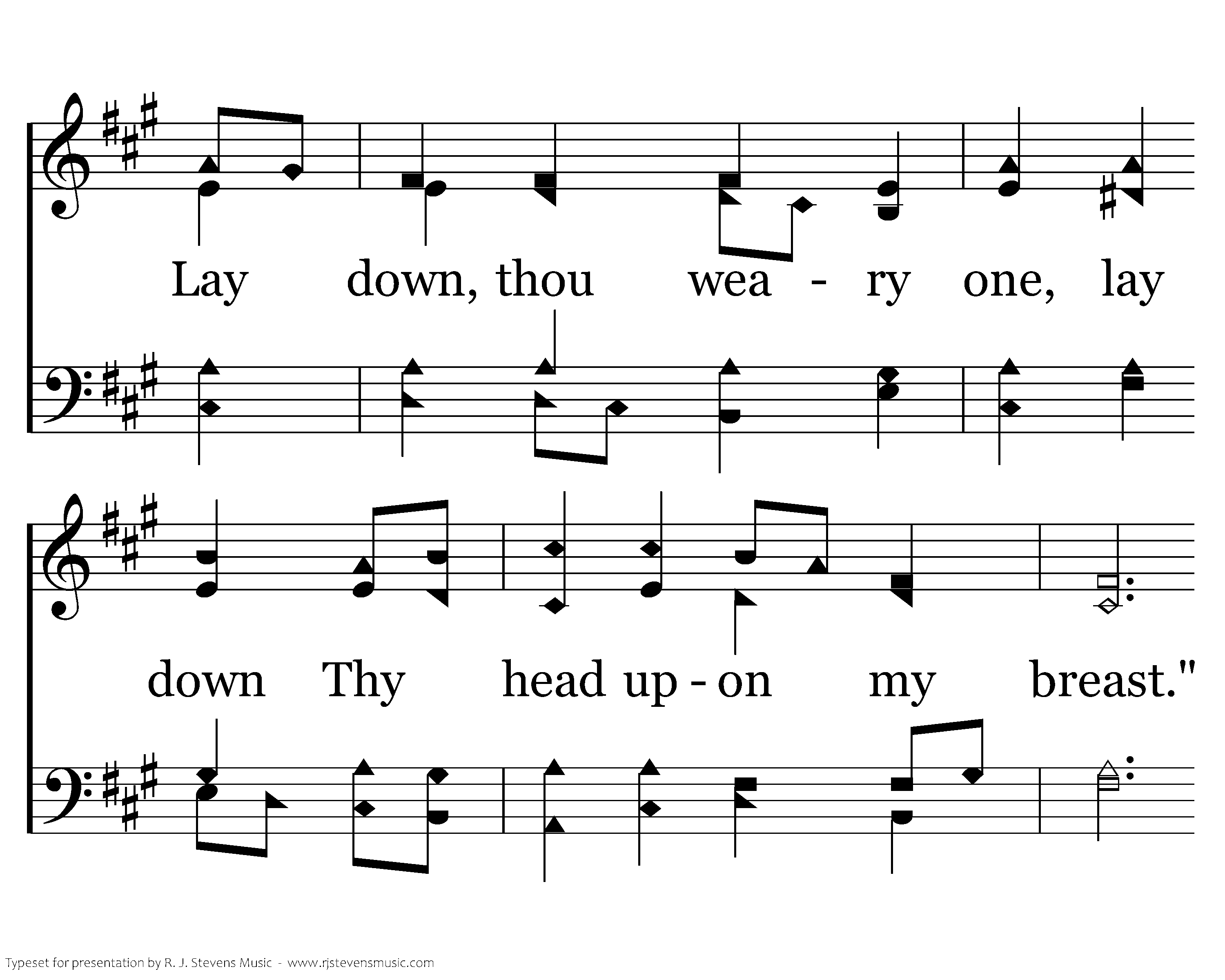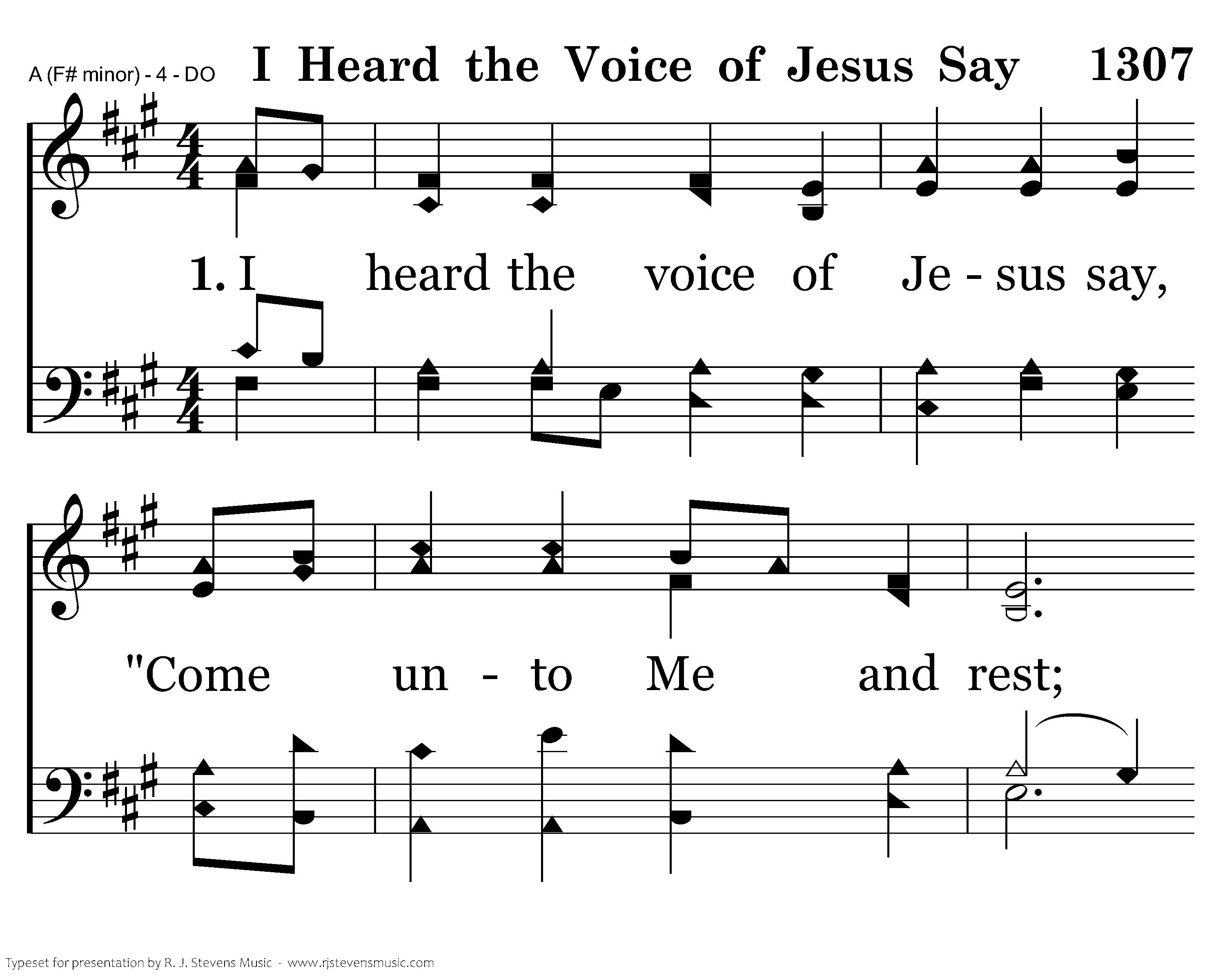 I heard the voice of Jesus say, "Come unto Me and rest; Lay down, thou weary one, lay down Thy head upon my breast." I came to Jesus as I was, Weary and worn and sad; I found in Him a resting place, And He has made me glad.